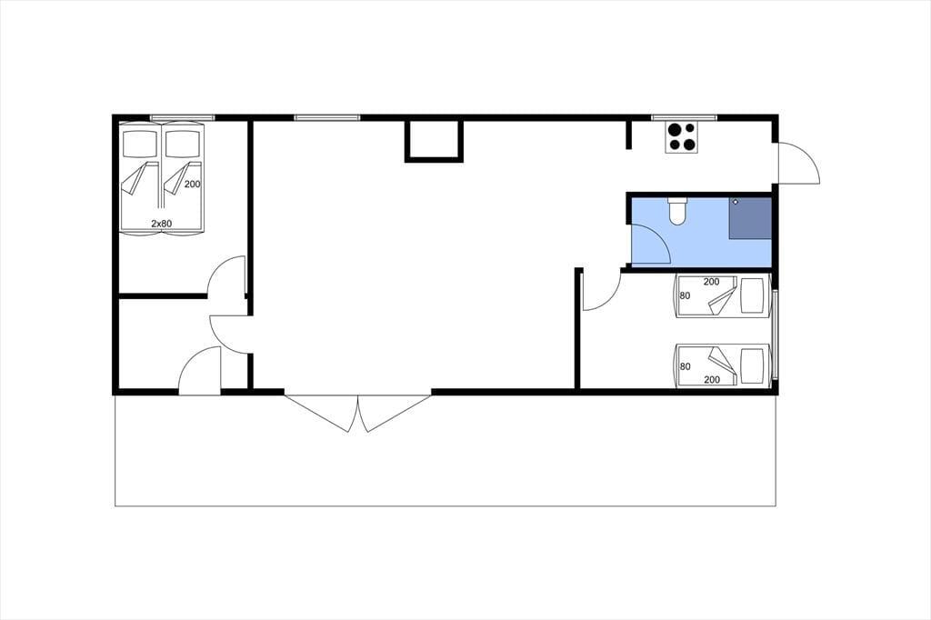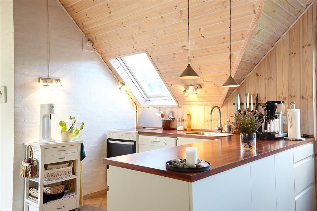 Dette dejlige og veldisponerede sommerhus byder sig til med værelser i den ene side og åbent køkken og stue i den anden side. Her har du plads til storfamilien, strikke- eller kortklubben, bare nogle gode venner eller familien på fire og et hold bedsteforældre. Fra det åbne køkken kan du nemt servere måltiderne til spisebordet lige ved siden af. Fra spisebordet kan I følge med i naturen og livet i haven lige uden for vinduet. Bagefter kan I drikke the eller kaffe fra sofaen ved døren til den sydvendte terrasse, og når mørket falder på, er der dejlige rummelige værelser i den anden fløj modsat stuen. De skrå vægge og brændeovnen, vil skabe den helt rette sommerhusstemning.