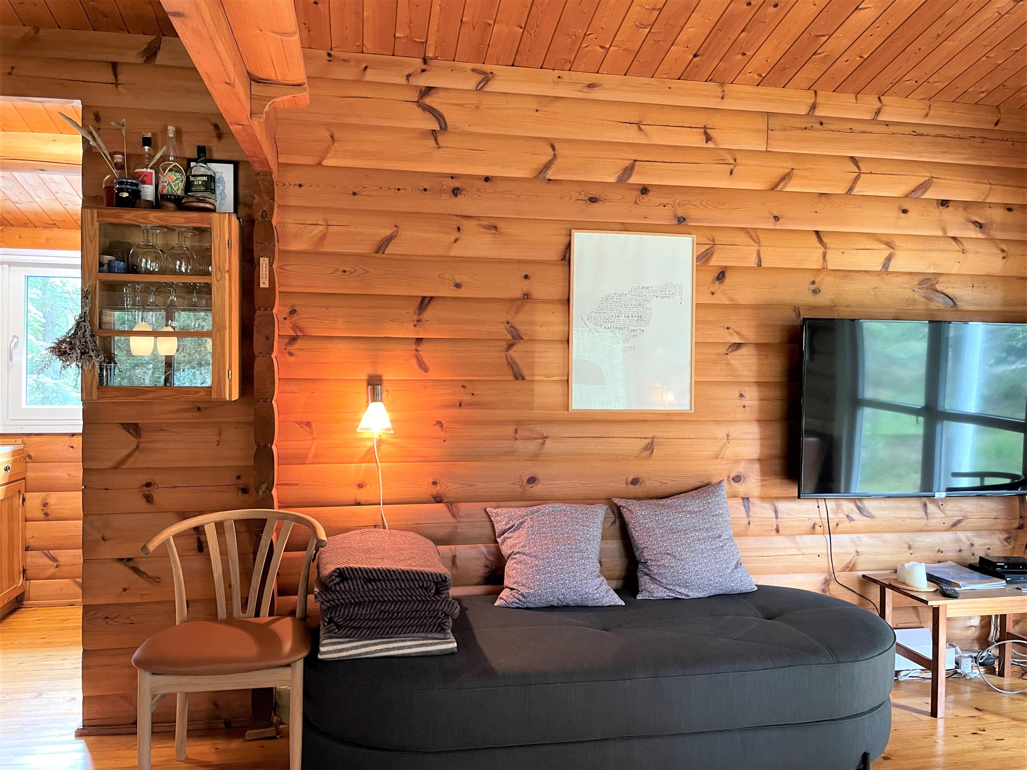 Hyggeligt feriehus i fjeldhyttestil nær strand og Østerby Havn med brændeovn og varmepumpe.