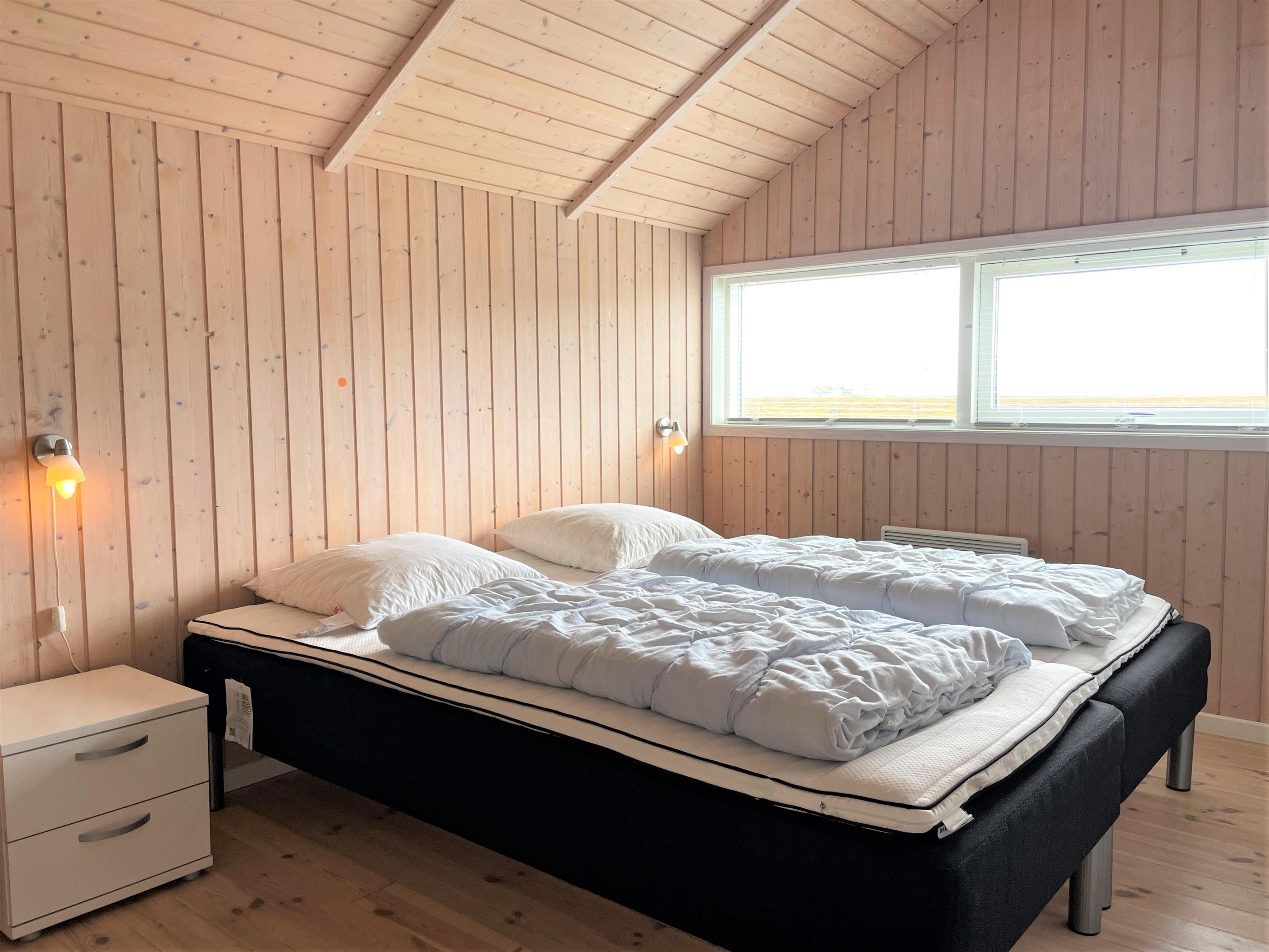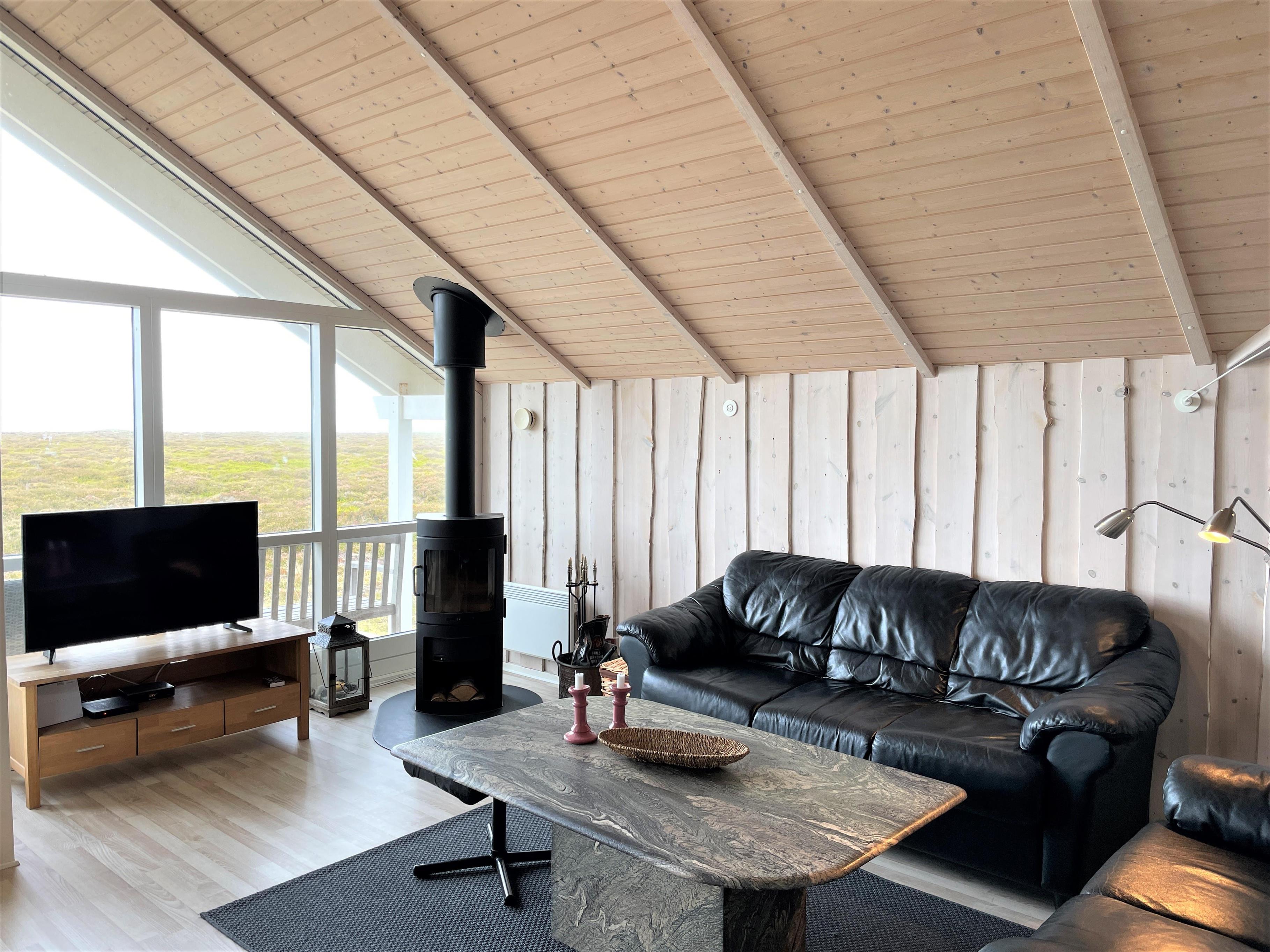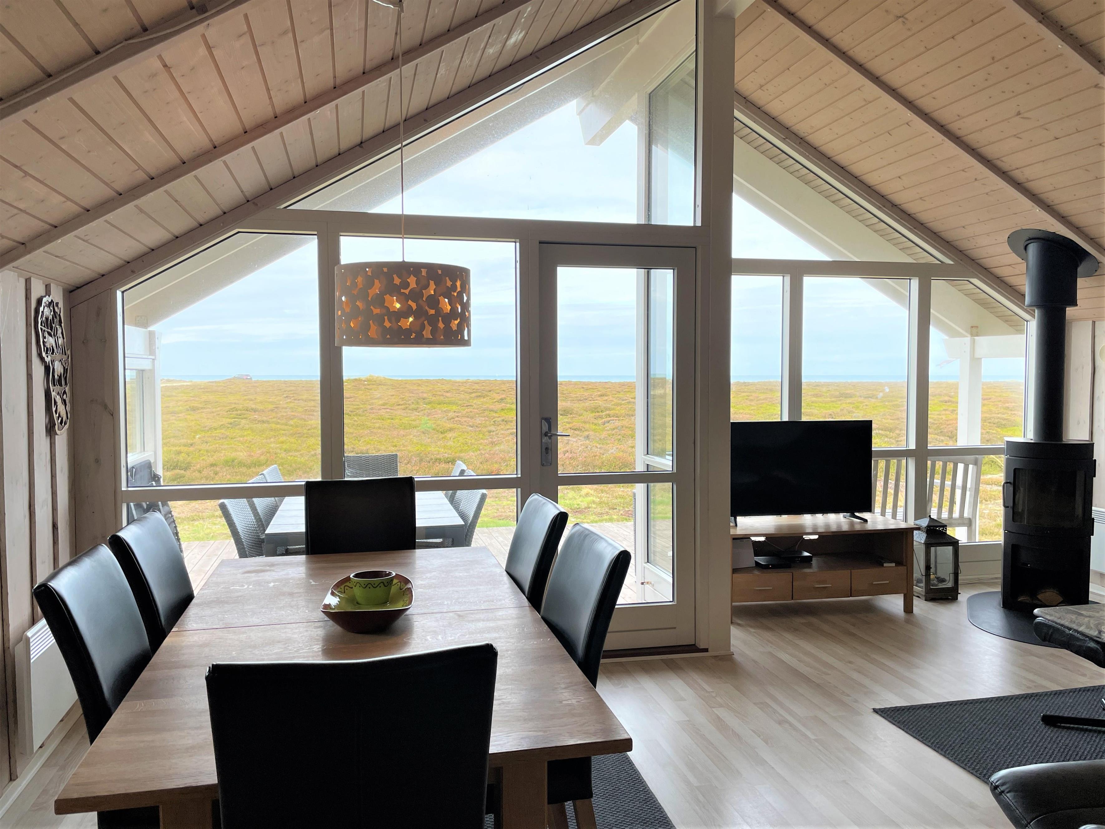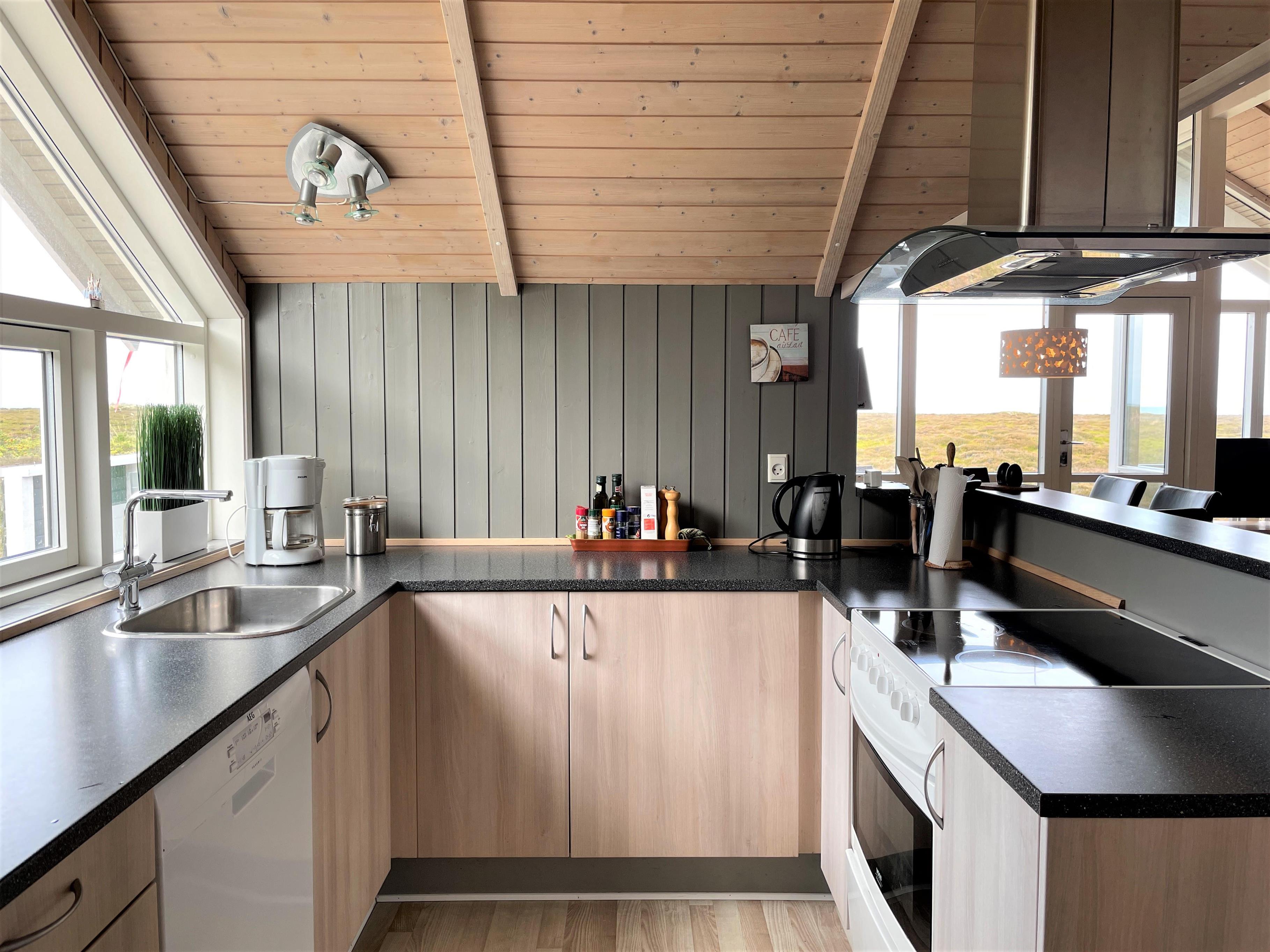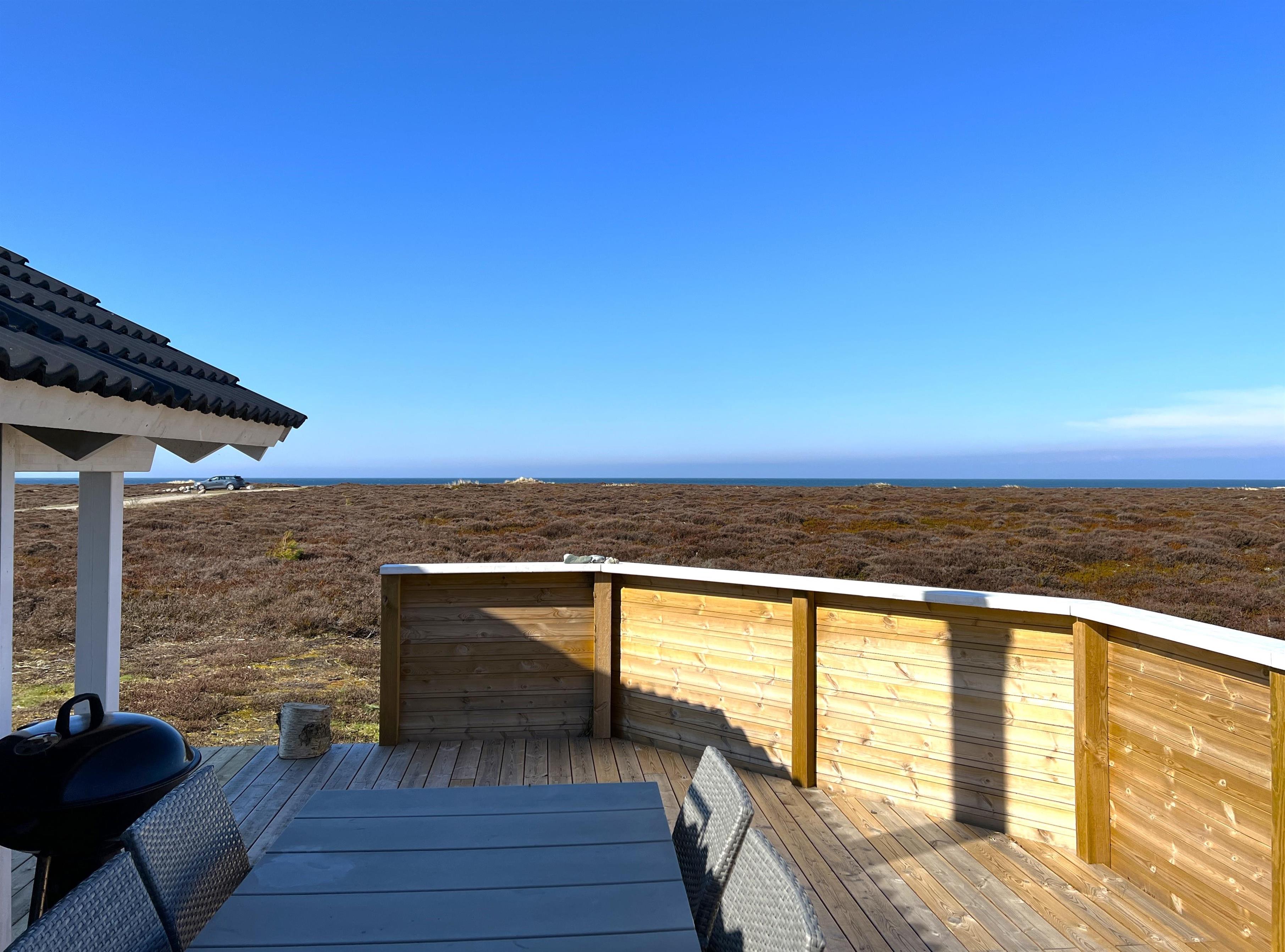 HAVUDSIGT. Et virkeligt skønt feriehus beliggende i 1. række med en fantastisk panoramaudsigt ud over lyngheden og Kattegats blå bølger. Beliggenheden er helt unik og meget svær at finde tilsvarende på Læsø. Huset har åbent køkken/alrum og stue med loft til kip. Dejligt velfungerende køkken, en stor stue med brændeovn og tre soverum med henholdsvis dobbelt og køjesenge. Desuden er der et lækkert badeværelse med spa og sauna.