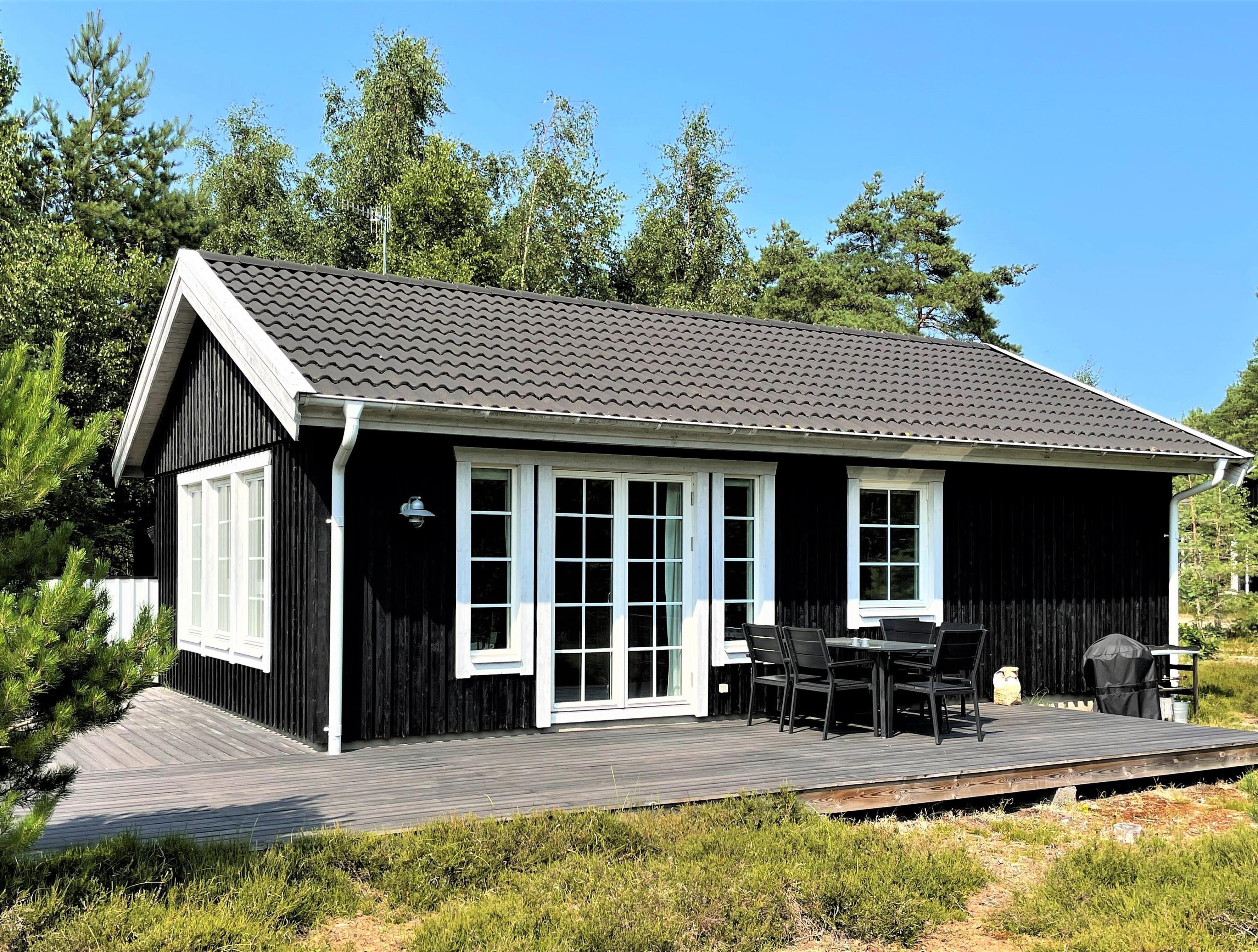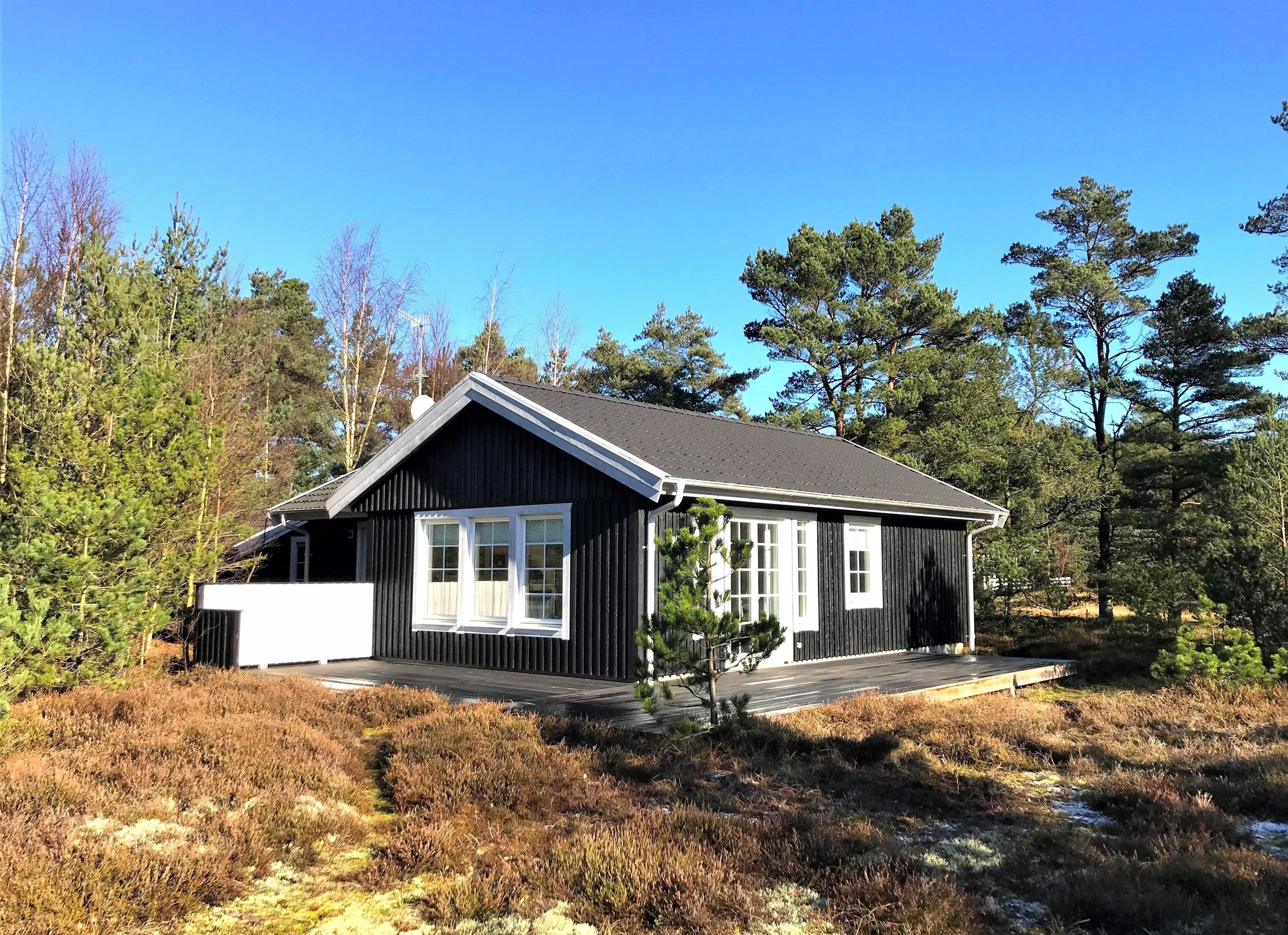 Et virkeligt flot velplejet træhus beliggende på skøn naturgrund med skov og hedelyng. Stor solrig træterrasse med dejlige havemøbler og solsenge; der er solsegl til terrassen.