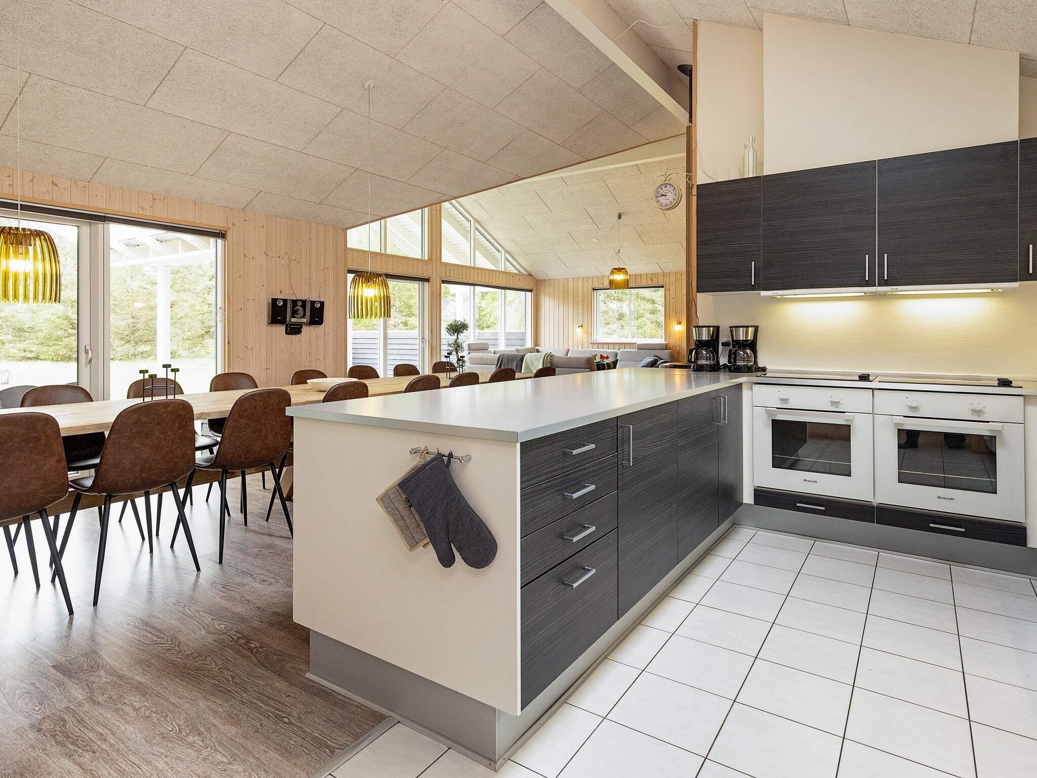 Køkkenet har to opvaskemaskiner, elektriske komfurer og kaffemaskiner. Spise- og opholdsstuen er smagfuldt indrettet med stereoanlæg med cd-afspiller, fladskærms-tv, høj stol til de mindste, sofaområde og brændeovn. Huset har 7 soveværelser. Desuden en stor og rummelig hems. Boxmadrasser i alle værelser og på hemsen samt barneseng og høj stol. 3 badeværelser, alle med gulvvarme.