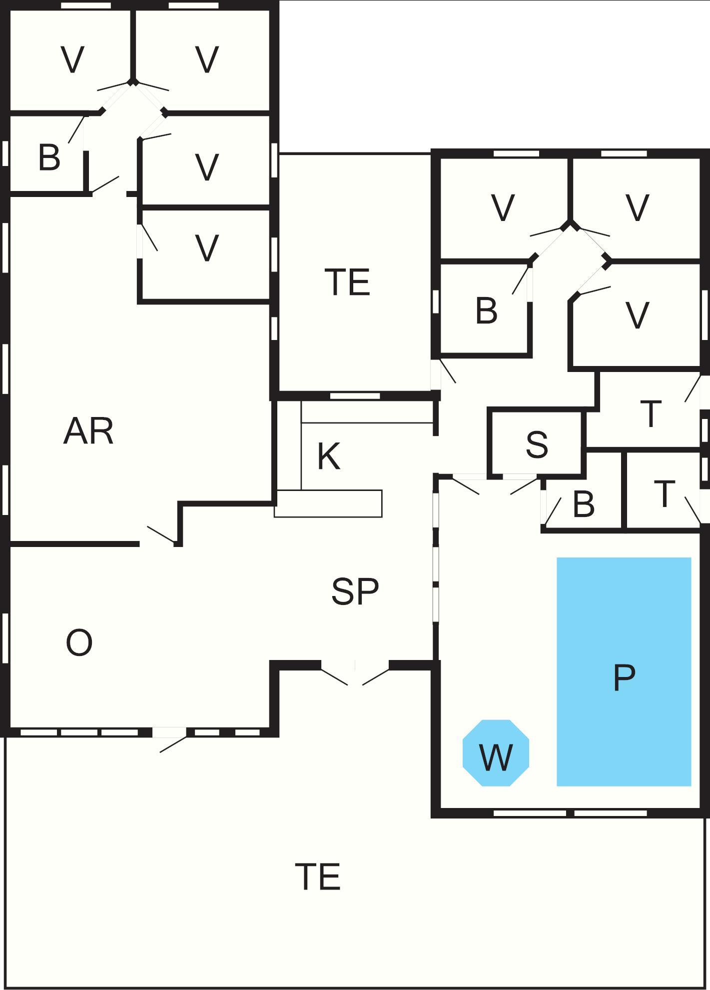 Huset har en poolafdeling, som indeholder både stor swimmingpool, svømmetræner, stort indbygget standvandsspabad og sauna med plads til 4-6 personer. Swimmingpoolen er på 18 m² og med rutschebane til børnene.