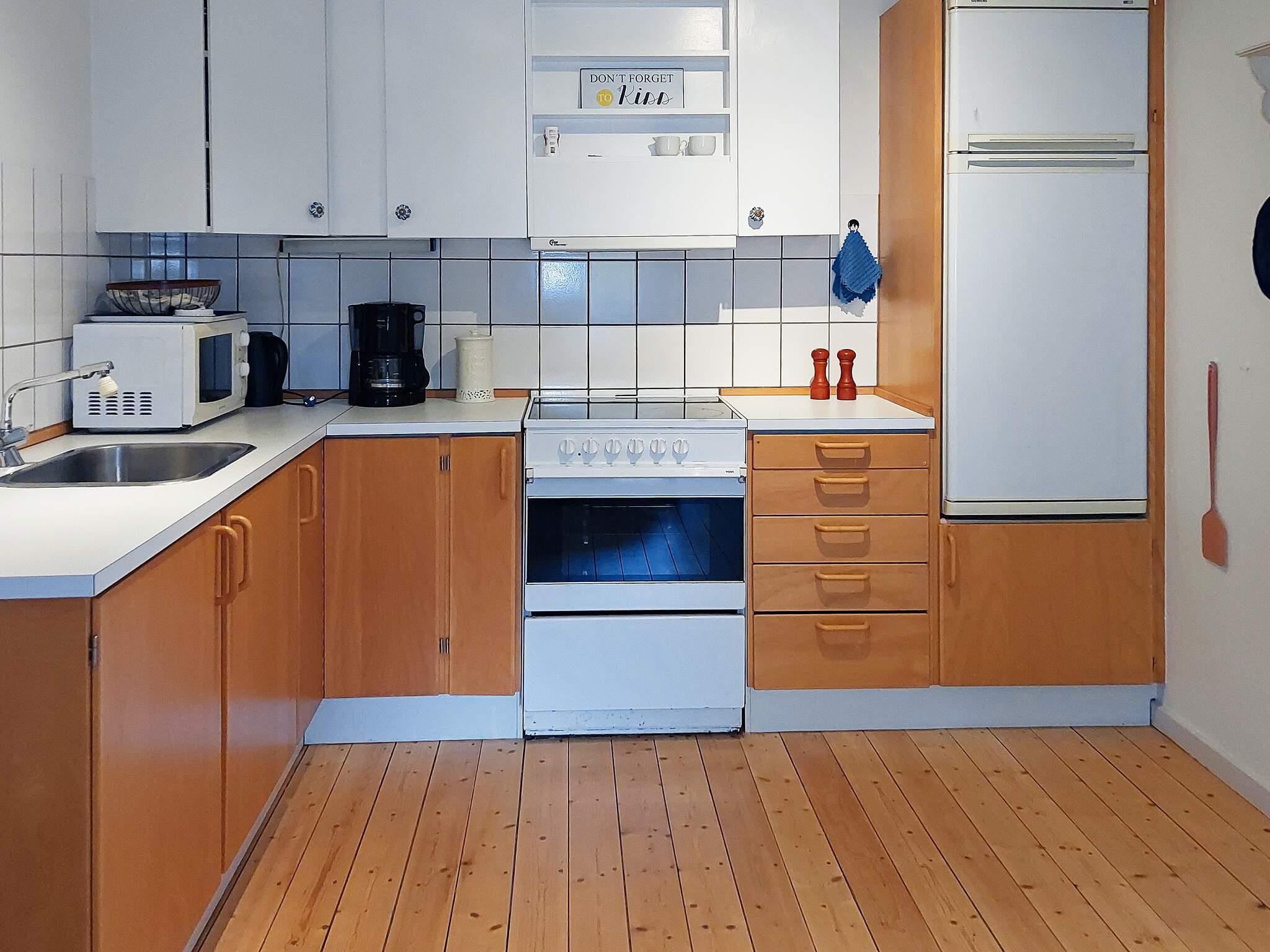 Køkken: El-komfur, køleskab m/frostboks, mikroovn, kaffemaskine