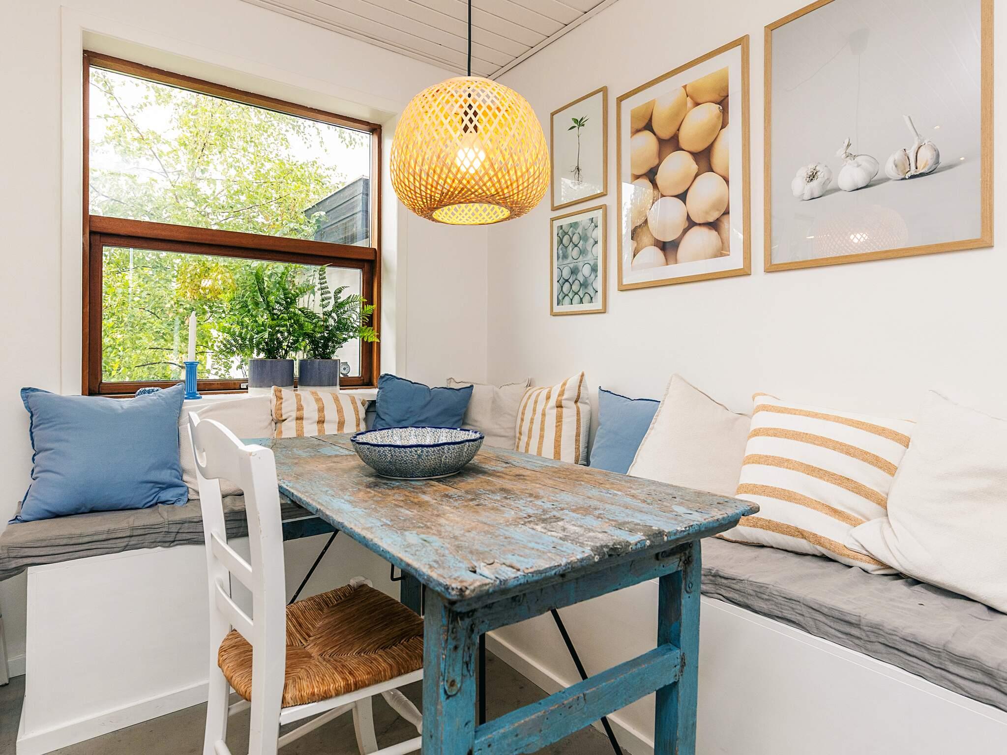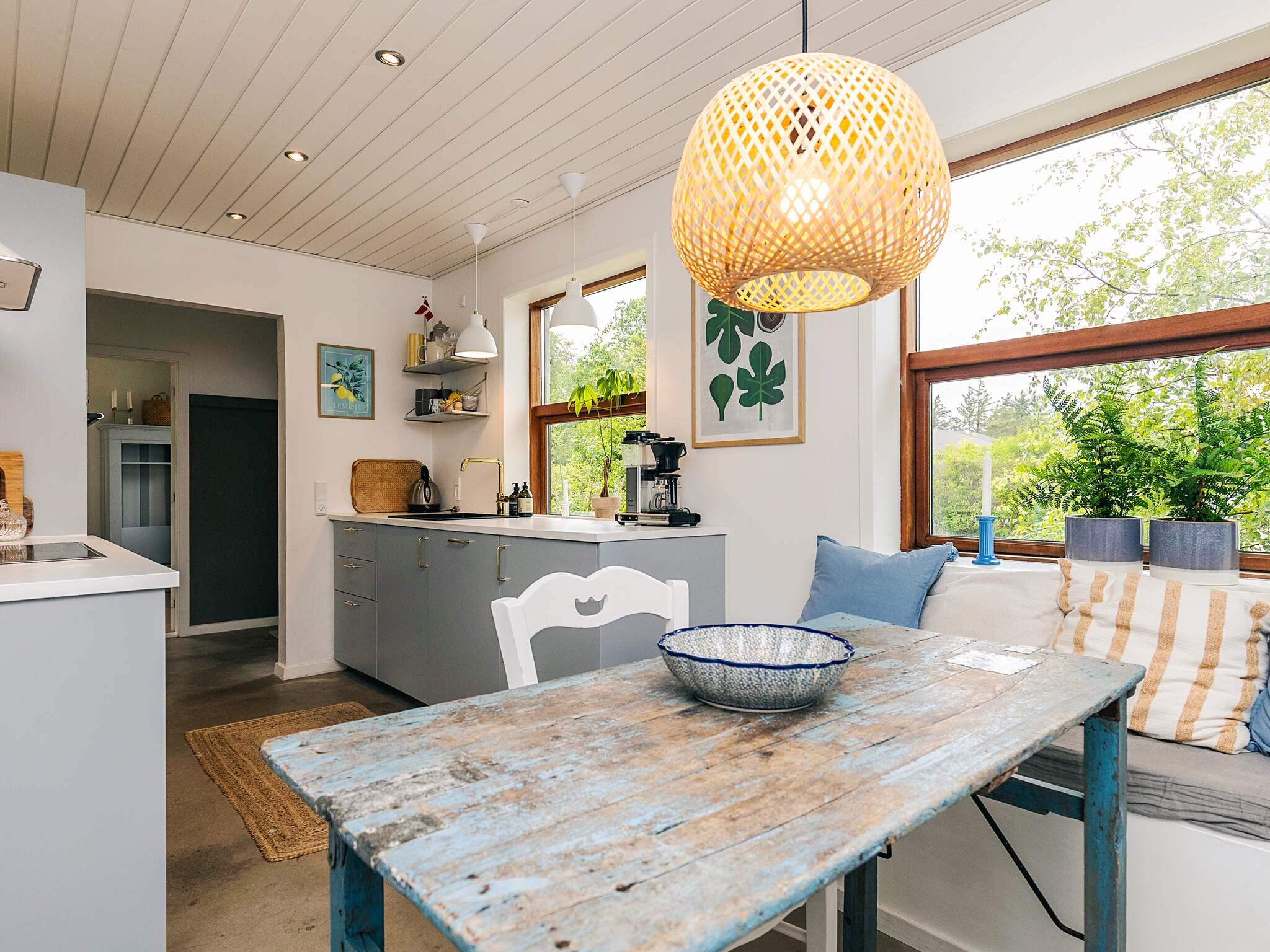 Sommerhuset byder på et dejligt køkken med en hyggelig spiseplads, hvor der er god plads til at lave mad sammen og nyde de gode måltider. Den store og lyse stue er indrettet med komfortable møbler og brændeovn, der giver ekstra varme og stemning på kølige aftener – perfekt til at slappe af med en god bog eller film.