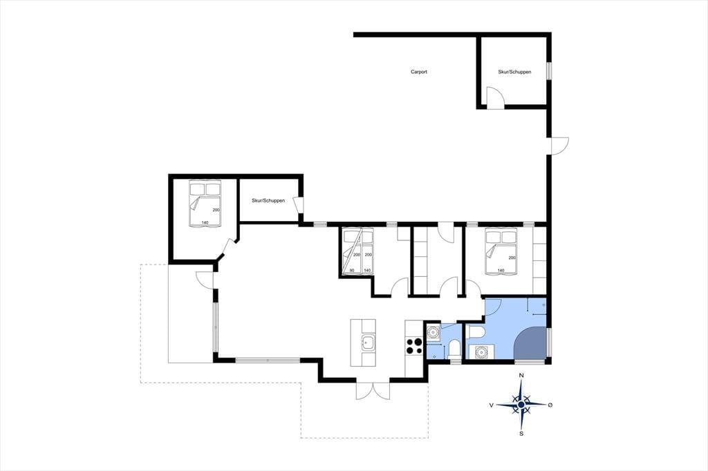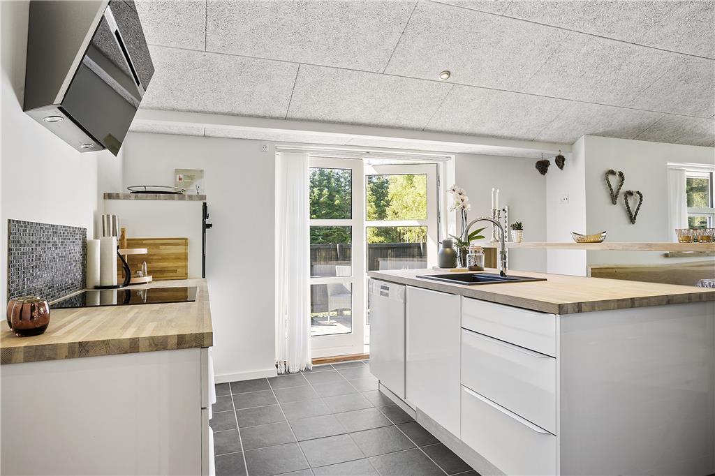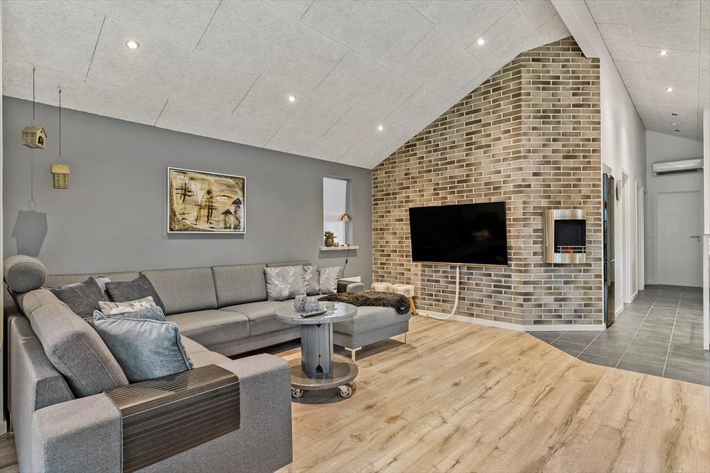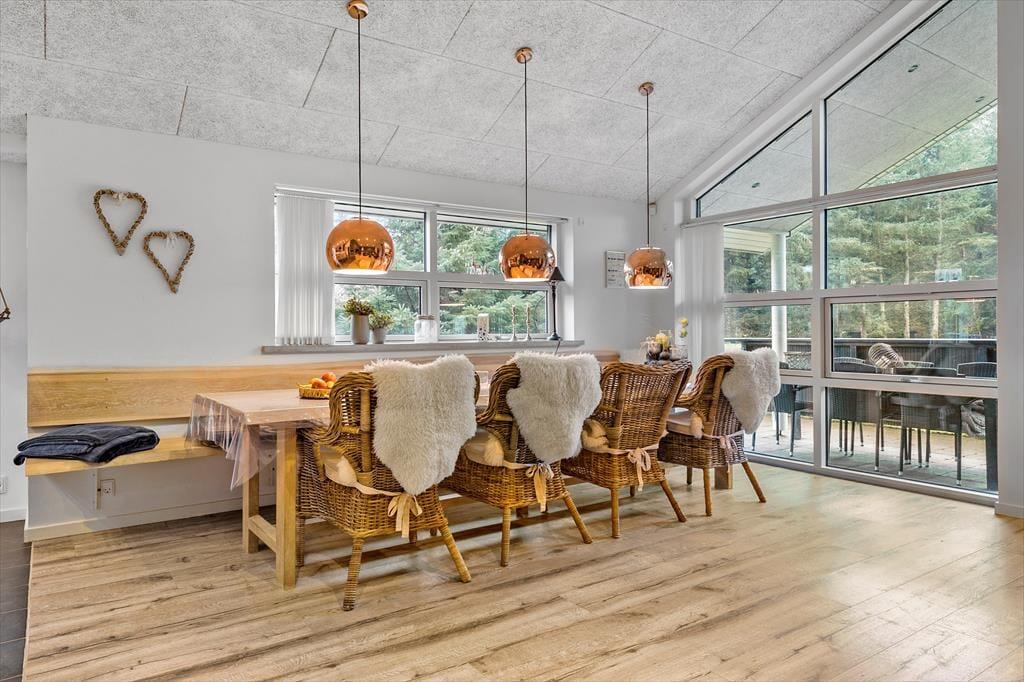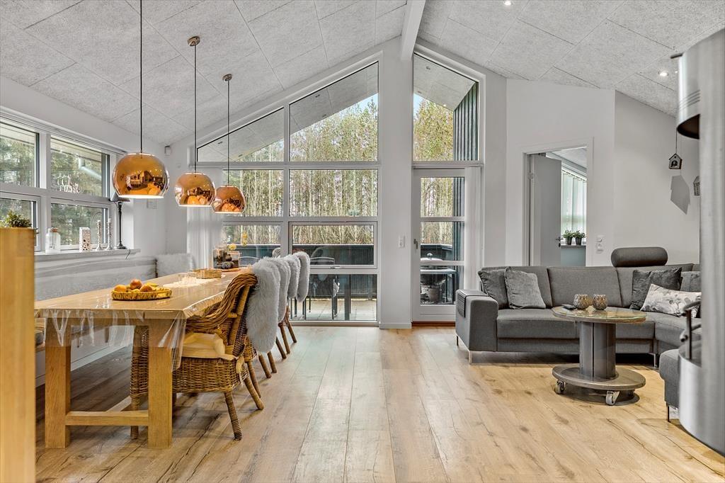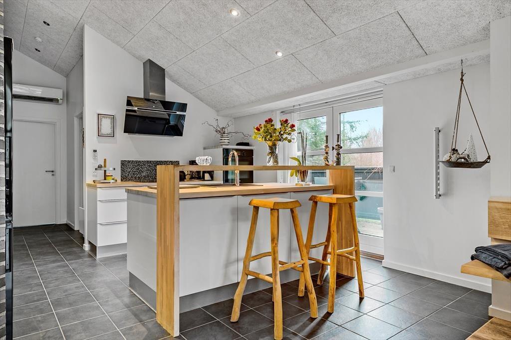 Sommerhuset byder dig velkommen med lyse og rummelige omgivelser, hvor store vinduespartier lukker sollyset ind og giver et fantastisk udsyn til de grønne omgivelser. Stuen er indrettet med komfortable møbler, og etanolovnen spreder en hyggelig varme, der gør stedet ideelt til afslapning og samvær. Køkkenet ligger i åben forbindelse med stuen, så hele familien kan samles om måltiderne, og spisestuen giver en dejlig ramme om både frokost og aftensmad. Soveværelserne er enkelt indrettet med fokus på komfort, så du kan vågne udhvilet og klar til en ny dag ved kysten.