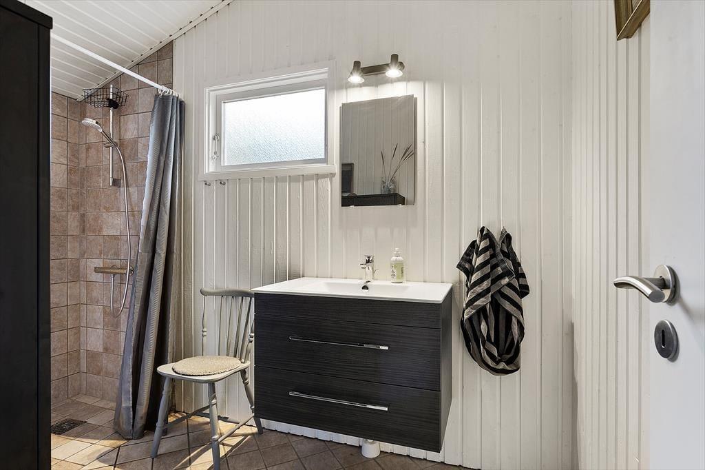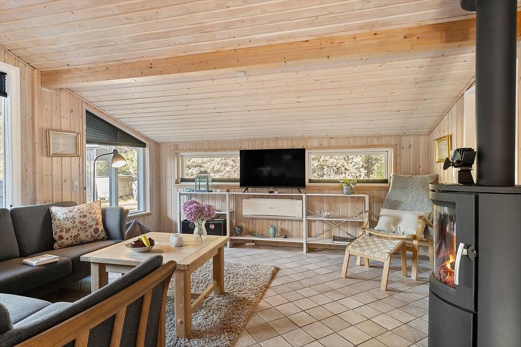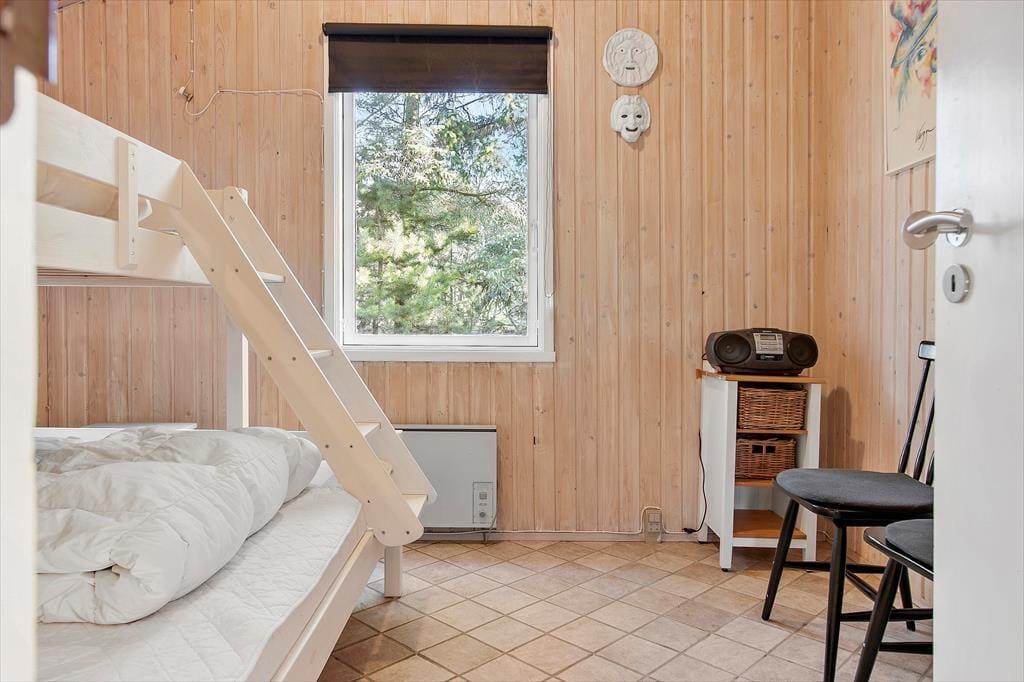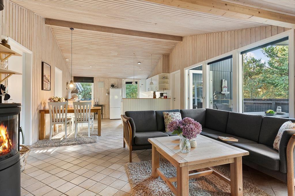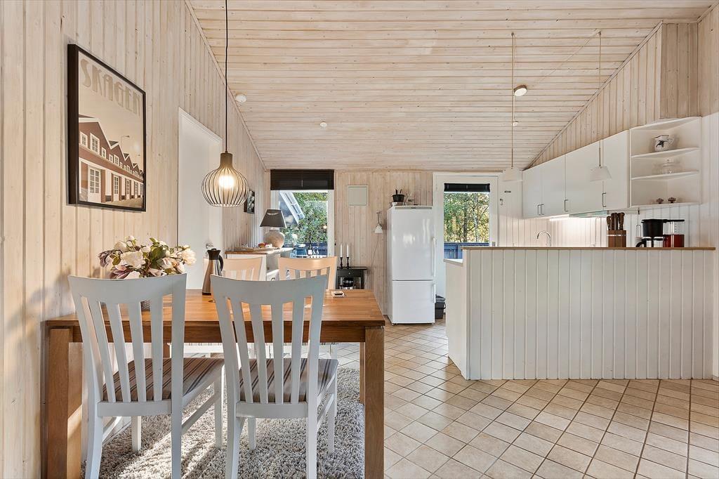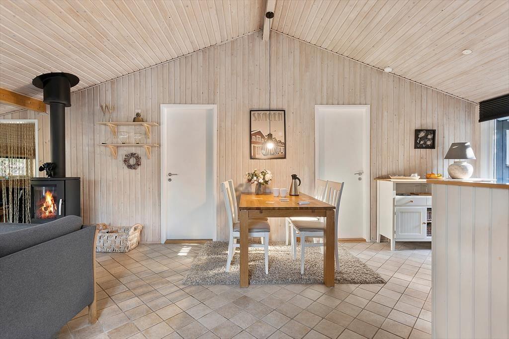 Indenfor mødes du af en lys og hyggelig atmosfære, der straks inviterer til afslapning. Det åbne køkken ligger i forbindelse med stuen, så madlavningen bliver en social oplevelse, hvor du kan snakke med resten af familien, mens du forbereder feriens lækkerier. I stuen er der god plads til både måltider ved spisebordet og afslappende stunder i sofaen – og når aftenen falder på, kan I tænde op i brændeovnen og mærke den rolige varme brede sig. Indretningen er enkel og hyggelig, så du nemt kan føle dig hjemme fra første øjeblik. Her er plads til både samvær og stille stunder, hvor du kan synke ned med en god bog eller bare nyde udsigten til de grønne omgivelser.