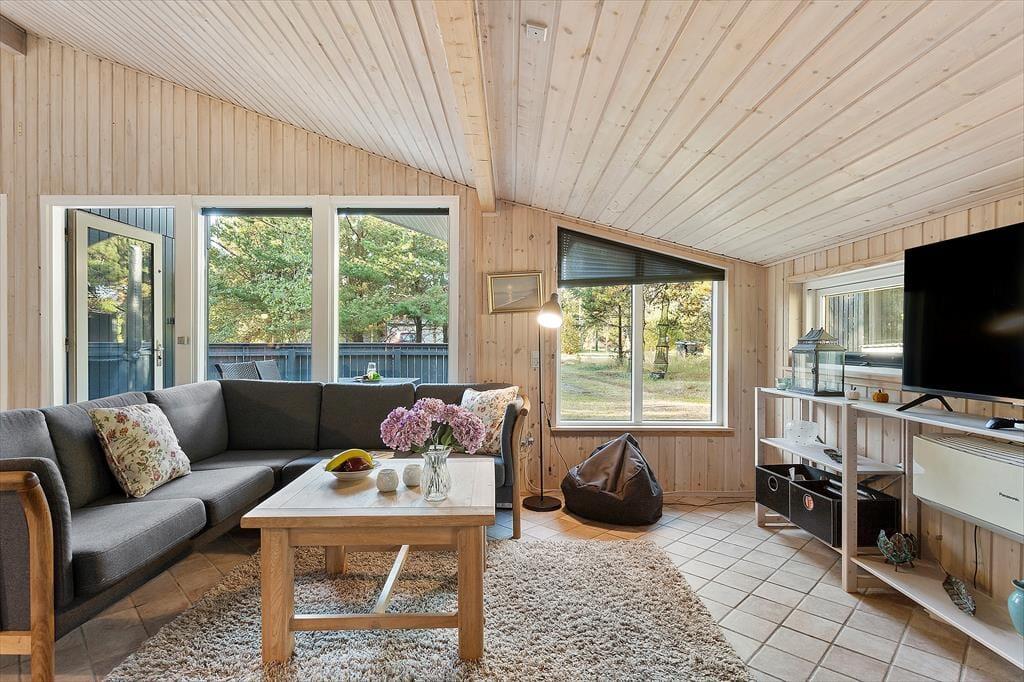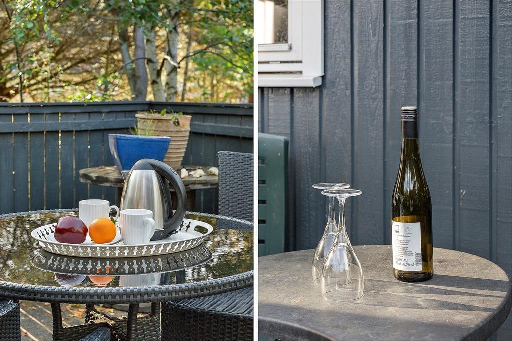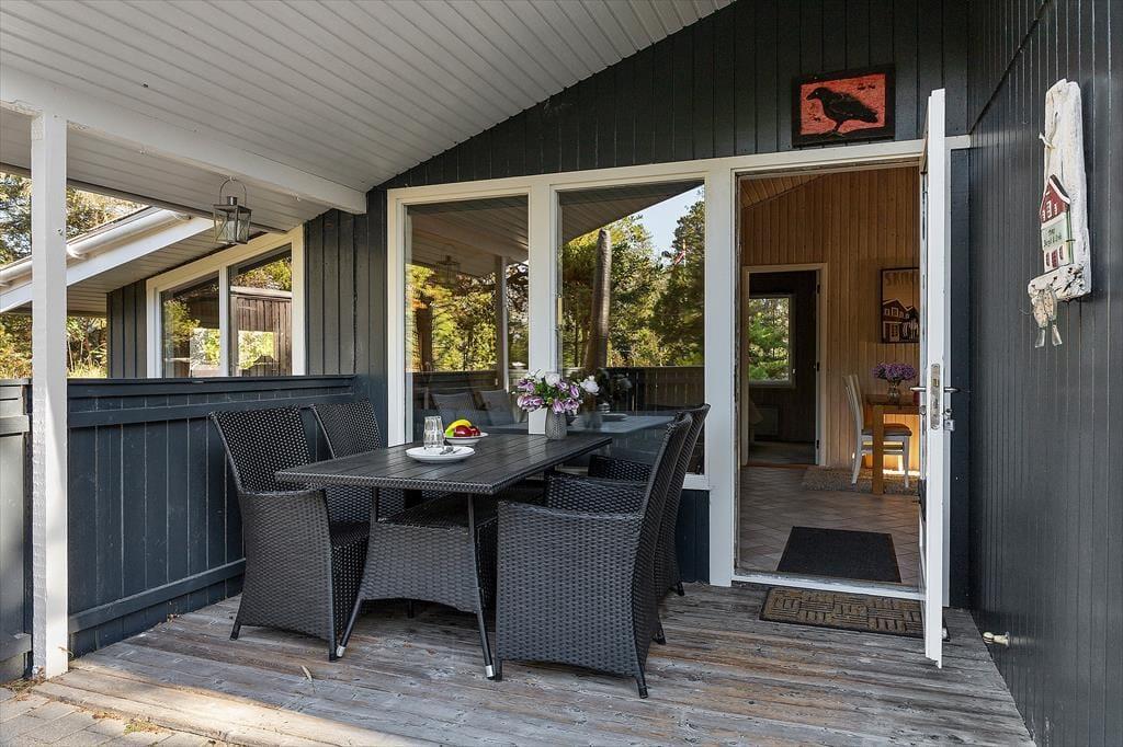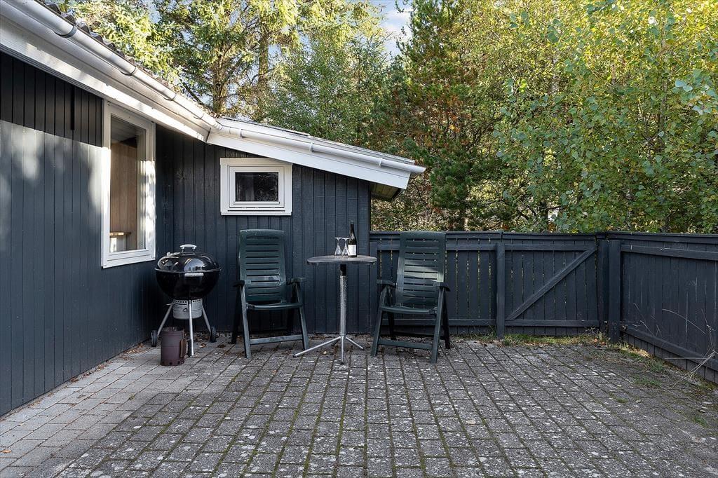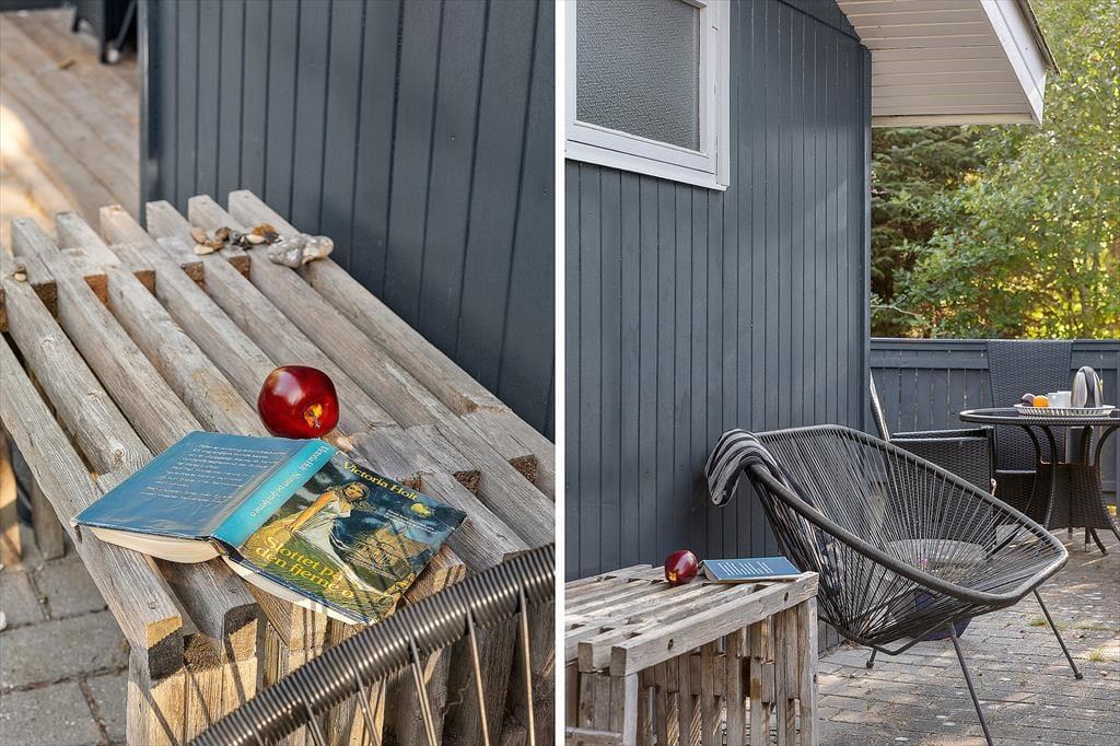 Sommerhusets store terrasseområder indbyder til at bruge mange timer under åben himmel. Der er god plads til både morgenkaffe i solens første stråler, frokost i det fri og lange sommeraftener med grill og hyggesnak. Terrassen er omkranset af den smukke naturgrund, der giver en fredelig og ugeneret stemning – perfekt til både afslapning og leg. Her kan børnene boltre sig frit, mens de voksne nyder roen og fuglesangen. Skovens dufte og lyde skaber en særlig feriestemning, der gør det nemt at koble helt af fra hverdagens travlhed. Og med husets beliggenhed midt i naturen, kan du altid finde en stille krog, hvor du bare kan være til stede i nuet.