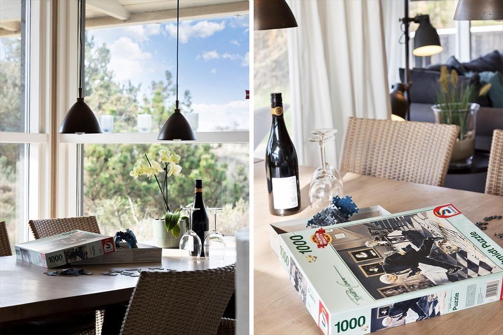 Den førnævnte spa og sauna ligger begge som del af husets rummelige badeværelse, og hvis du trænger til at få varmen og komme helt ned i ferietempo lige ved ankomsten, er det et oplagt sted at starte. Du kan også sætte dig i den hyggelige stue, hvor store vinduespartier inviterer solen og den naturskønne udsigt indenfor. Her er der brændeovn, komfortabelt møblement og åben forbindelse til et veludstyret køkken – og havedøren nær spisepladsen gør det nemt at smutte helt ud på terrassen, når vejret indbyder til det. På de tre soveværelser er der sengepladser til seks personer, og hvis I har en eller to hunde i familien, er de for øvrigt også velkomne inden døre.