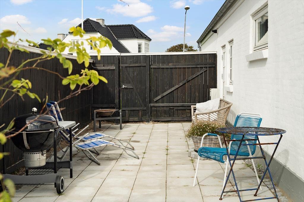 Stuens franske døre giver dig direkte adgang til en stor og skøn terrasse, der breder sig ud mod den lukkede og sydvendte baghave. Der er flere ugenerede opholdspladser at vælge imellem, og derfor får du mulighed for at finde en dejlig krog i solen, uanset om det er morgenkaffen, sommerfrokosten eller den friskgrillede aftensmad, du vil indtage i det fri. Den velanlagte græsplæne indbyder til leg og havespil, og hvis du har en eller to hunde med på ferie, kan de firbenede familiemedlemmer også se frem til at hygge sig i de trygge og grønne omgivelser.