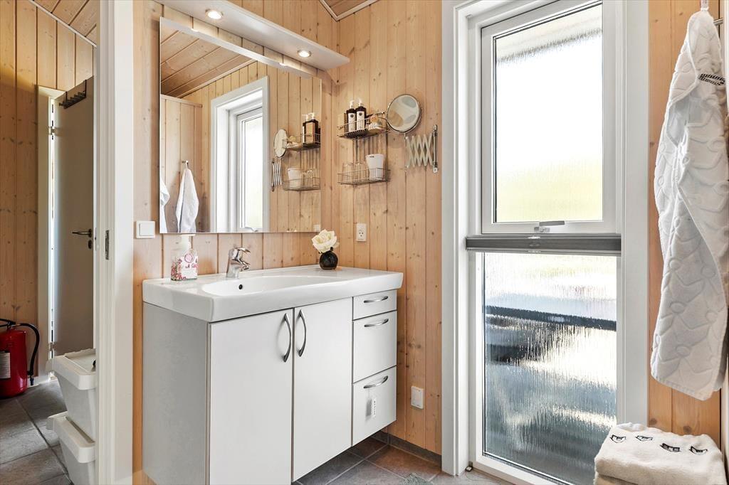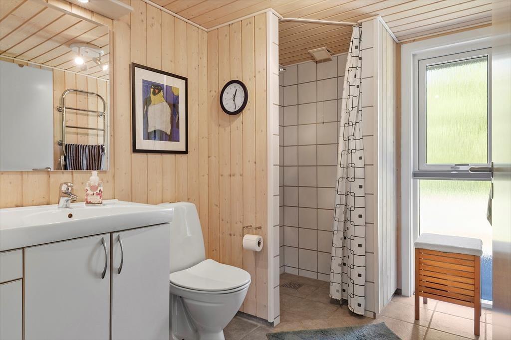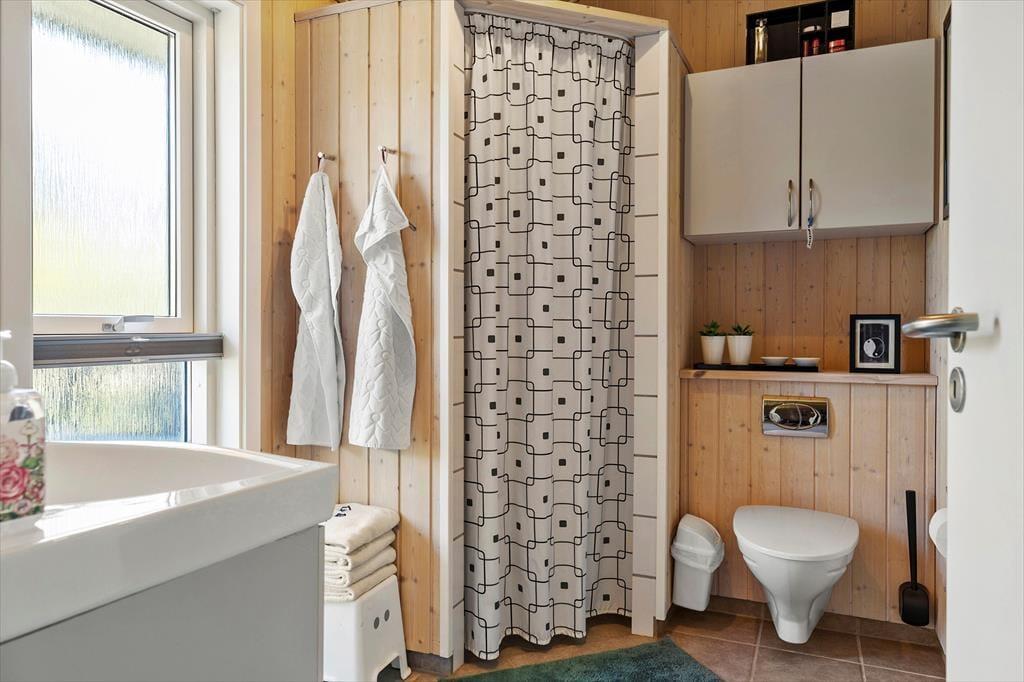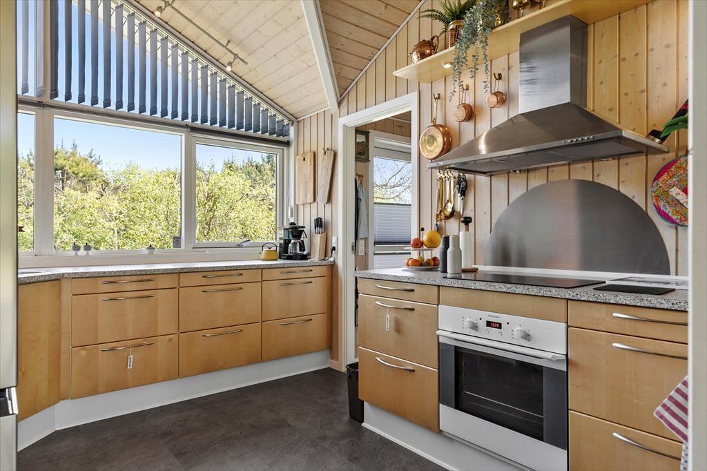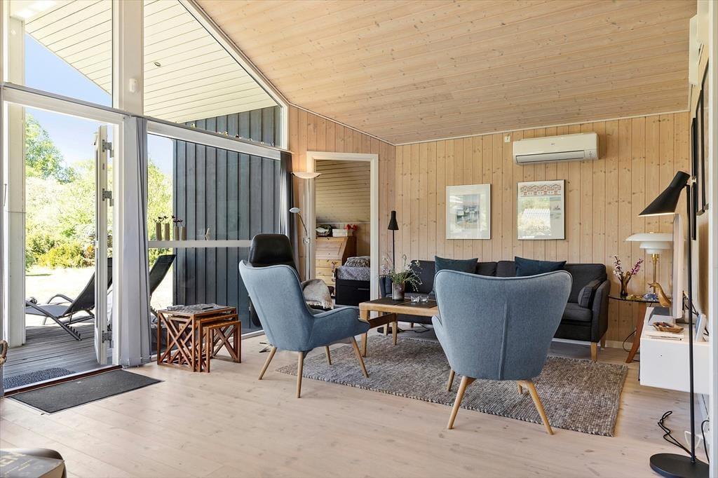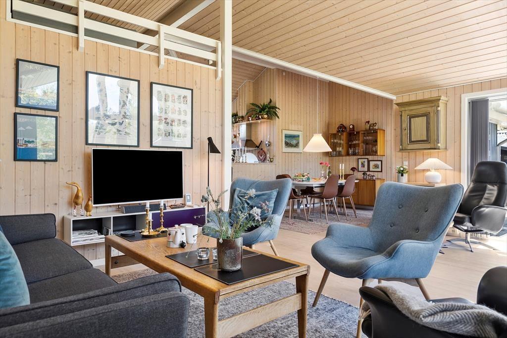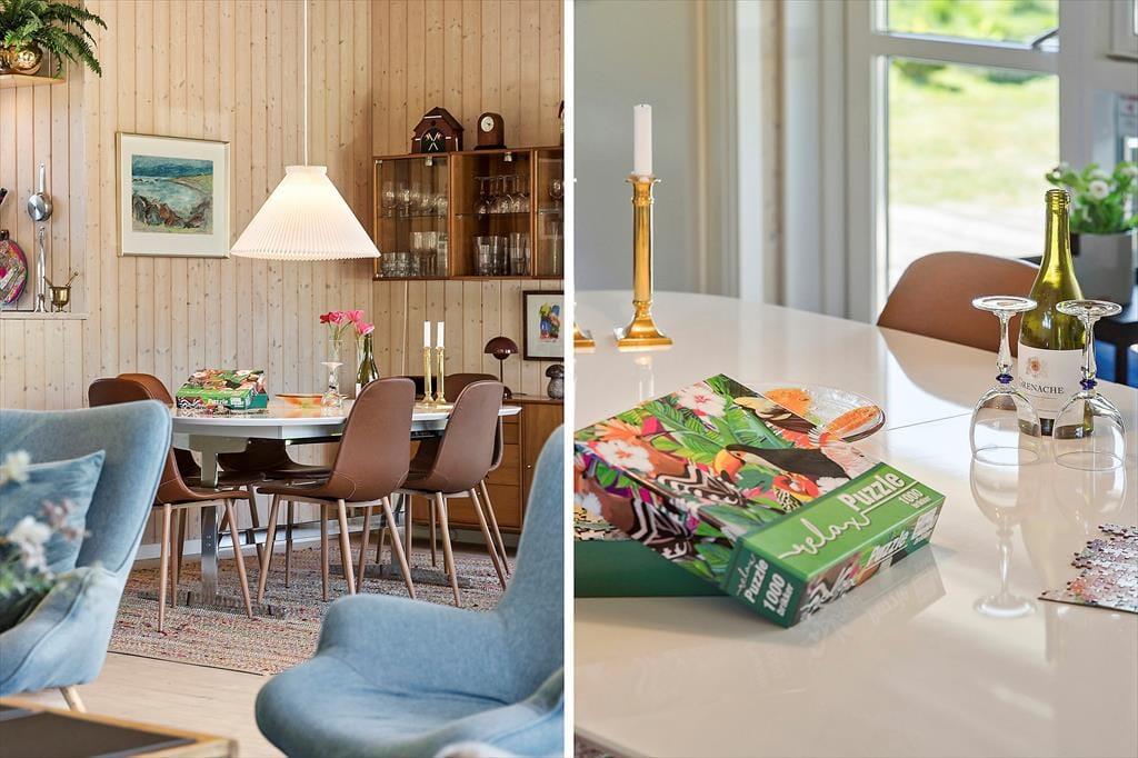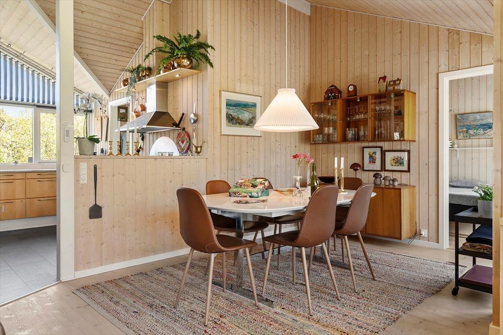 Det komfortable sommerhus byder jer velkommen med en varm og indbydende atmosfære, hvor der er tænkt over detaljerne. Træbeklædte vægge og lyse møbler skaber en ægte sommerhusstemning, og store vinduespartier lukker det grønne udenfor helt ind i stuen. Her mærker man straks nærheden til naturen – både i stemningen og i lyset, der falder blødt ind gennem vinduerne og gør opholdsarealerne lyse og behagelige at være i. Sommerhuset råder over to badeværelser, hvilket gør det ideelt til familier eller vennepar, der ønsker privatliv og komfort under ferien. I det åbne opholdsrum kan du nyde måltider, brætspil og afslappede stunder – og selv i det mindste øjeblik er det, som om roen fra omgivelserne smitter af og breder sig indendørs. Huset er både praktisk og hyggeligt, og det danner en tryg base for ferieoplevelser i det nordjyske.