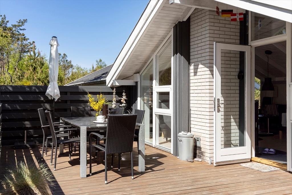 Udelivet på Lyngstien 10 er noget helt særligt. Sommerhuset er omgivet af en stor, delvist overdækket træterrasse, som smyger sig rundt om huset og byder på masser af lækroge og solrige pletter. Her kan du slå dig ned med morgenkaffen og lytte til fuglene, nyde en god bog i skyggen midt på dagen og slutte aftenen af med grillmad og vin, mens solen går ned bag trætoppene. Det føles privat og trygt, og den grønne beplantning omkring grunden skaber en skøn og fredelig stemning. Terrassen er perfekt indrettet til både afslapning og samvær, og der er plads til, at I kan flytte jer rundt i takt med solens gang over himlen. Herude mærker man virkelig, hvordan ferie og nærvær går hånd i hånd.