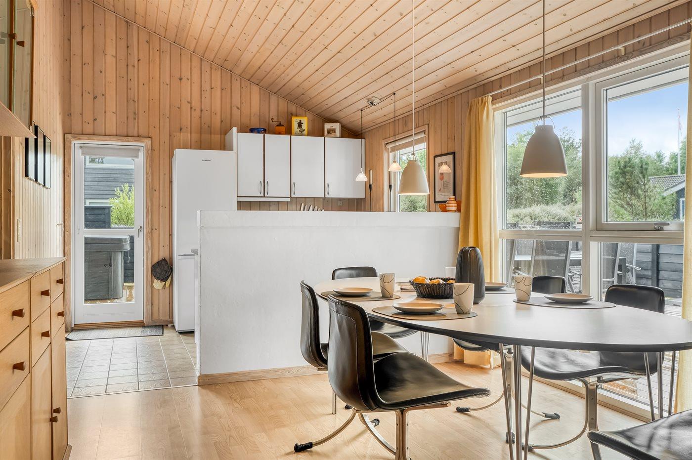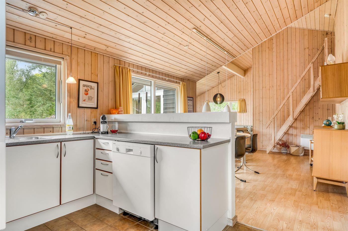 Køkkenet er udstyret med 1 køleskab. Der er 3 induktionskogeplader, varmluftovn, mikrobølgeovn samt opvaskemaskine.