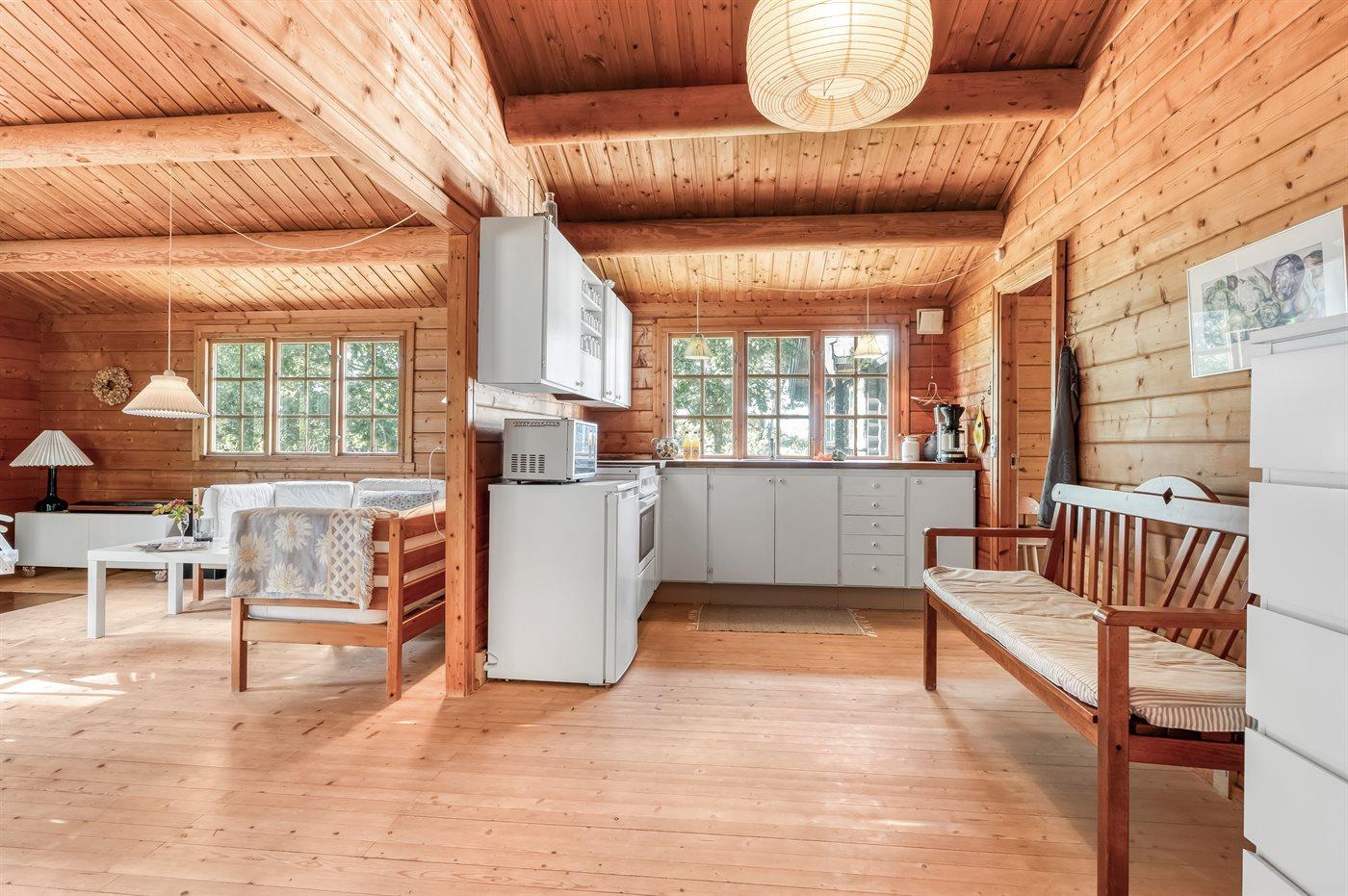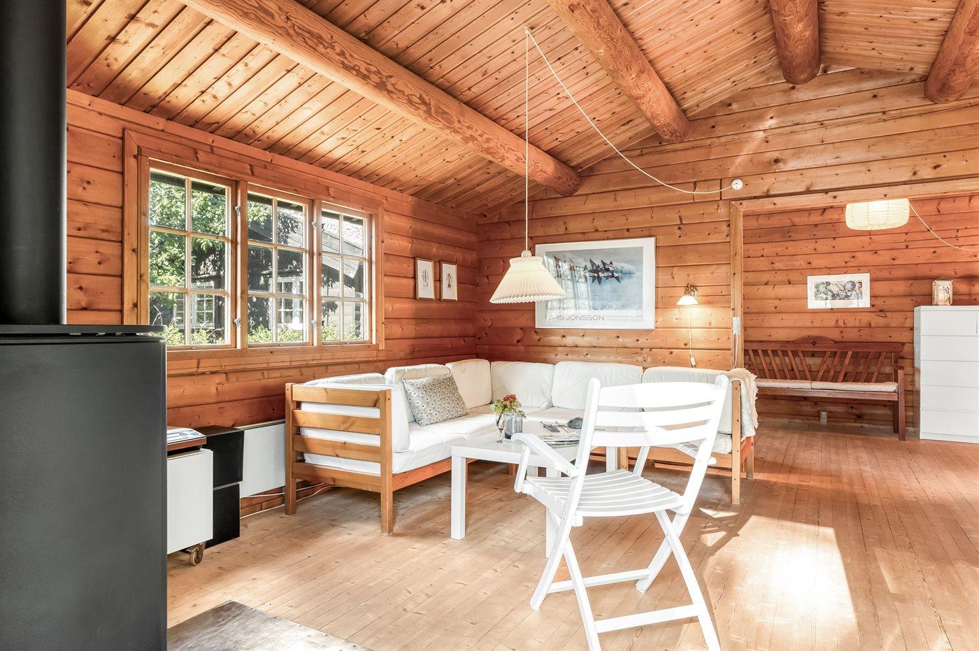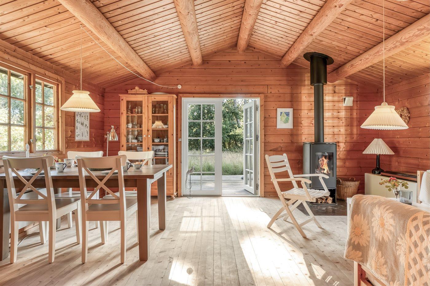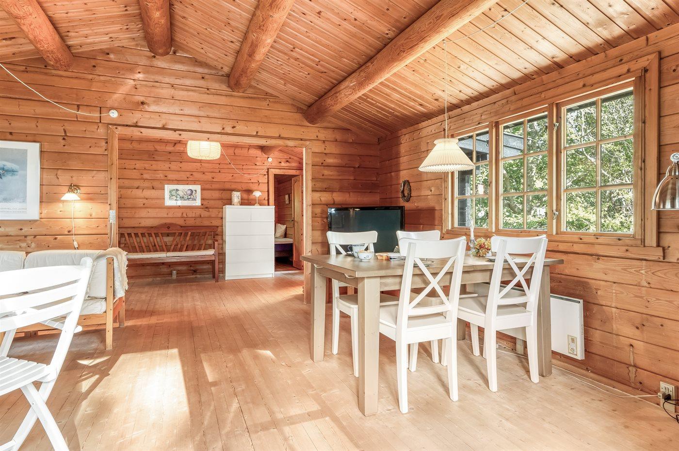 Huset er indrettet med loft til kip, 2 rummelige værelser, et åbent køkken samt stue med bl.a. brændeovn. Fra stuen er der udgang til terrassen, hvor I kan nyde de stille aftener med god mad fra grillen.