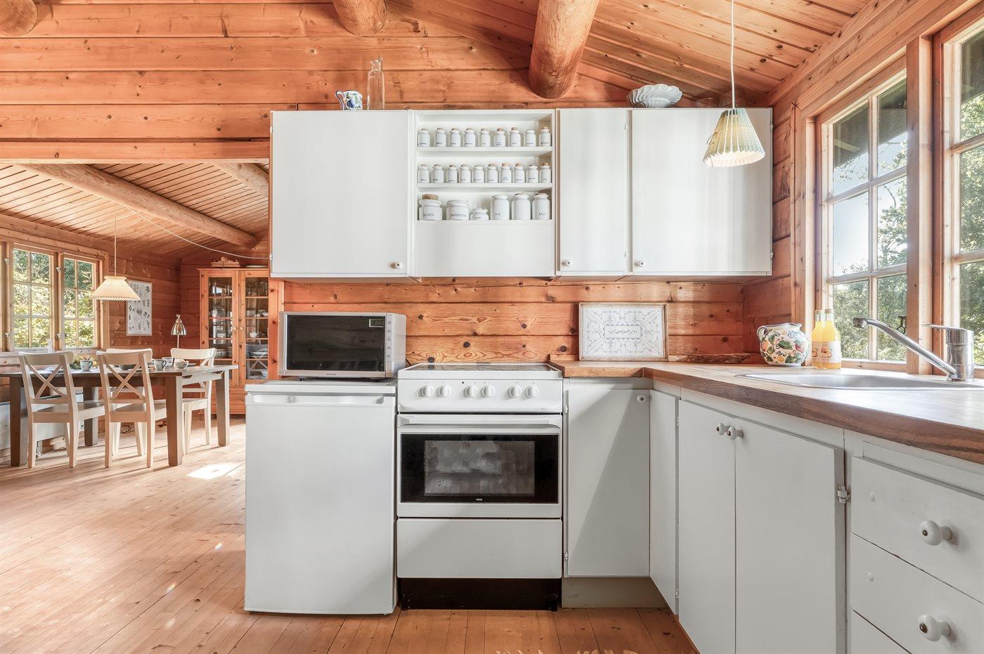 Køkkenet er udstyret med 1 køleskab. Der er 4 keramiske kogeplader, varmluftovn, mikrobølgeovn.