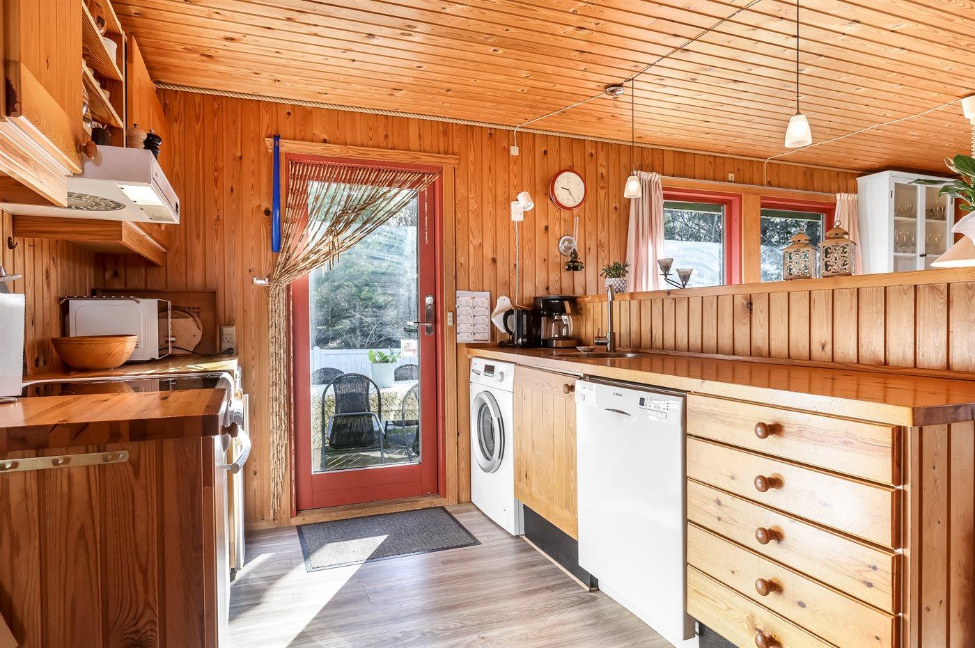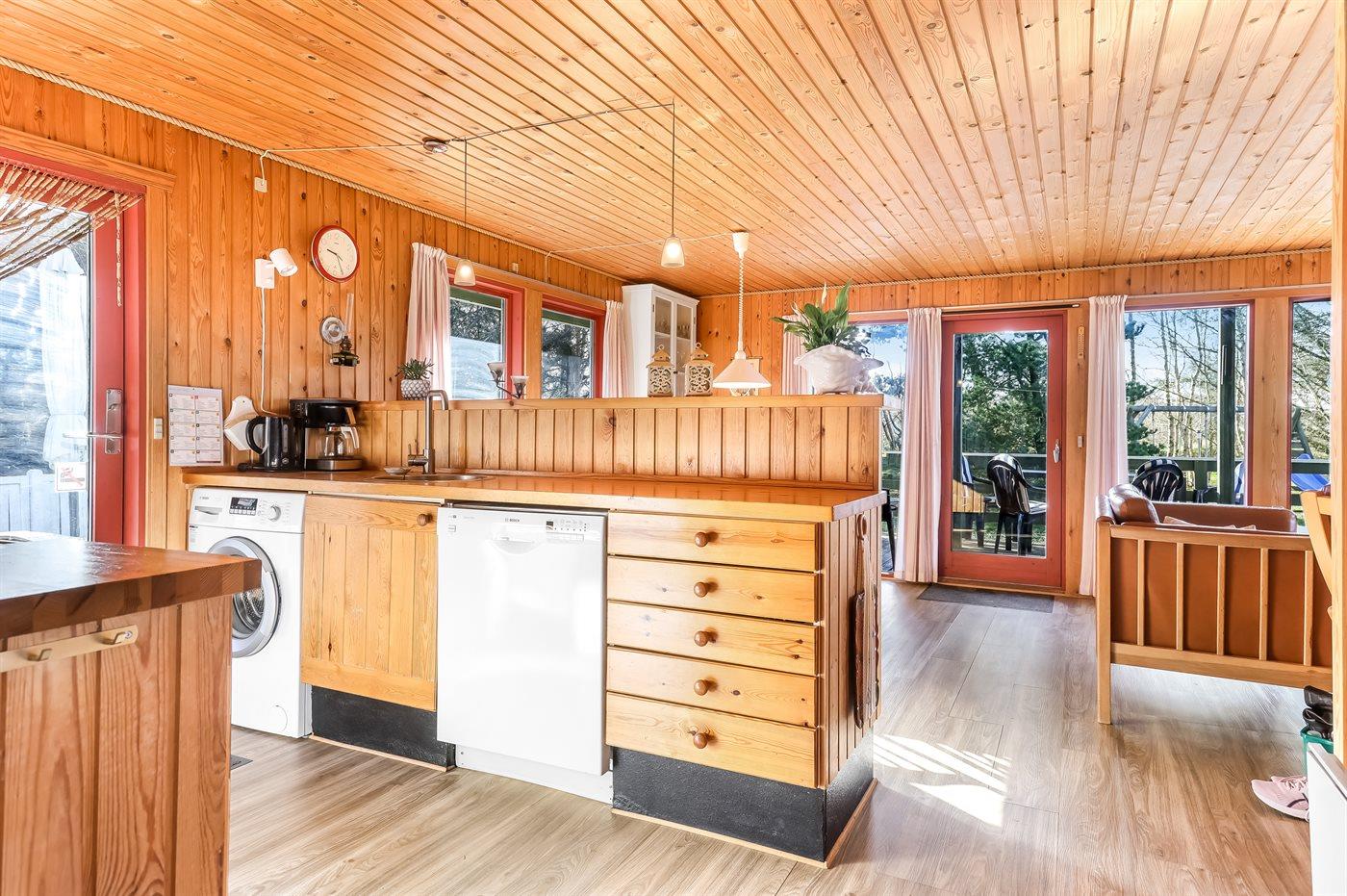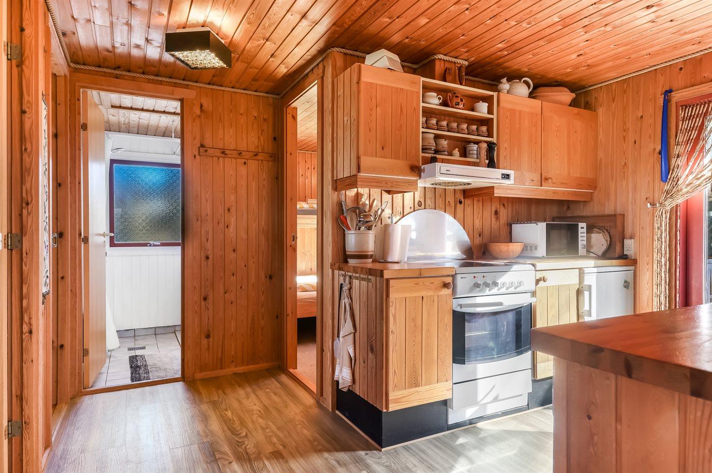 Køkkenet er udstyret med 1 køleskab. Der er 4 keramiske kogeplader, varmluftovn, mikrobølgeovn samt opvaskemaskine.