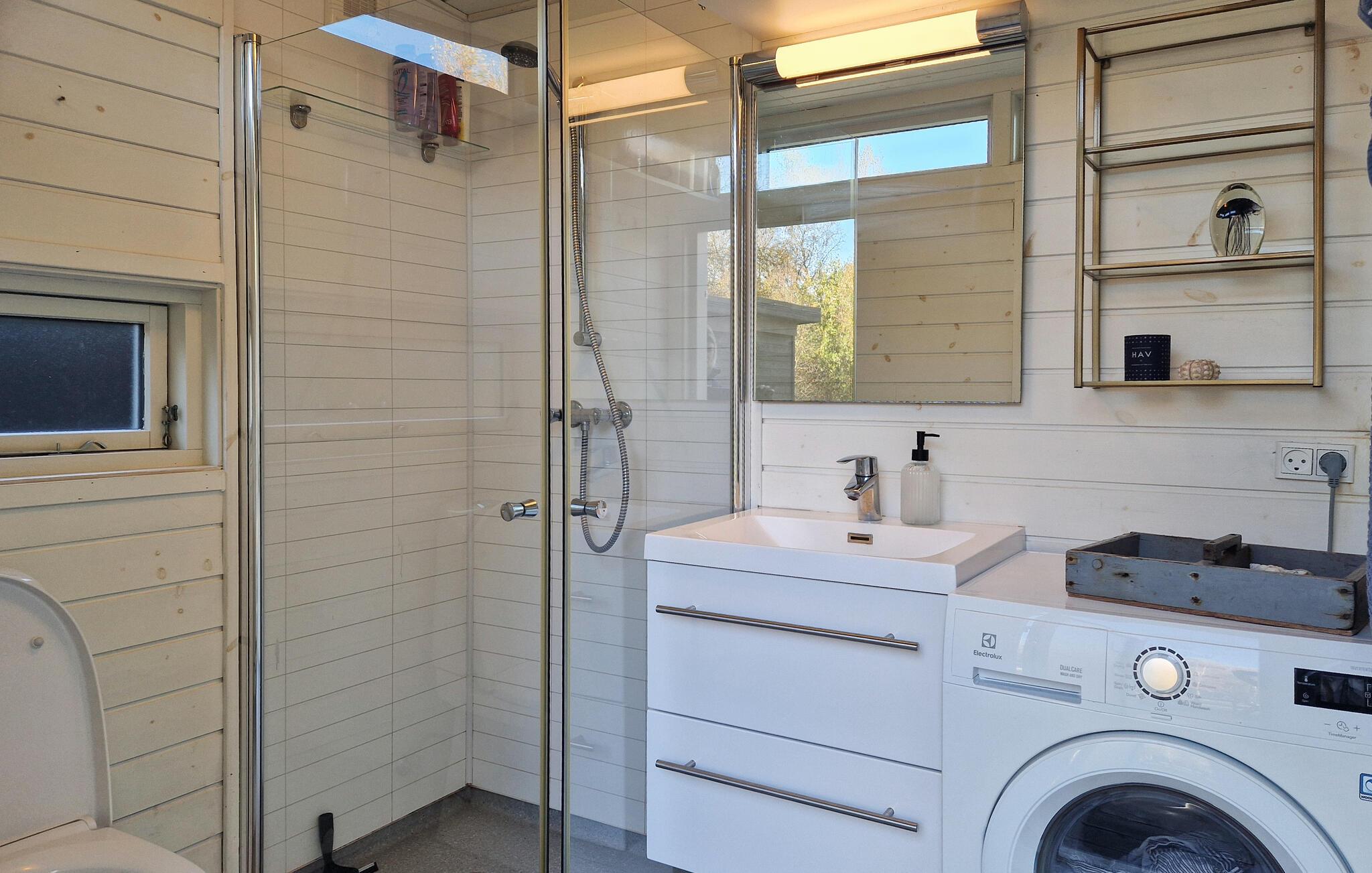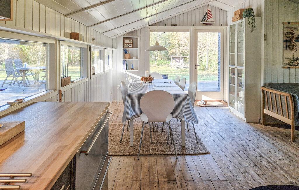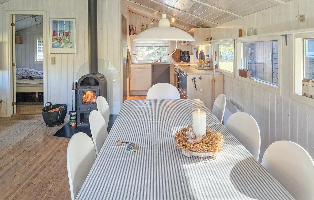 Lad hverdagen ligge og nyd afslappende dage i dette indbydende feriehus, smukt beliggende i det idylliske landskab. Træd indenfor og mærk den varme, lyse atmosfære. Opholdsstuen med trævægge, store vinduer og brændeovn lægger op til at slappe af. Find jer til rette i den hyggelige sofakrog eller nyd måltiderne sammen ved spisebordet med udsigt over de grønne områder. Det veludstyrede køkken med åben adgang til opholdsstuen tilbyder alt, hvad I behøver til selvforplejning.