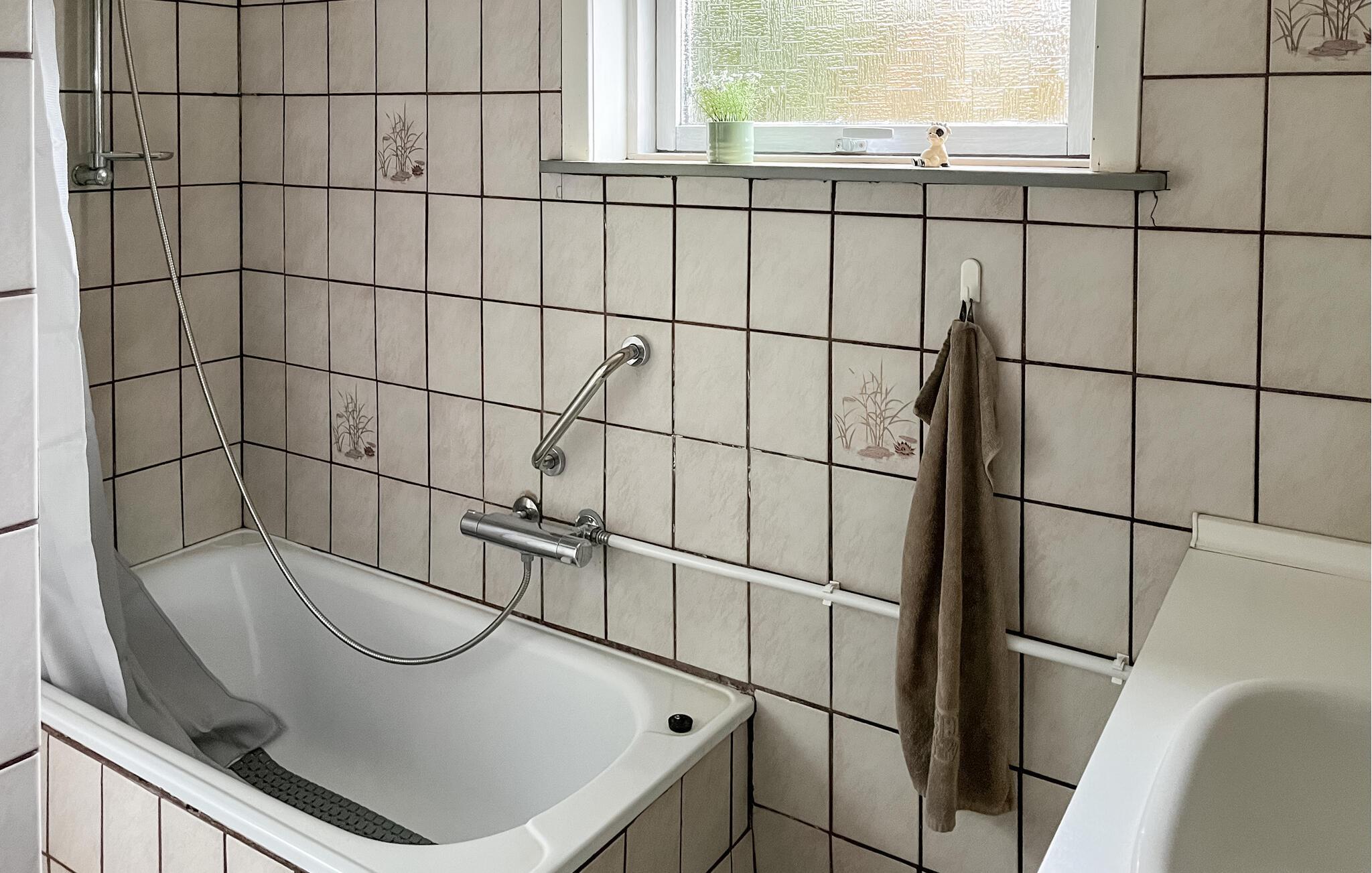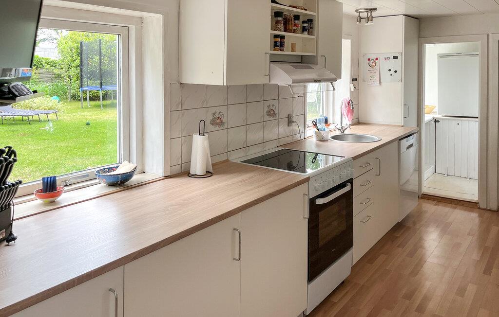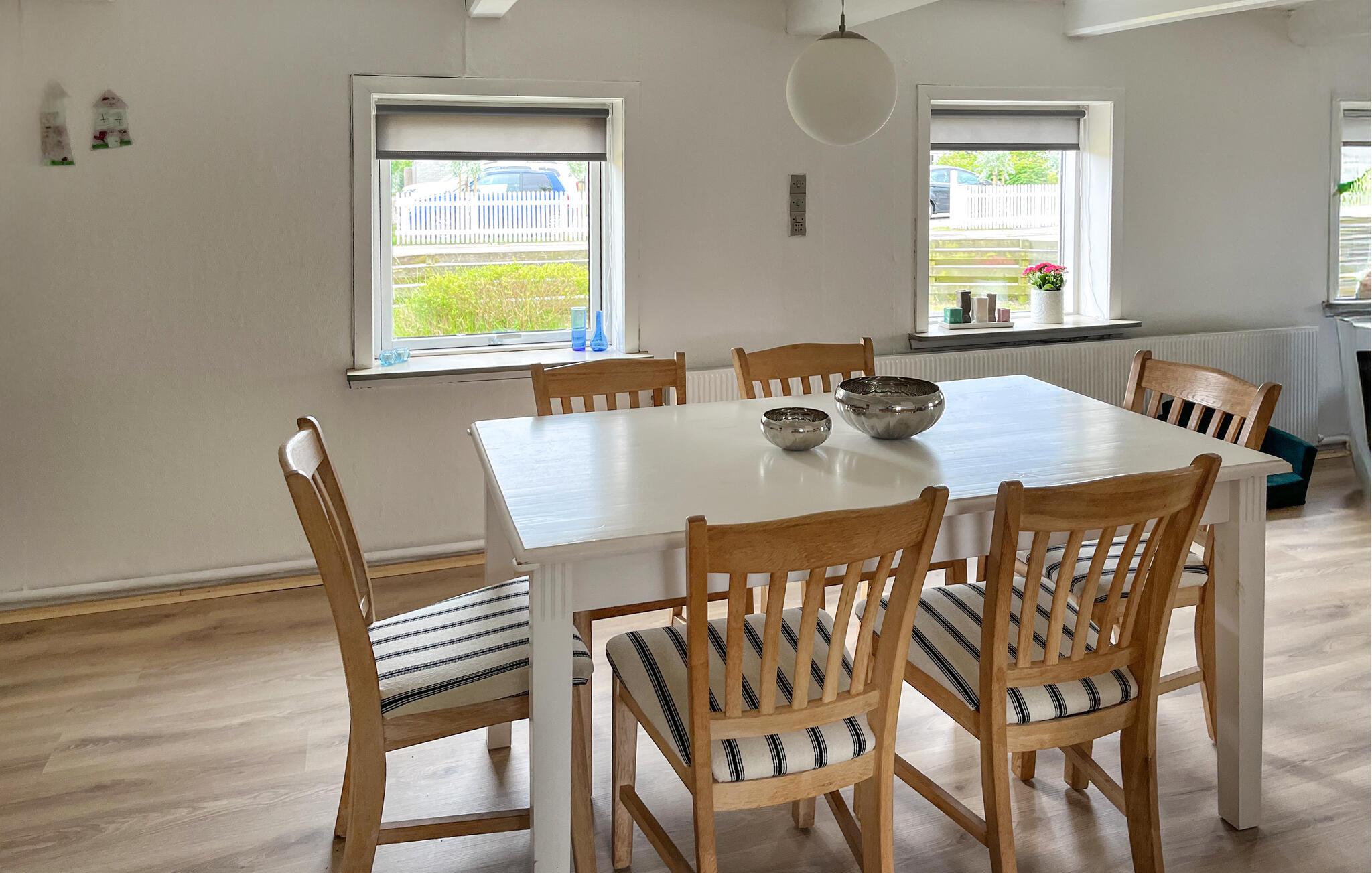 Hold en afslappende ferie i jeres indbydende feriehus med en overdækket have. Huset er ideelt for familier og giver jer et varieret miljø til en afslappende ferie. Find jer til rette i opholdsstuen. Brug de komfortable sofaer til at slappe af, se en film sammen eller nyd et måltid ved spisebordet med venner. Flere siddeområder i huset giver jer privatliv og plads til stimulerende samtaler eller sjove spil. Tilbered måltider sammen i det lange, lyse køkken med udsigt over haven. En ekstra spiseplads i køkkenet sikrer fleksibilitet i hverdagen.