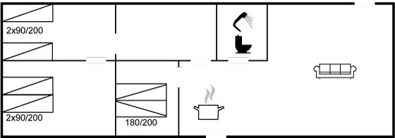Der er i alt 3 soveværelser. Sovepladserne fordeler sig på: 2 sovepladser i dobbeltseng. 4 sovepladser i enkeltsenge.