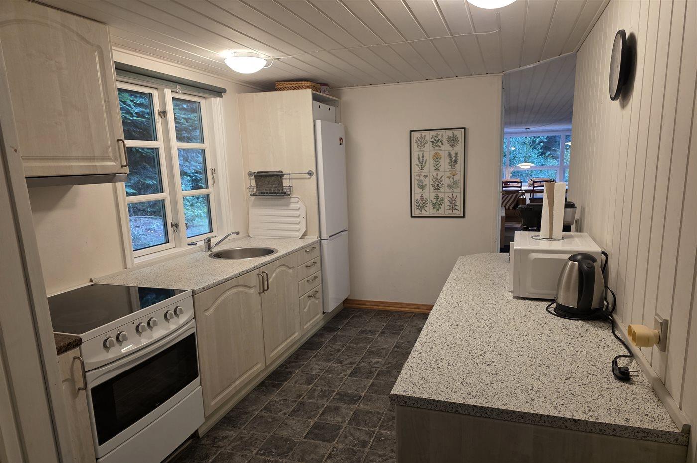 Køkkenet er udstyret med 1 køleskab. Der er 4 keramiske kogeplader, varmluftovn.