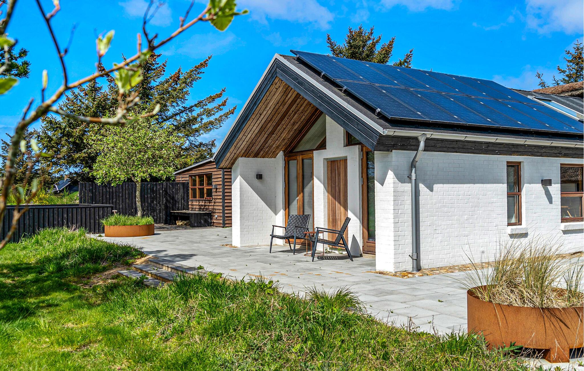Træd ud på den flisebelagte terrasse og nyd den ugenerte beliggenhed. Slap af i de behagelige havestole eller server middagen under åben himmel. Den skønne grund byder på masser af plads til leg og afslapning. Forkæl jer selv med særlige øjeblikke i vildmarksbadet, mærk den beroligende varme og lad blikket vandre over det omkringliggende landskab.