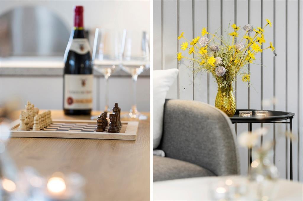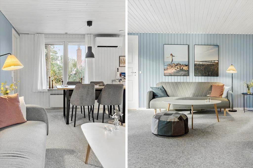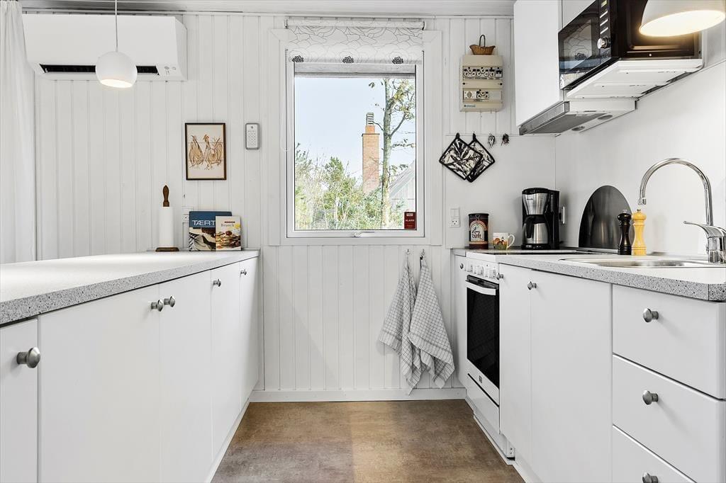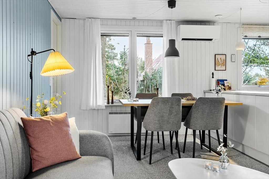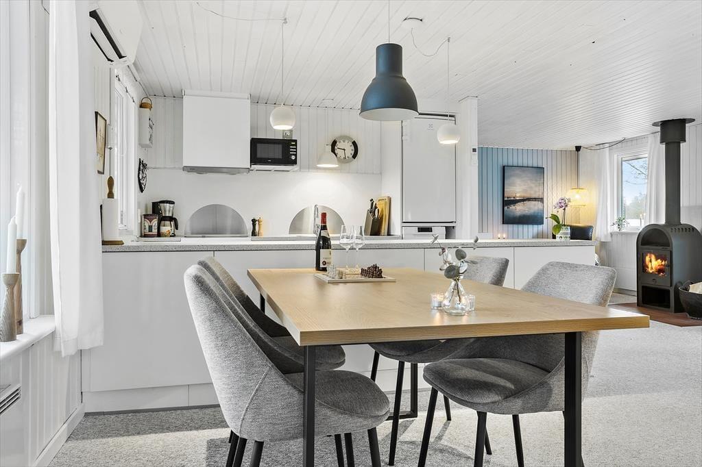 Når du træder indenfor i sommerhuset på Rørsangervej 3, mærker du straks den varme og indbydende atmosfære. Indretningen er lys og skandinavisk med vægt på naturlige materialer, der giver en behagelig og afslappet stemning. Her er både plads til at samles i stuen foran brændeovnen og til rolige stunder med en god bog eller brætspil i godt selskab. Og har du din firbenede ven med, kan I nyde ferien sammen, for hunde er hjerteligt velkomne her – der er endda god plads til, at de kan boltre sig både indenfor og ude.