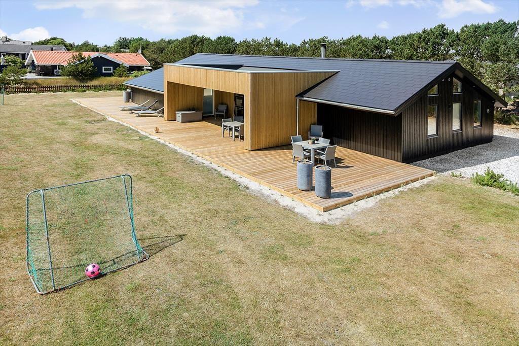 Der er også god plads til leg og afslapning ude i det fri på den store grund. På græsplænen kan hele familien spille fodbold eller andre havespil, og hvis du trænger til en tilbagelænet pause, er det skønt at kunne trække sig tilbage på den lækre træterrasse, der breder sig rundt om huset. Det meste af terrassemiljøet er åbent, men der også et overdækket areal, der fungerer som den perfekte overgang mellem stuen og udearealet – for eksempel om aftenen, hvis I vil sidde i det fri, men samtidig i ly for dug og i læ for brisen fra havet.
