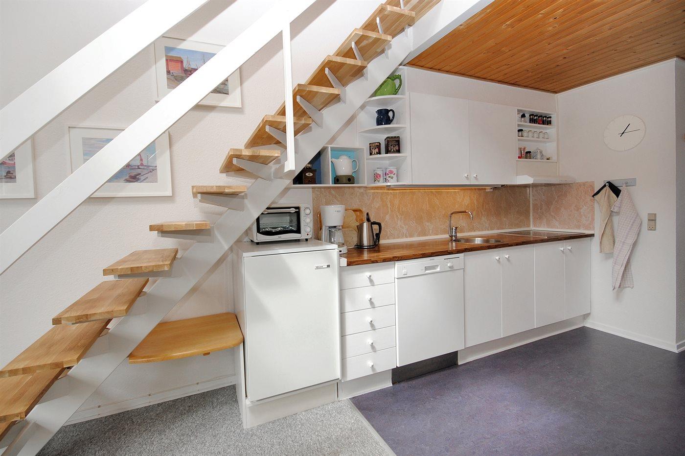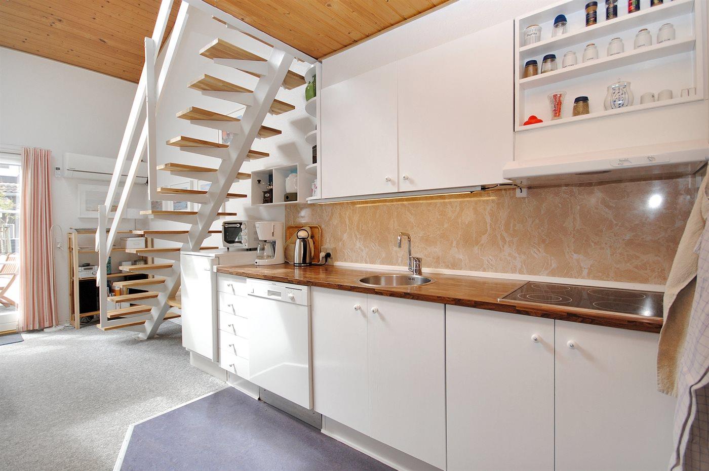 Køkkenet er udstyret med 1 køleskab. Der er 4 keramiske kogeplader, miniovn, mikrobølgeovn samt opvaskemaskine.