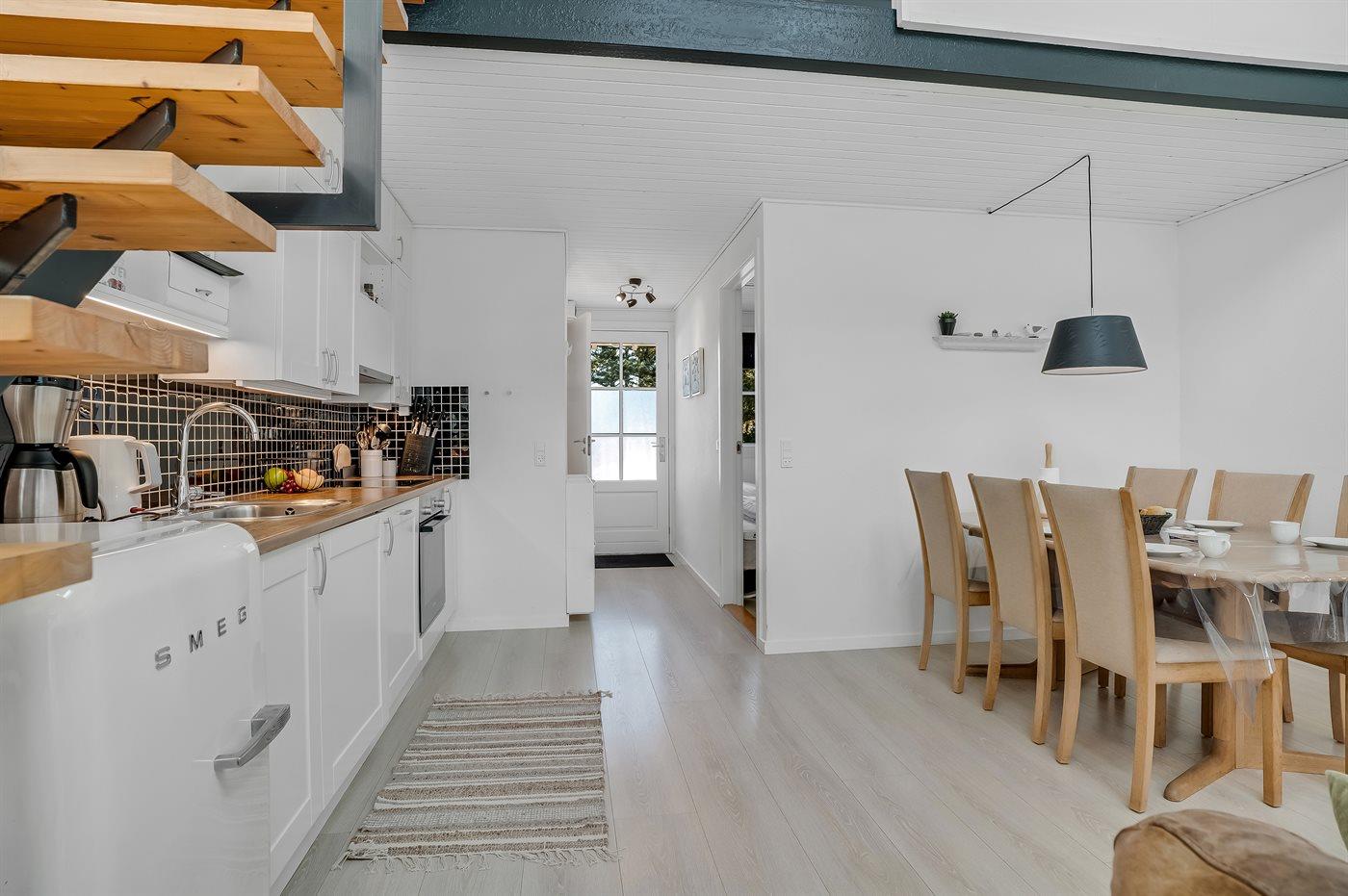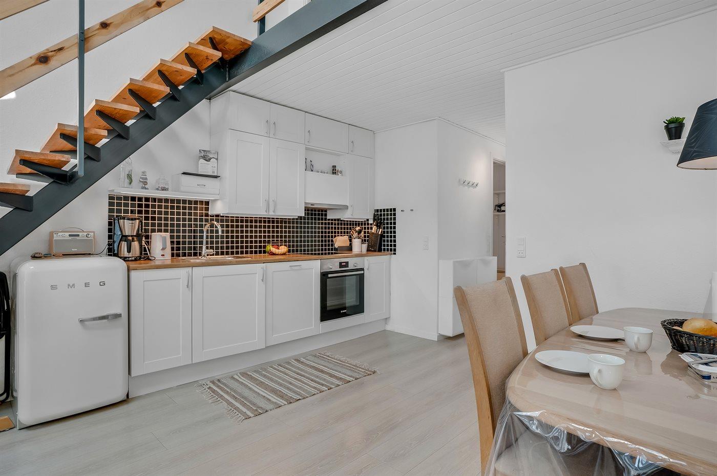 Køkkenet er udstyret med 1 køleskab. Der er 4 keramiske kogeplader, varmluftovn samt opvaskemaskine.