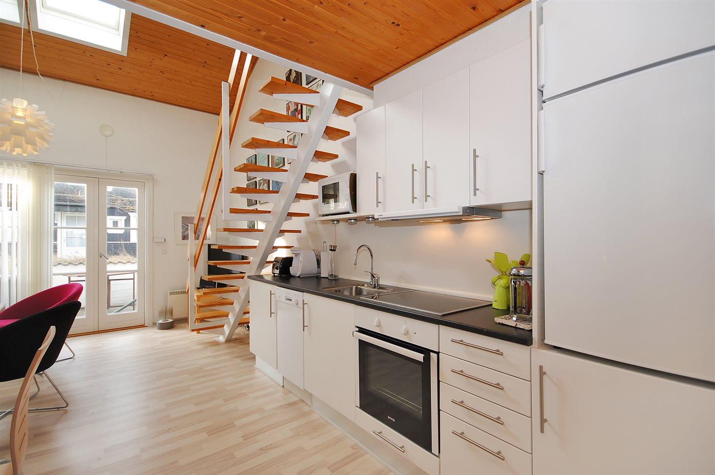 Køkkenet er udstyret med 1 køleskab. Der er 4 keramiske kogeplader, varmluftovn, mikrobølgeovn samt opvaskemaskine.