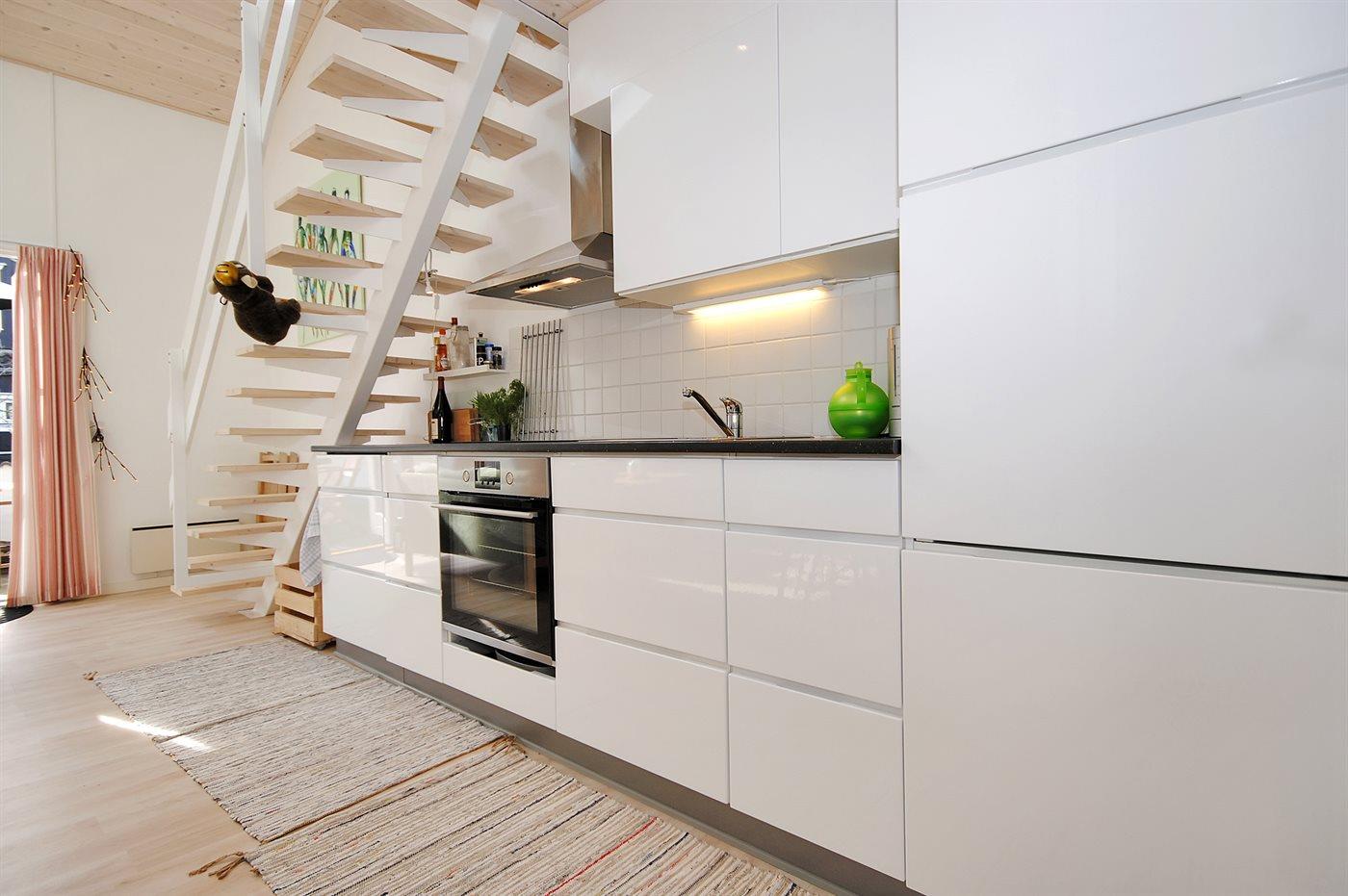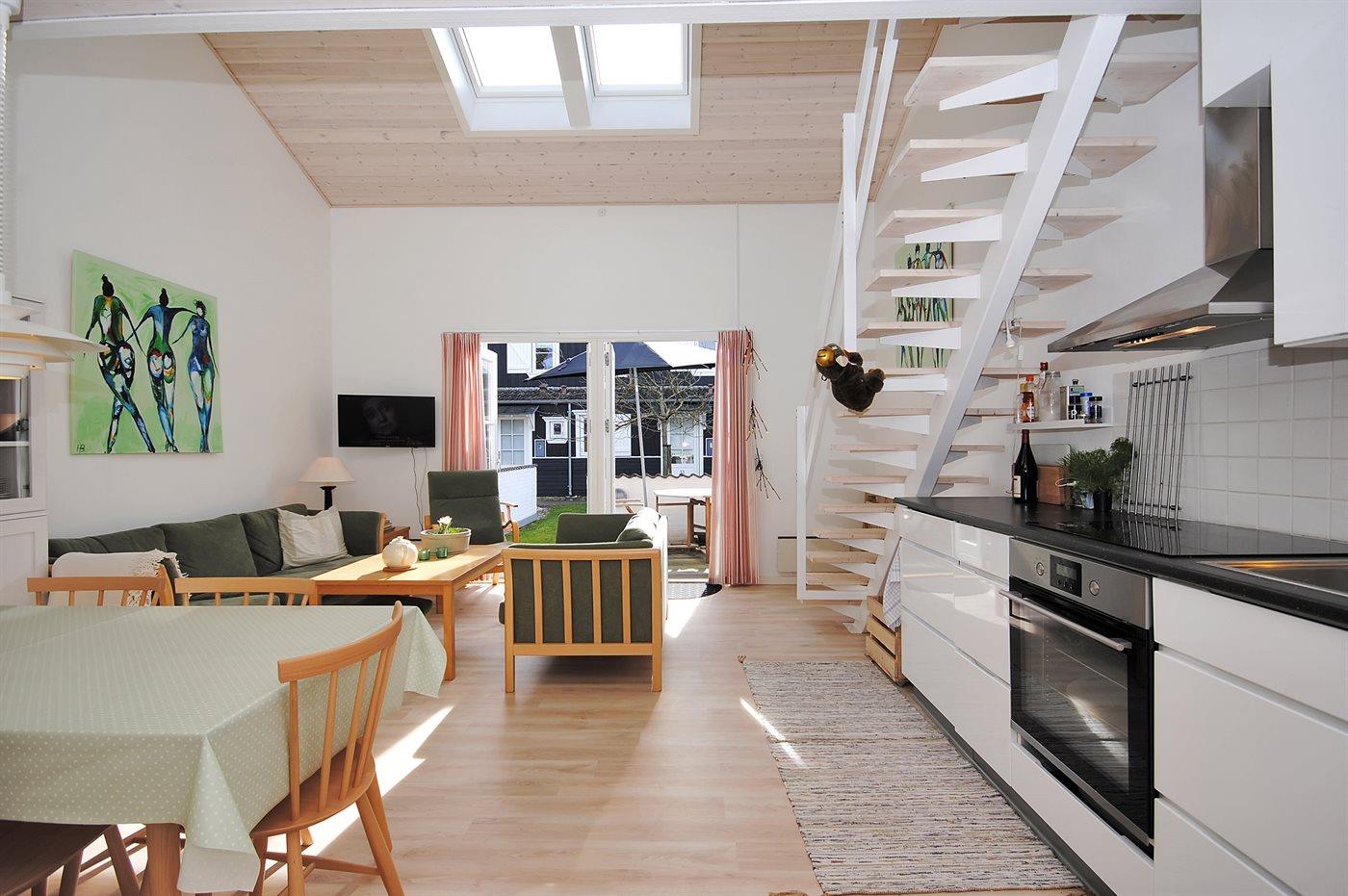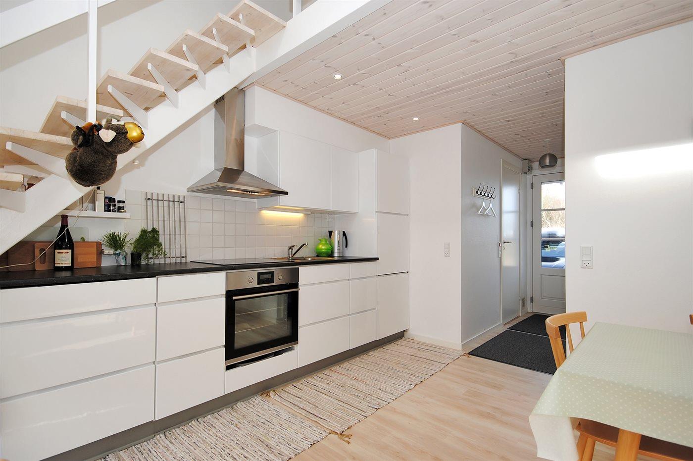 Køkkenet er udstyret med 1 køleskab. Der er 4 keramiske kogeplader, varmluftovn samt opvaskemaskine.