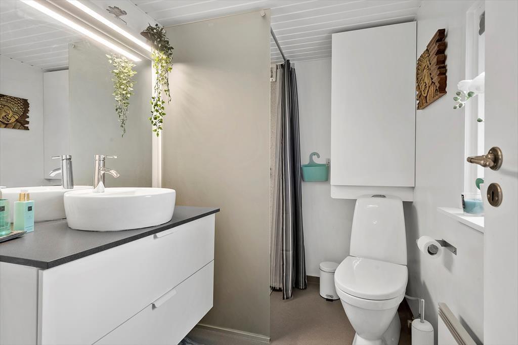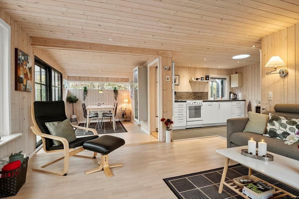 Indenfor møder du et lyst og indbydende sommerhus, hvor de store vinduespartier giver et naturligt lys og en fornemmelse af at have naturen tæt på, selv når du opholder dig inde. Havestuen fungerer som et blødt mellemrum mellem ude og inde, og den bliver hurtigt et sted, hvor I samles i løbet af dagen. Måske med en kop te, et godt spil, en hyggelig snak eller blot stille tid med en bog. Køkken og stue ligger i åben forbindelse med hinanden, så hverdagsrutiner falder naturligt ind i samværet. I de tre soveværelser er indretningen enkel og venlig, så du får den ro, du har brug for. Det er nemt at lande her og føle, at du hører til allerede fra første øjeblik.