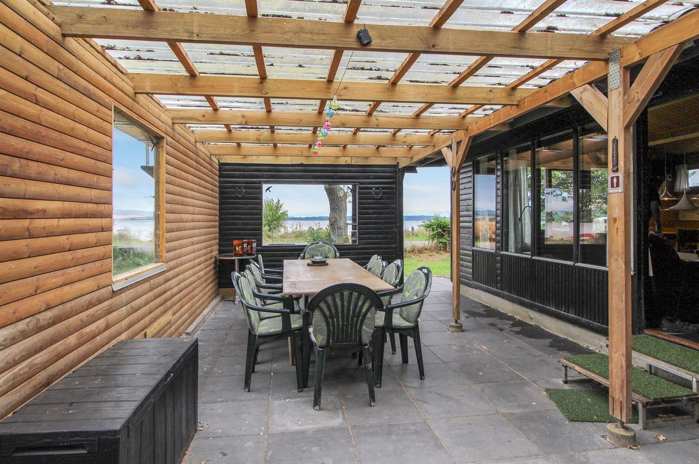 Ældre sommerhus i træ beliggende på en stor naturgrund med træer, direkte ved Mossø med udsigt over søen.