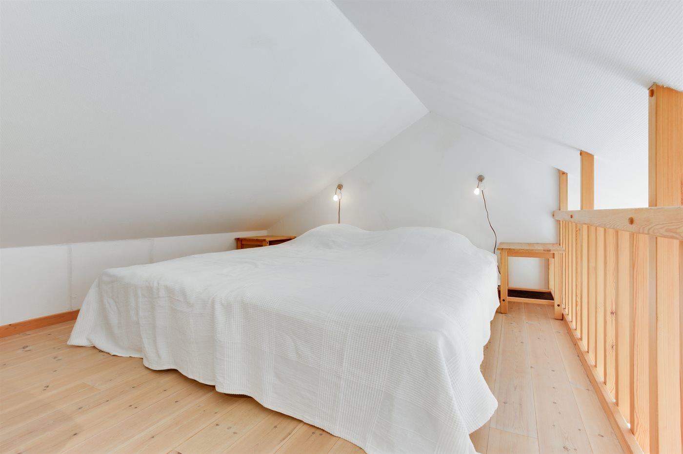Sovepladserne fordeler sig på:2 sovepladser i dobbeltseng. 2 sovepladser i sovesofa (dobbelt). 2 af disse sovepladser befinder sig i opholdsstuen og 2 af dem befinder sig på hemsen.
