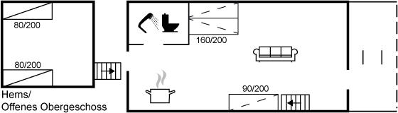 Ferieboligen er på 34 m² fordelt over stueplan og hems. På hemsen er der to enkeltsenge. I stuen findes 2 enkeltsenge sat sammen som dobbelt senge 200x160. Til de små er der en højstol og en rejseseng. Ferieboligen er udstyret med en energibesparende varmepumpe. Til ferieboligen hører et eget terrasseareal.