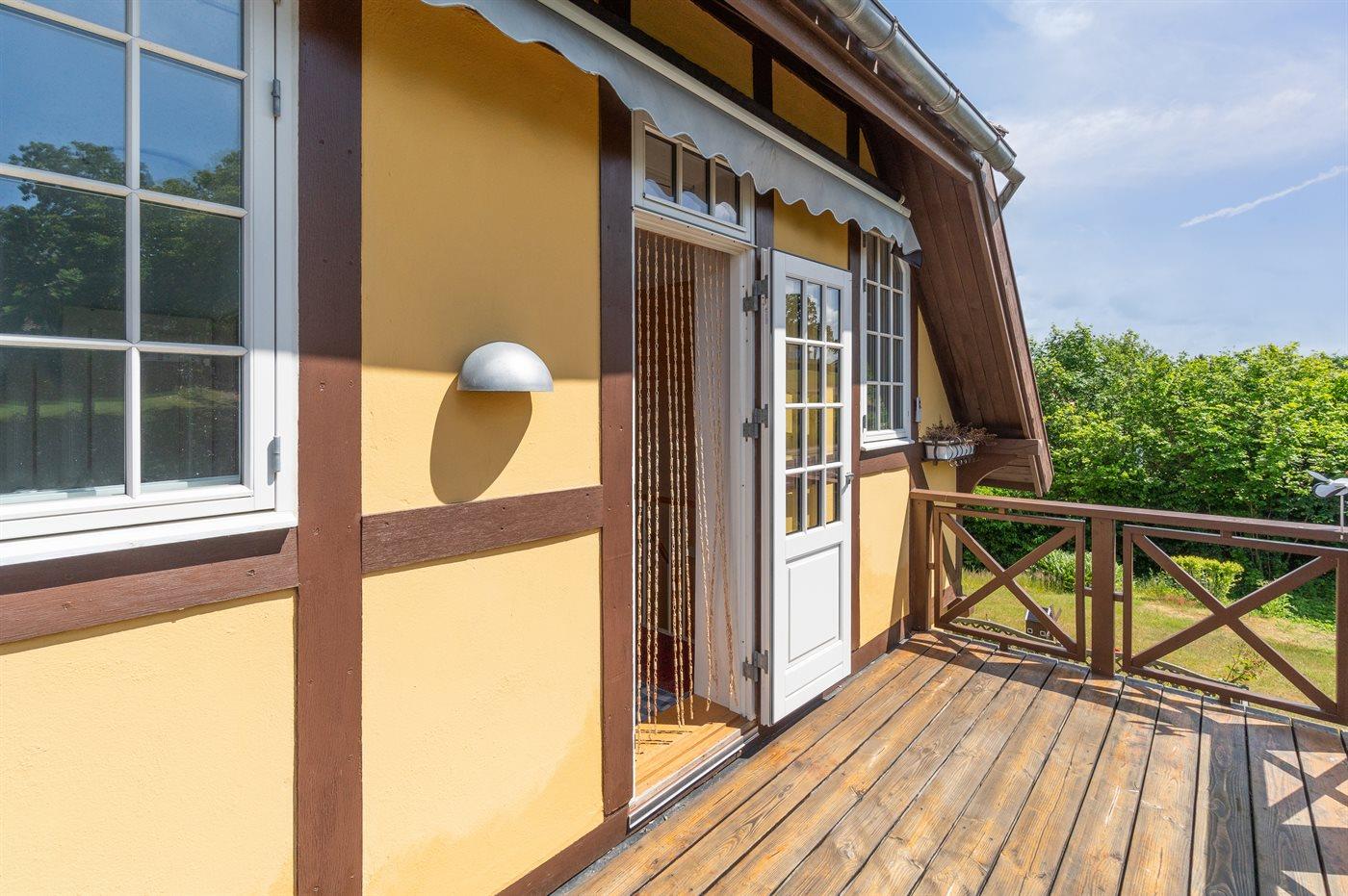 Sommerhuset er i 2 plan, og byggestilen er ganske særlig, så man netop får fornemmelsen af et eksklusivt beliggende feriehus. Fra panoramavinduet i stuen er der den fineste udsigt ned over grunden og ud til havet, så når man dvæler ved brændeovnens hyggelige varme, så er det svært at koncentrere sig om bare at læse en god bog, fordi udsigten fænger. I det store soveværelse på 1. sal kan døre åbnes til den franske altan, så man også får den fulde fornøjelse af udsigten.