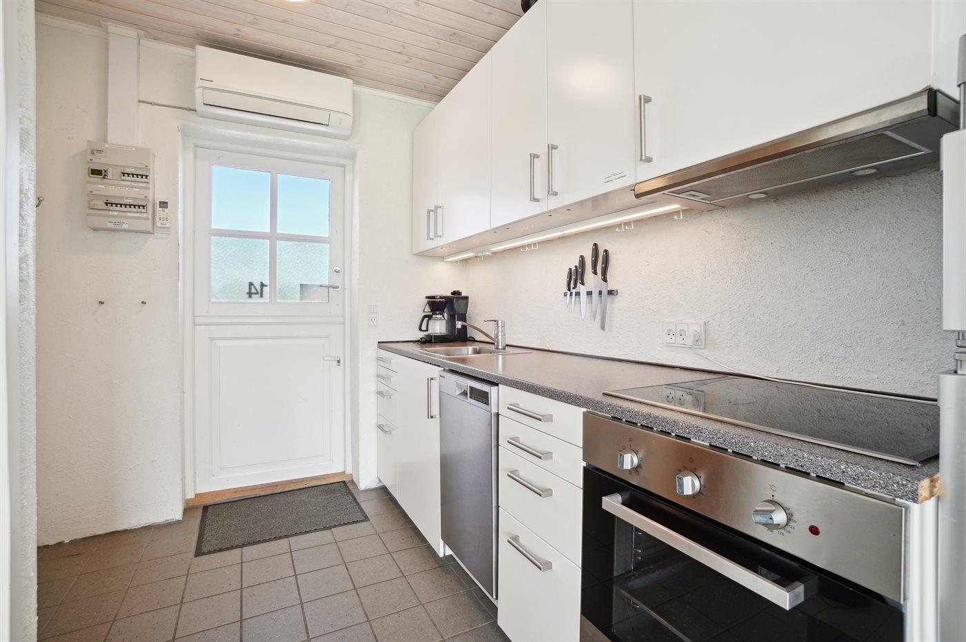 Køkkenet er udstyret med 1 køleskab. Der er 4 keramiske kogeplader, varmluftovn, mikrobølgeovn samt opvaskemaskine.