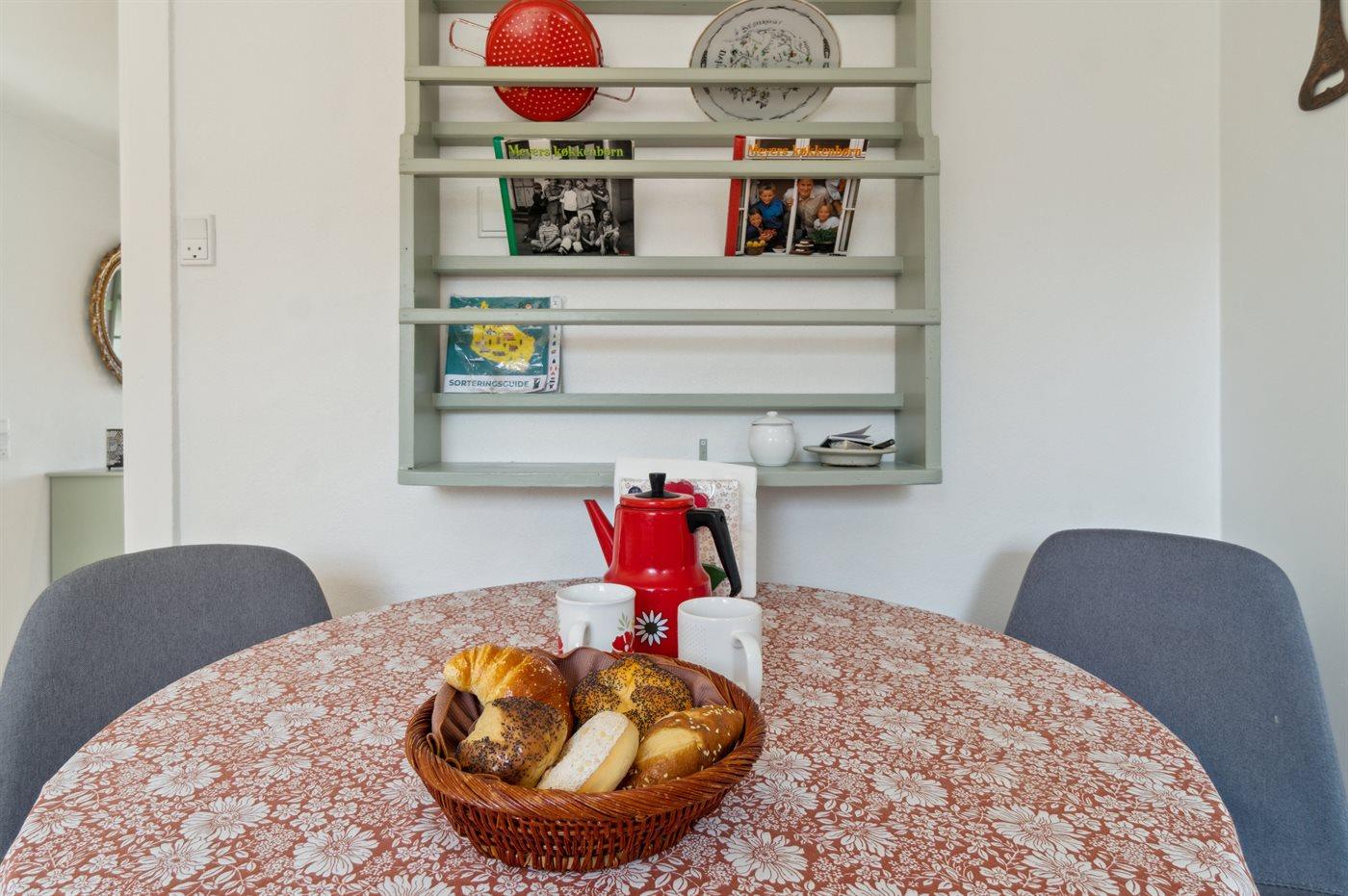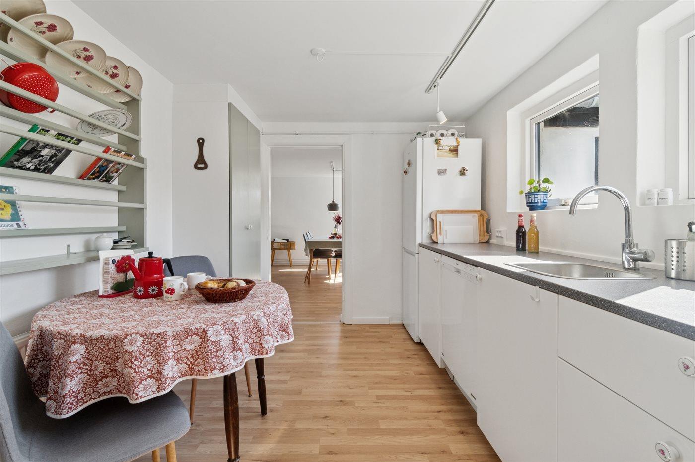 Køkkenet er udstyret med 1 køleskab. Der er 4 keramiske kogeplader, varmluftovn, mikrobølgeovn samt opvaskemaskine.