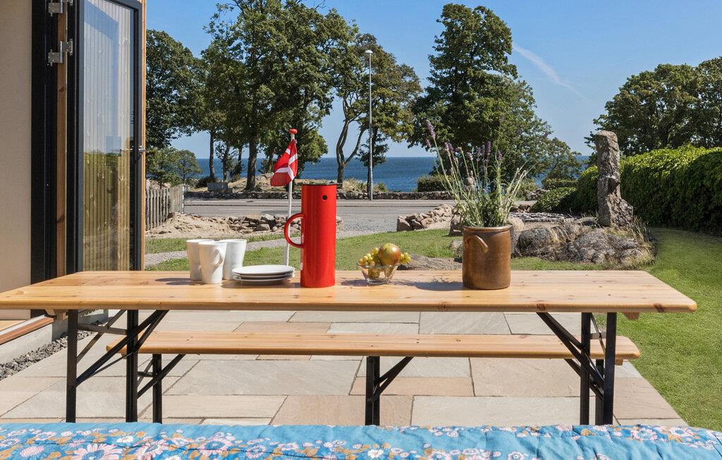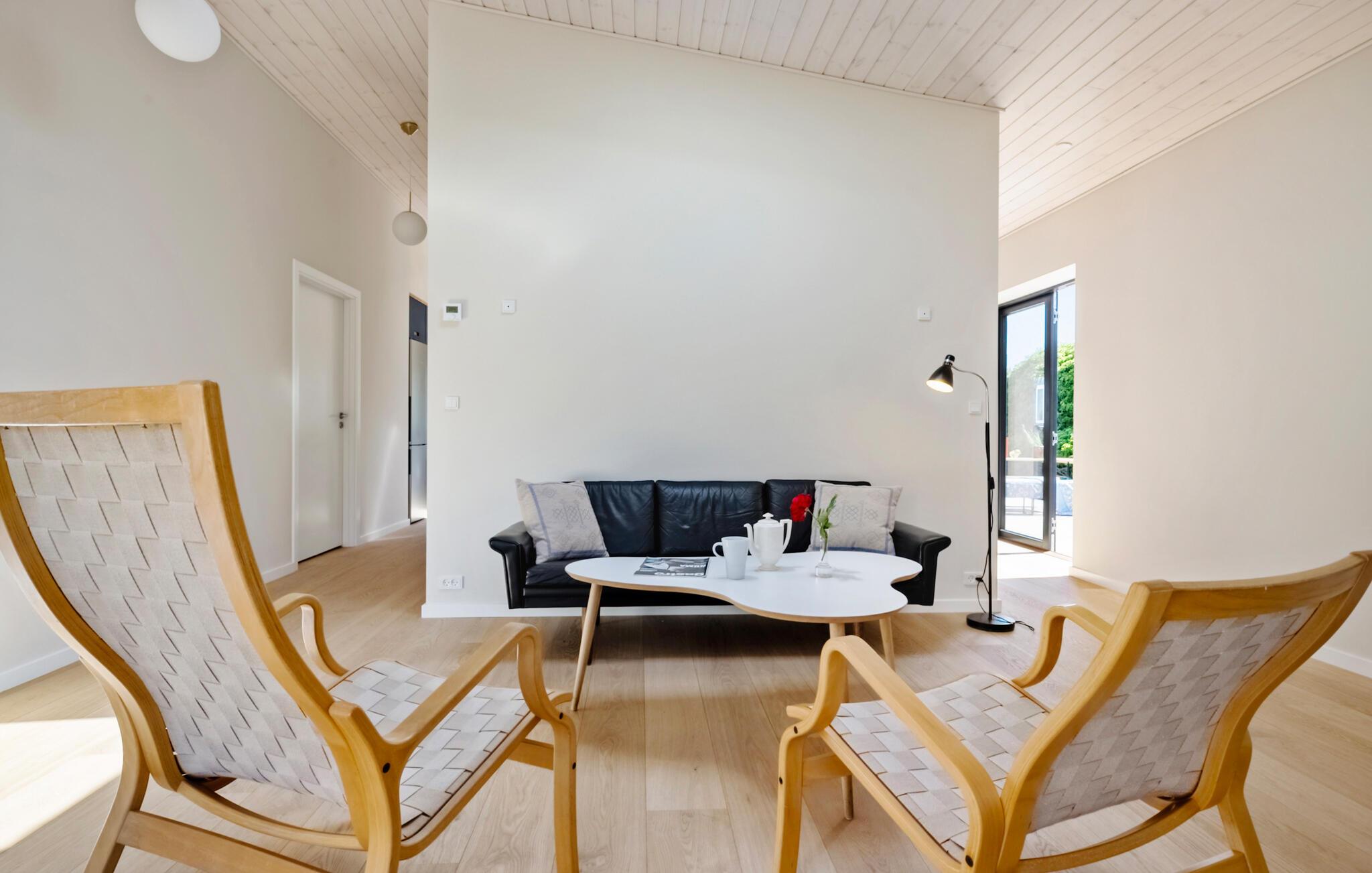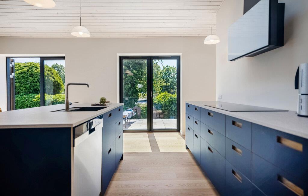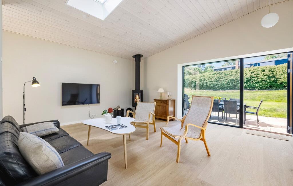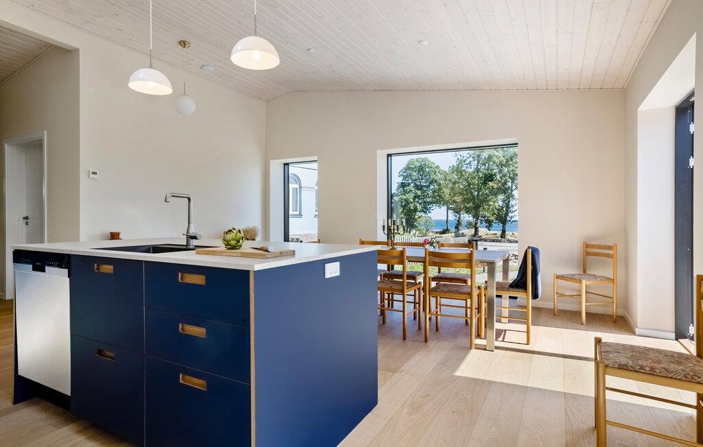 Tilbring en afslappende ferie i dette arkitekttegnede feriehus med havudsigt på Bornholm. Huset ligger tæt på kysten og tilbyder en vellykket kombination af enkel skandinavisk elegance og en hjemlig atmosfære. Interiøret er åbent og moderne. Slap af i sofaen foran brændeovnen eller planlæg jeres dag i det hyggelige siddeområde med udsigt over det grønne. Det stilfulde køkken-alrum smelter elegant sammen med rummet og lægger op til at nyde hyggelige madlavningsaftener. De store vinduer bader huset i naturligt lys og har udsigt over havet.