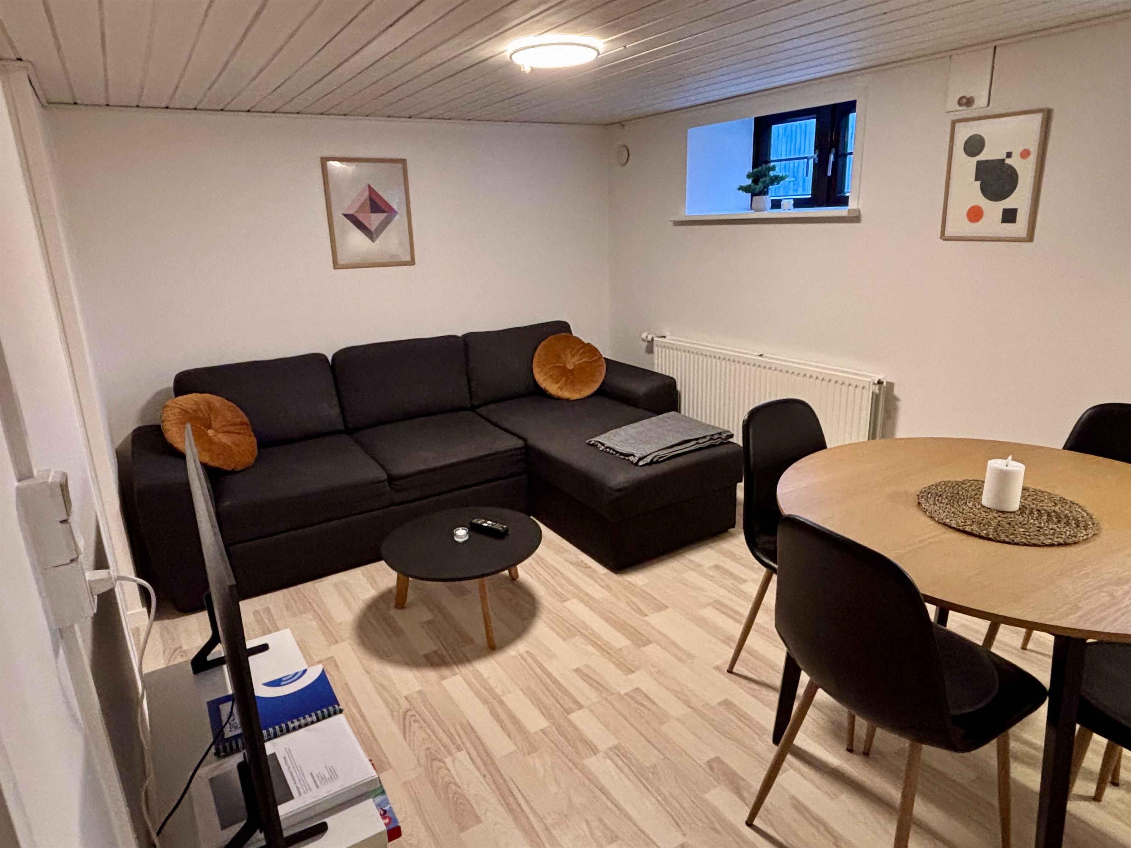 Praktisk og velbeliggende feriebolig ved Tejn havn med egen carport og egen indgang. Vores feriebolig er en hyggelig lejlighed, som ligger I husets velindrettede kælder. Det er ideelt til dig, som søger en funktionel og godt beliggende base på Bornholm. Boligen er velegnet til alt fra én til fire personer. Ideel til familie eller par, der ønsker en ferie med nem adgang til natur, hav og byens faciliteter. Lejligheden består af to værelser: Et opholdsrum med en sovesofa, der kan rumme to personer, og en spiseplads med plads til fire personer. Det andet værelse har to enkeltsenge, hvor familiens børn med fordel kan indlogeres. Køkkenet er lille, men praktisk indrettet med kogeplader, emhætte og en mindre kølefryseskab samt miniovn, så der kan laves mad under sit ophold. Der er også en lille spiseplads til tre personer. Ideel til de morgenfriske, som vil nyde morgenkaffen uden at forstyrre dem som stadig sover. Beliggenheden ved Tejn havn er praktisk og gør det let at udforske området. Brugsen ligger lige overfor, så du har altid indkøbsmuligheder tæt på. Tejn havn byder på en hyggelig atmosfære, og der er kort afstand til mange af Bornholms attraktioner som Helligdomsklipperne og Allinge. Dette er en feriebolig for dig, der ønsker en enkel og bekvem base på Bornholm med nem adgang til både natur og lokale faciliteter. Vi glæder os til at byde dig velkommen! Obs, udlejes ikke til erhversmæssigt brug.
