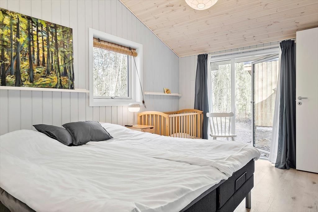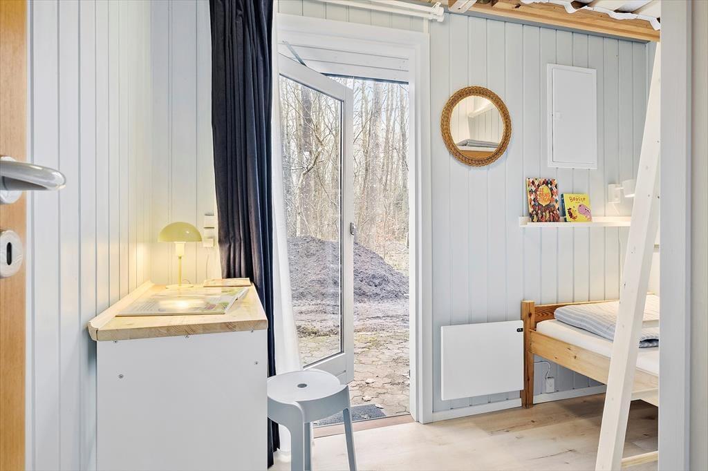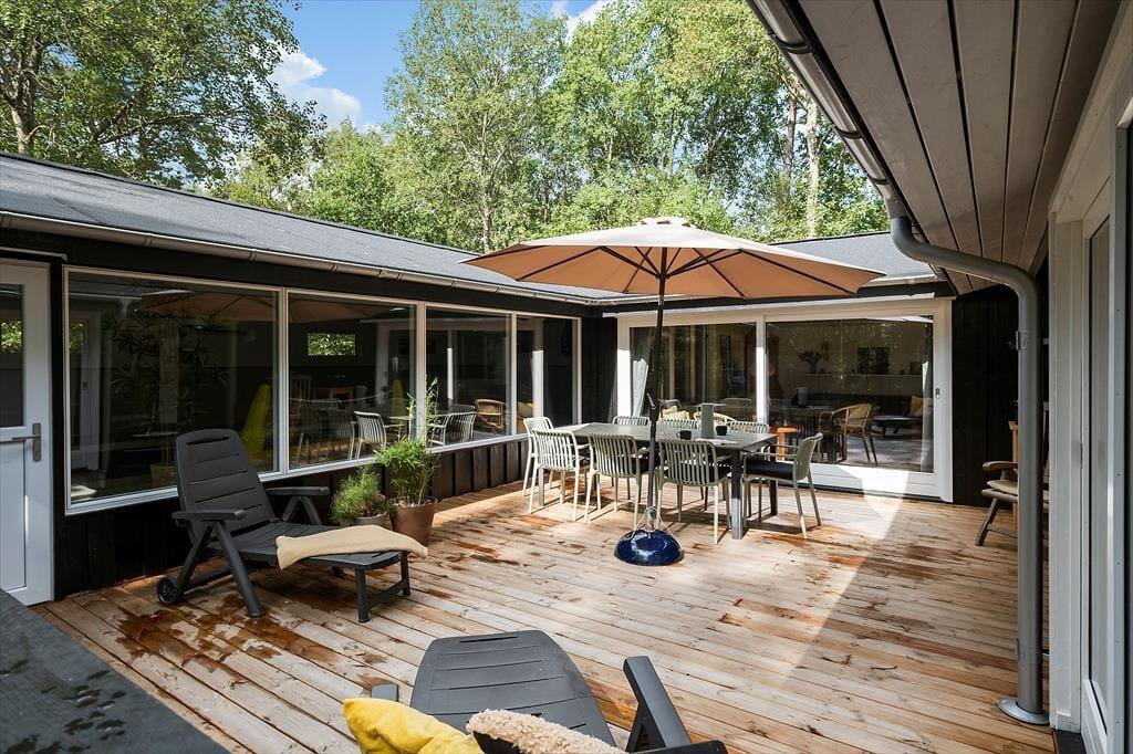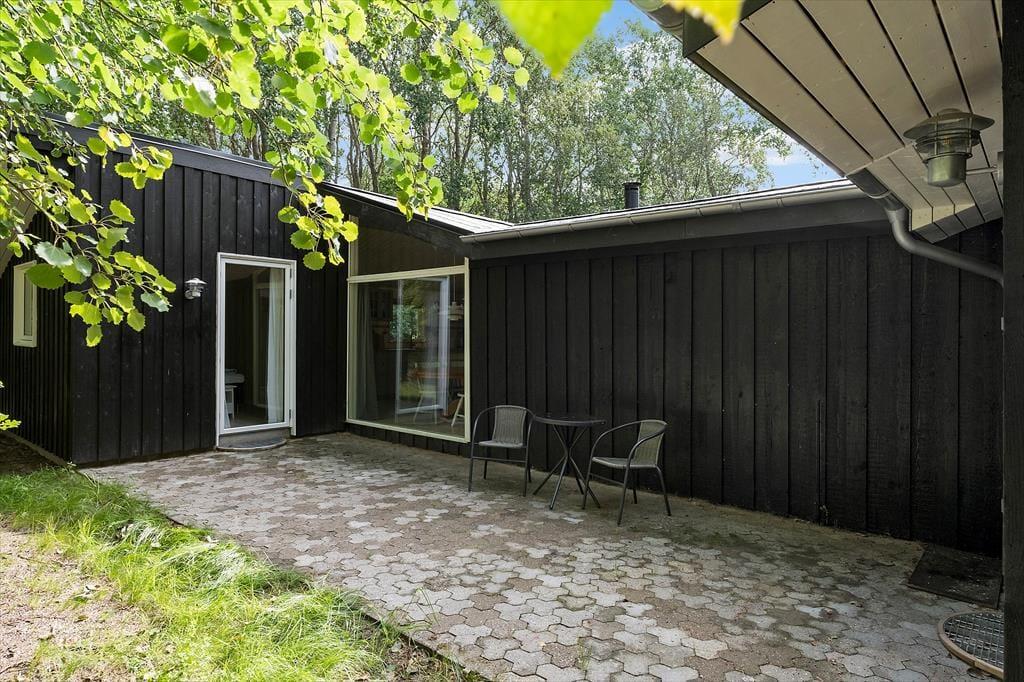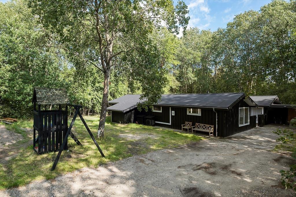 Mellem sommerhusets længer finder du et ugeneret terrasseområde, hvor du kan nyde det gode vejr i læfyldte og ugenerede omgivelser. Måske kan du høre fuglesang fra oven, når du sidder her – og hvis du bliver sulten, kan du tænde for grillen og lade duften af nytilberedte lækkerier sprede sig. Er der børn i familien, er det rart at have både en sandkasse og gynge til rådighed, og det kan også være, at de yngste feriegæster kan få overtalt de voksne til at lege gemme mellem træerne på den 1724 m2 store naturgrund. Ankommer du i elbil, er der mulighed for at lade den op ved sommerhuset.
