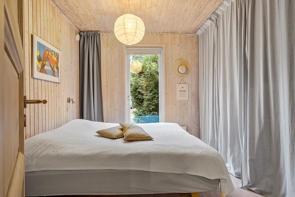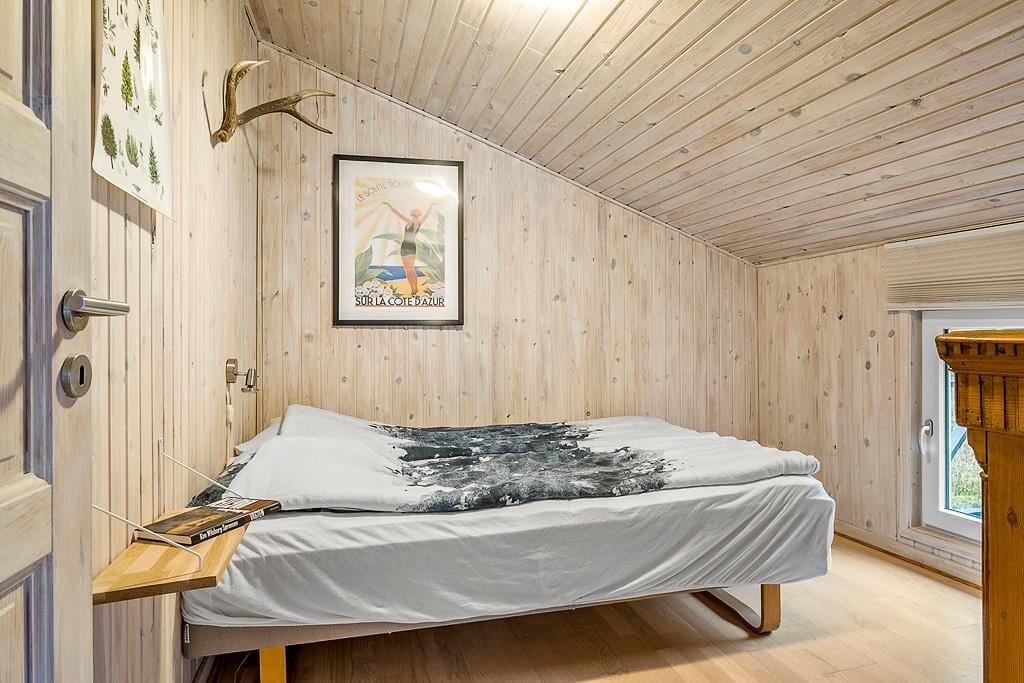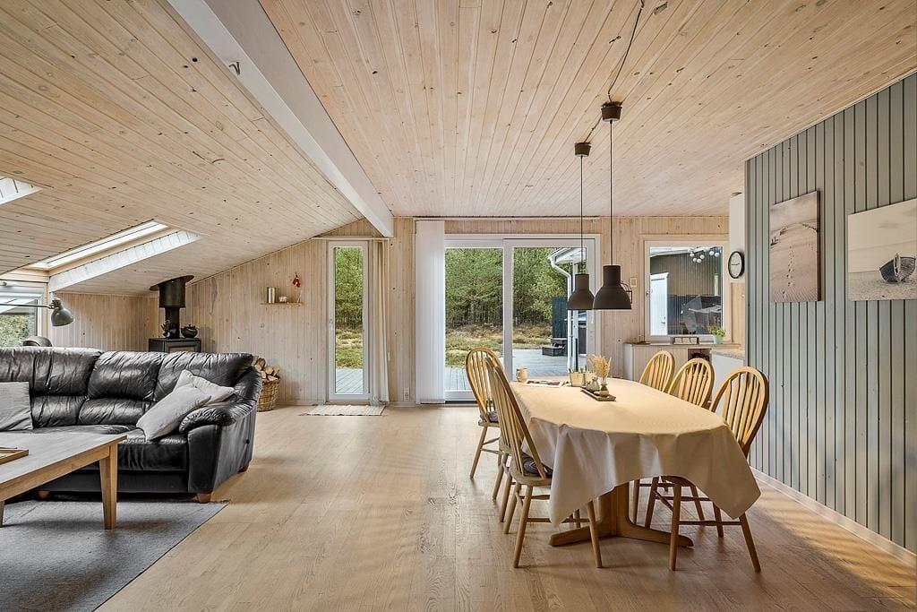 Dette velindrettede sommerhus byder på en lys og venlig atmosfære, der straks får dig til at føle dig hjemme. Stuen er indrettet med komfortable møbler og vinduespartier, der lader sollyset strømme ind og giver en smuk udsigt til den omkringliggende natur. Forestil dig at tilbringe aftener foran brændeovnen med en god bog eller en hyggelig film på tv'et, mens flammerne knitrer og spreder varme.