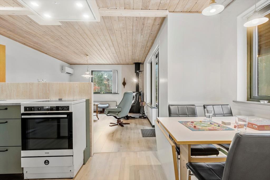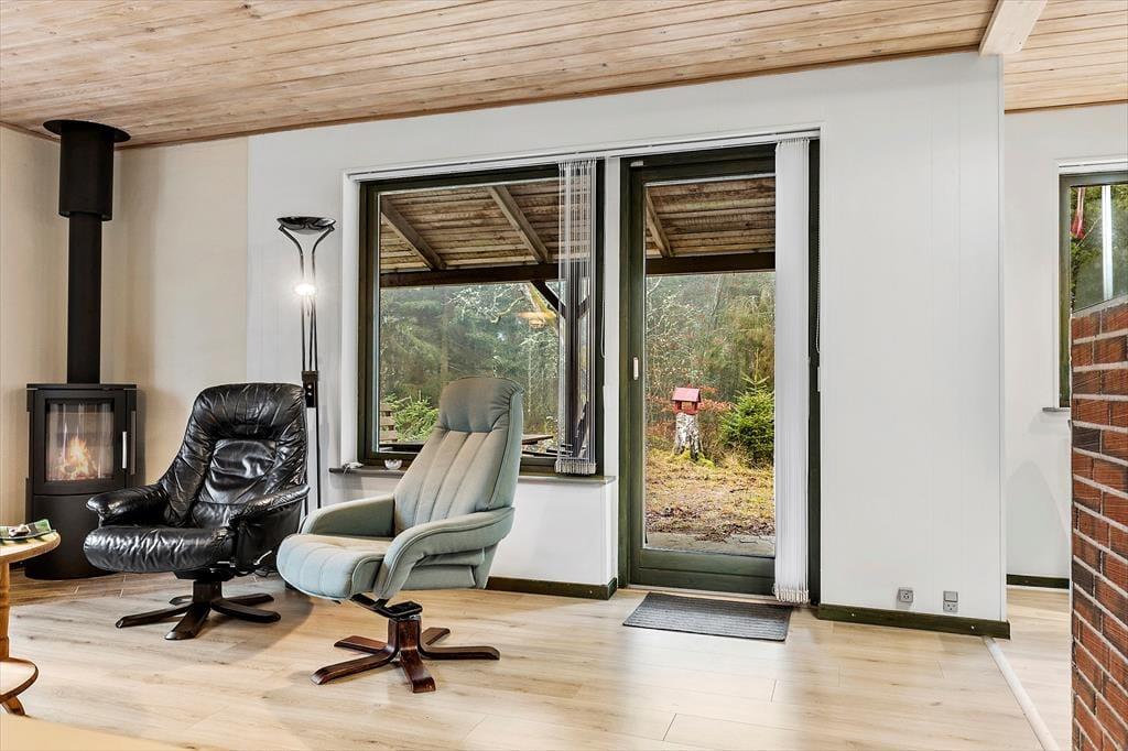 Dette solide murstenshus byder dig velkommen med en varm og indbydende atmosfære. Indenfor mødes du af et åbent rum, hvor køkkenet smelter sammen med stuen, hvilket skaber et lyst og rummeligt opholdsområde. De gode møbler indbyder til afslapning, og på kølige aftener kan du tænde op i brændeovnen, lade flammerne danse og skabe en hyggelig stemning, mens du nyder en god bog eller samvær med dine nærmeste.