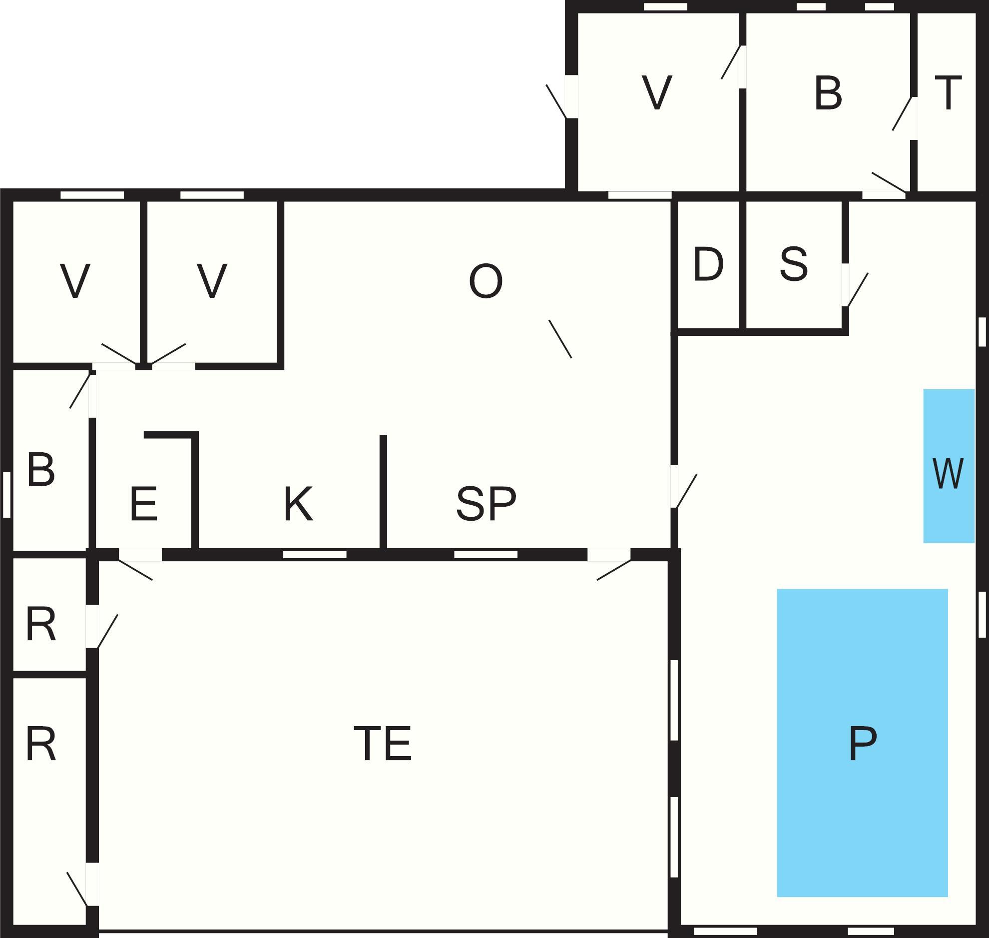 Sommerhuset er indrettet med to soveværelser med kontinentalsenge og et værelse med fire køjesengspladser samt sovesofa i stuen. Der er to badeværelser med toilet og bruseniche. Der er gulvvarme i hele huset.