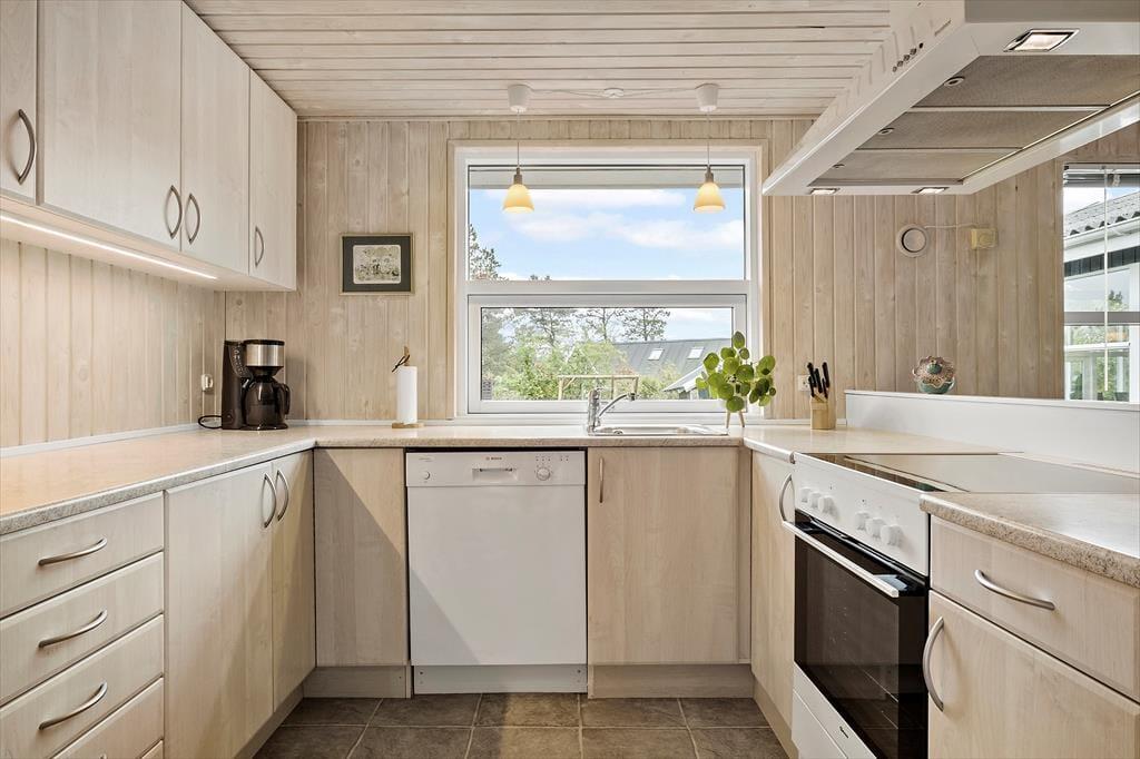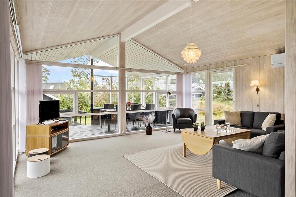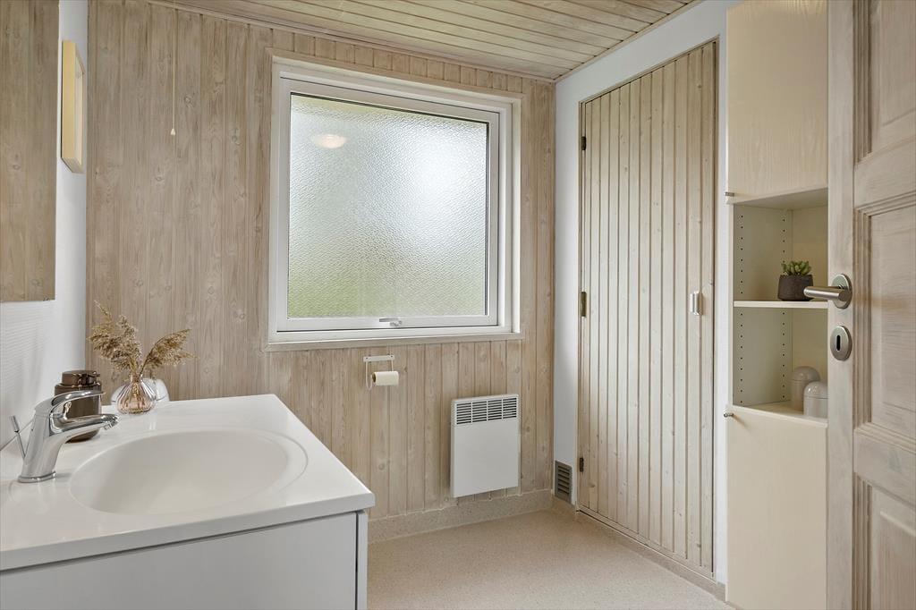 Sommerhuset er et stort og velindrettet eksemplar på 95 m2, der kort fortalt byder på tre soveværelser, et badeværelse, en entré med vaskefaciliteter samt en stue med integreret køkken. Trænger I mest til at slappe af inden døre, kan det blandt andet foregå i badeværelsets sauna, hvis ikke I hellere vil samles i stuen for at drikke varm kakao nær brændeovnen. Mens I sidder godt tilbagelænet i sofaafdelingen, kan I nyde det dejlige lysindfald, som de store stuevinduer giver. Med TV og CD-anlæg er der mulighed for både at se film og høre musik, og i det åbne køkken kan I give jer i kast med madlavningen, hvilket også kan være en dejlig hyggestund, når der er god tid til at kokkerere.