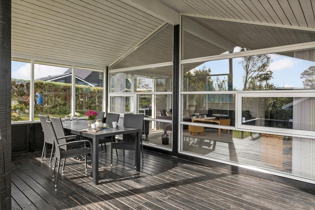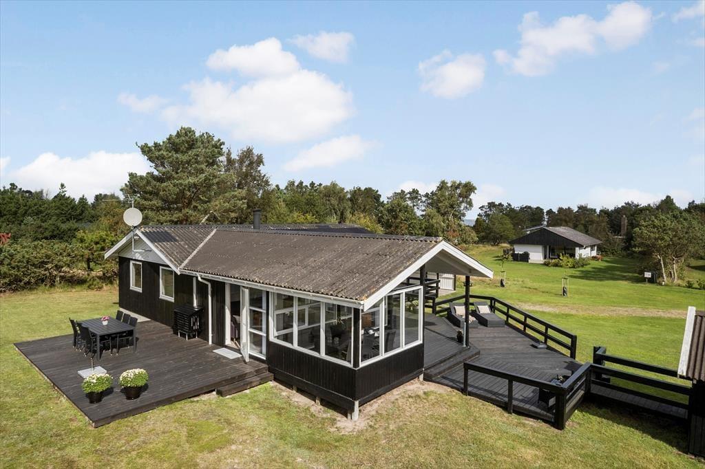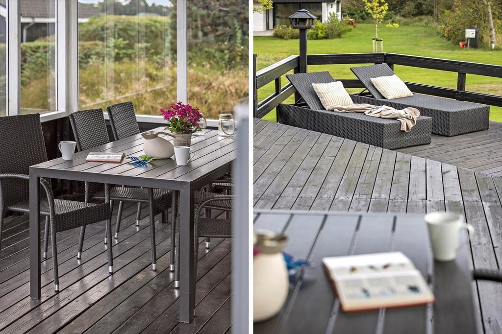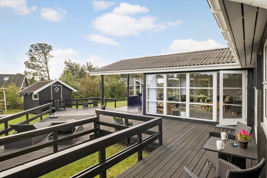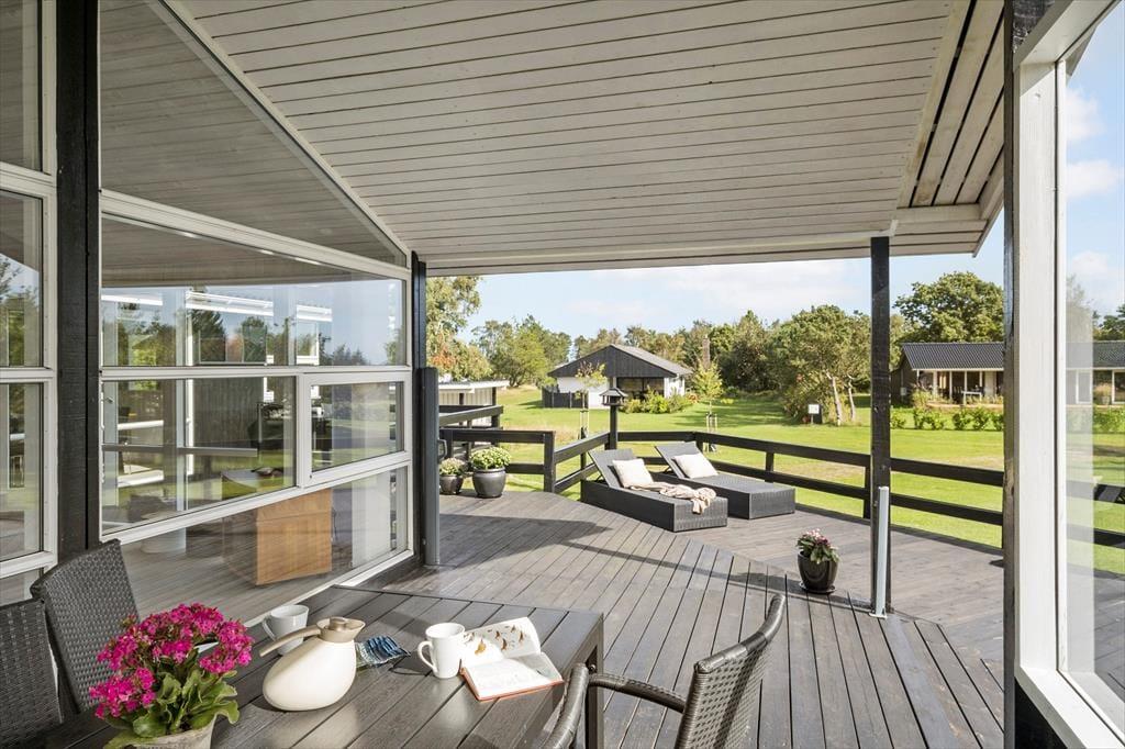 Et stort og herligt terrassemiljø breder sig syd, øst og vest for sommerhuset. Lige ved stuen ligger et overdækket og afskærmet areal, og ellers er resten af terrassen åben, så det er nemt at finde den helt rette opholdsplads alt efter vejr og humør. Vil I lege og være aktive, er der mulighed for at gynge, bygge sandslotte i sandkassen og spille fodbold på græsplænen, og der er også en mooncar til de yngste.