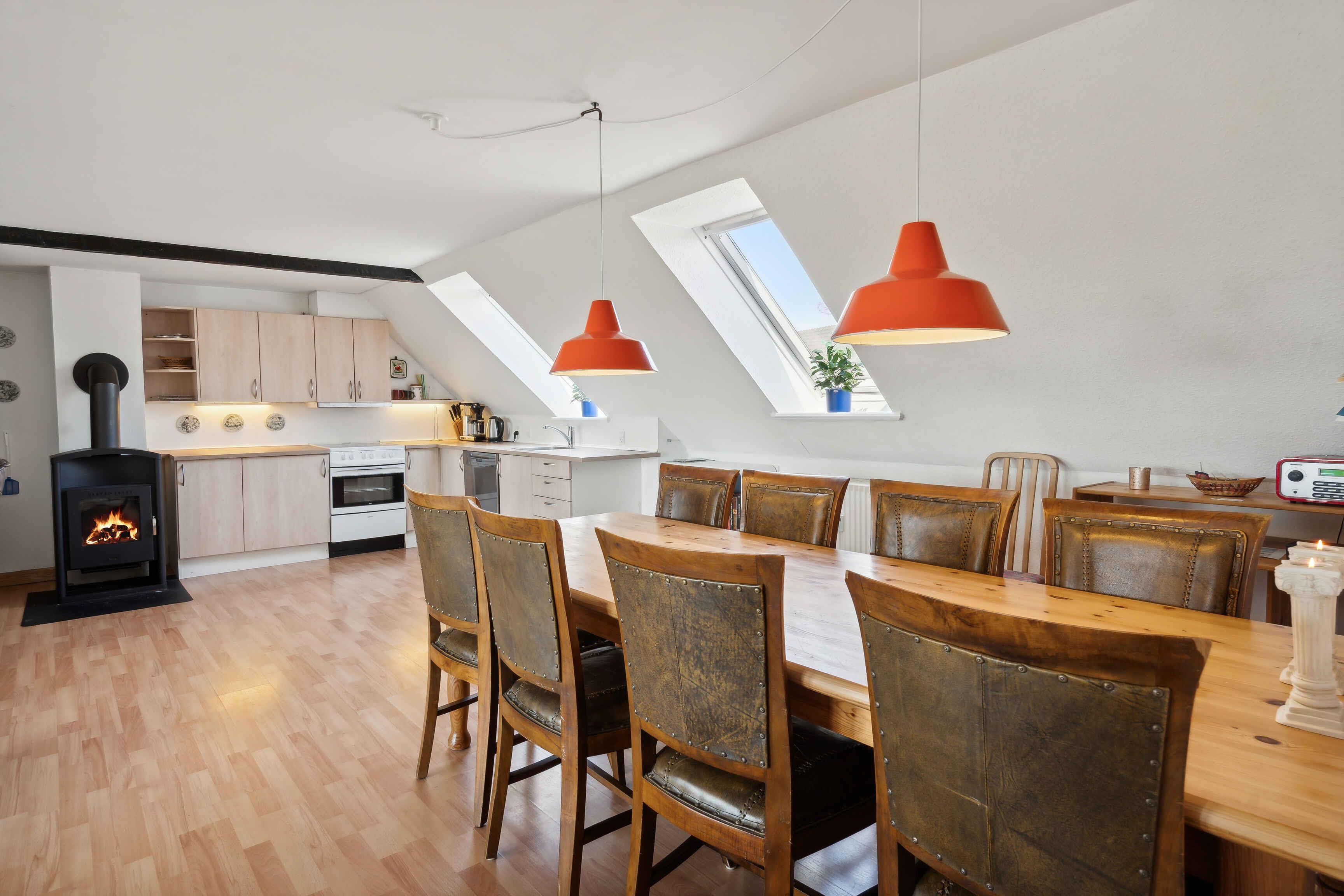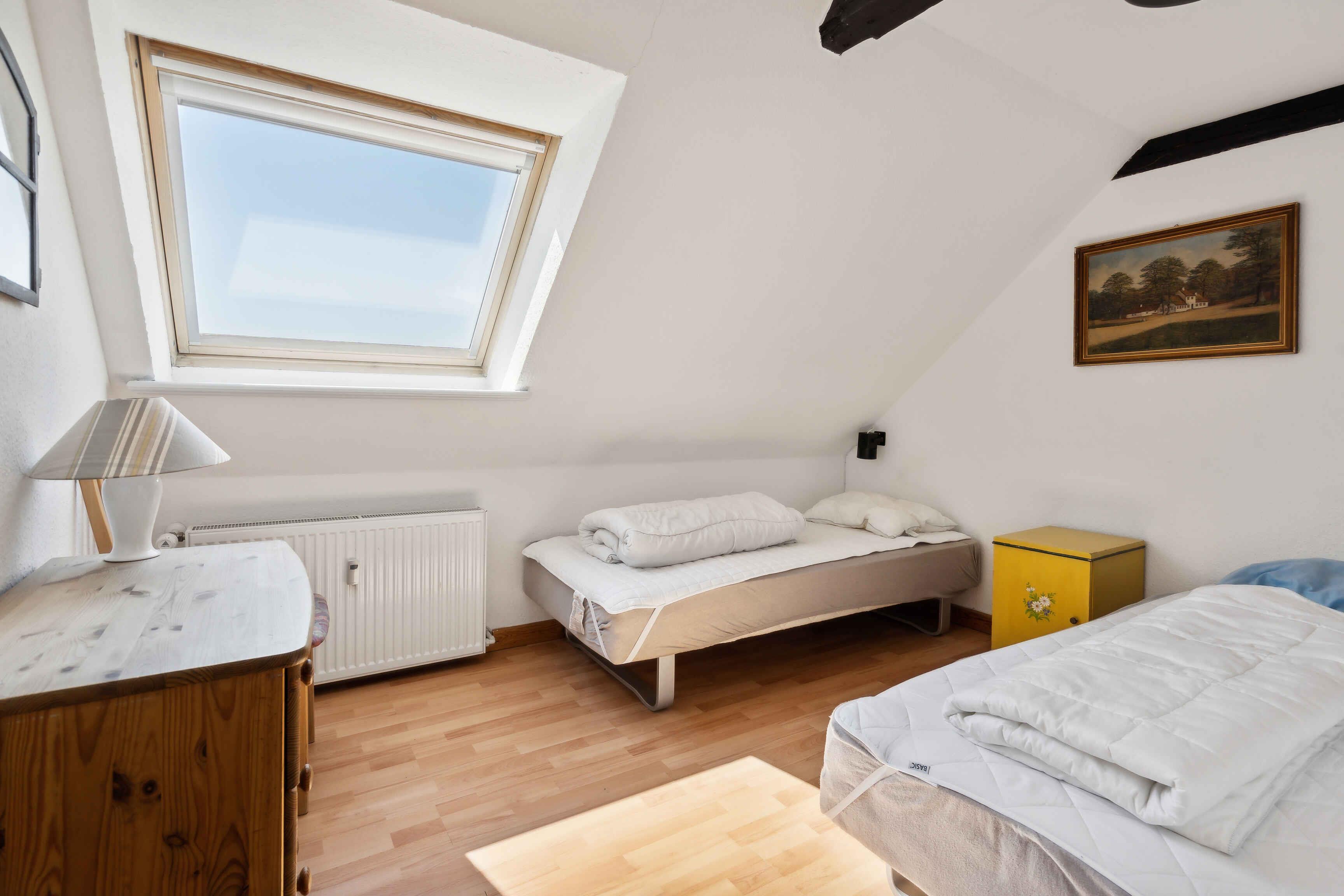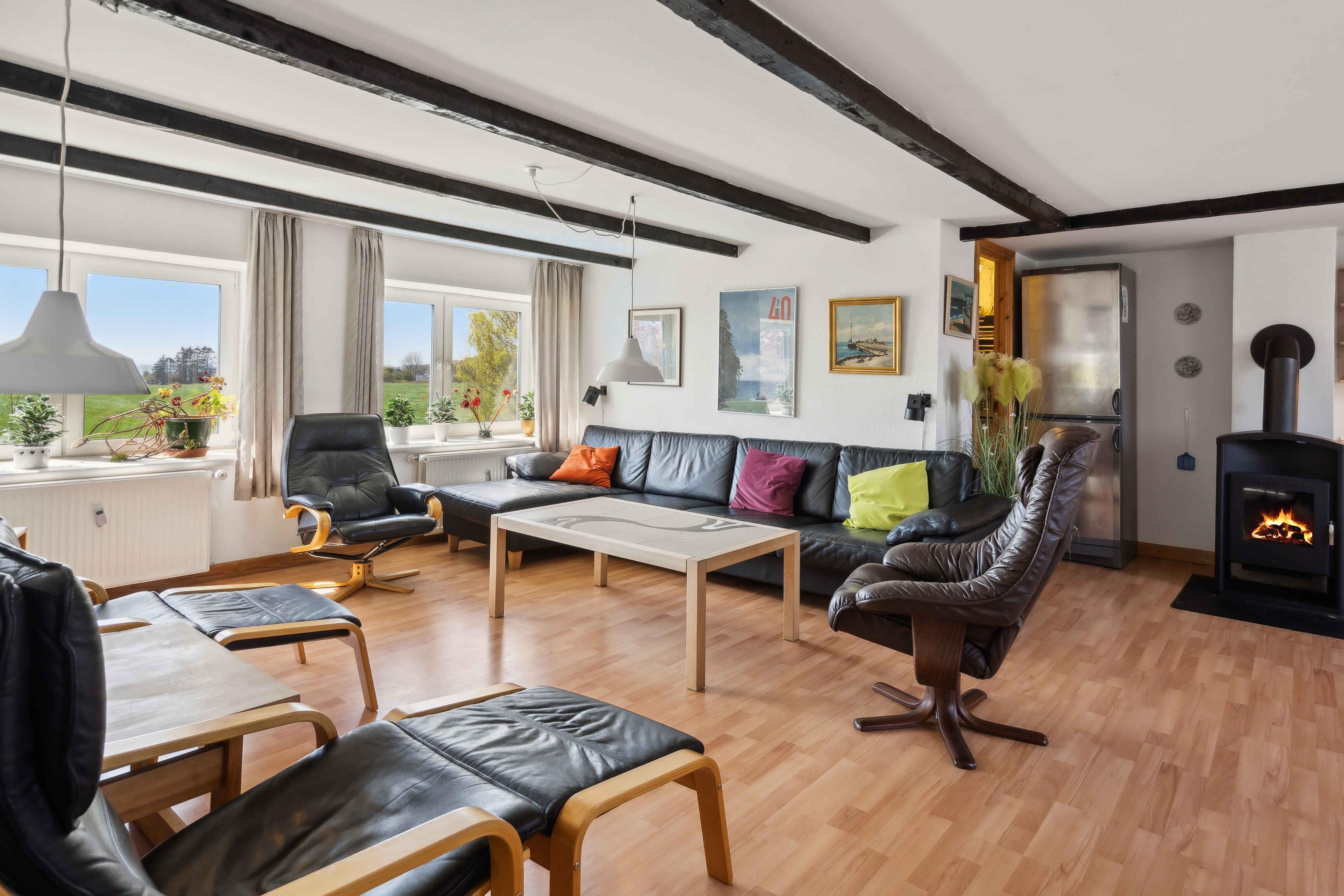 Glæd jer til en vidunderlig ferie i denne rummelige lejlighed med havudsigt. Lejligheden består af rummelig entre med god skabsplads samt en ekstra fryseret til fisk. Rummeligt badeværelse med stor bruser, vaskemaskine og tørretumbler. Der er ligeledes håndklædetørere. Fra entreen fører trappen op til 1. sal hvor en stor lys stue med åbent køkken har en flot udsigt mod syd over markerne til vandet. Der er også et mindre spisekammer. Gangen fører ned til hele fem soveværelser - hvoraf det ene har en 140x200 dobbeltseng, mens et andet har enkeltseng og de øvrige tre har to enkeltsenge hver. Således er der plads til et afslappet ophold for op til ni personer. Lejligheden er komfortabelt indrettet og har alle nødvendige faciliteter. Der er en smuk udsigt til det omkringliggende marker og havet. På kølige aftener kan I sidde i stuen og slappe af til lyden af ??de knitrende flammer fra brændeovnen. I skal ikke betale ekstra for opvarmningen i fyringssæsonen. Huset har et trådløst fiberInternet 1000/1000 WIFI, så stedet kan let bruges som hjemmekontor. Huset er også velegnet til lystfiskere, da der er gode fiskeforhold i området og ekstra fryser, hvis I fanger noget. Der er også indrettet et fællesrum til rensning af fisk med stort rustfrit stålbord med vask. Udendørs kan I se frem til at tilbringe mange dejlige timer i solen og den friske luft hvor i også kan tilberede lækre retter fra grillen. Stranden kan let nås til fods eller på cykel. En tidligere garage er blevet omdannet til et hyggeligt opholdsrum med borde og stole. Det kan bruges som rygerum eller indendørs fiskerensningsområde. I kan købe ind i Skovby (4 km) , hvis I ikke vil tage en tur til Høruphav (4 km) eller Sønderborg ( 10 km), hvor der er et bredt udvalg af butikker og hyggelige restauranter. Den meget populære Gendarmsti løber kun 1 km fra huset. Øens absolut bedste badestrand Kerneland ligger kun ca 6 km væk. Til oplevelsesparken Danfoss Universe er kun 23 km- Tilbring en vidunderlig ferie i denne skønne lejlighed med havudsigt FESTER ER IKKE TILLADT