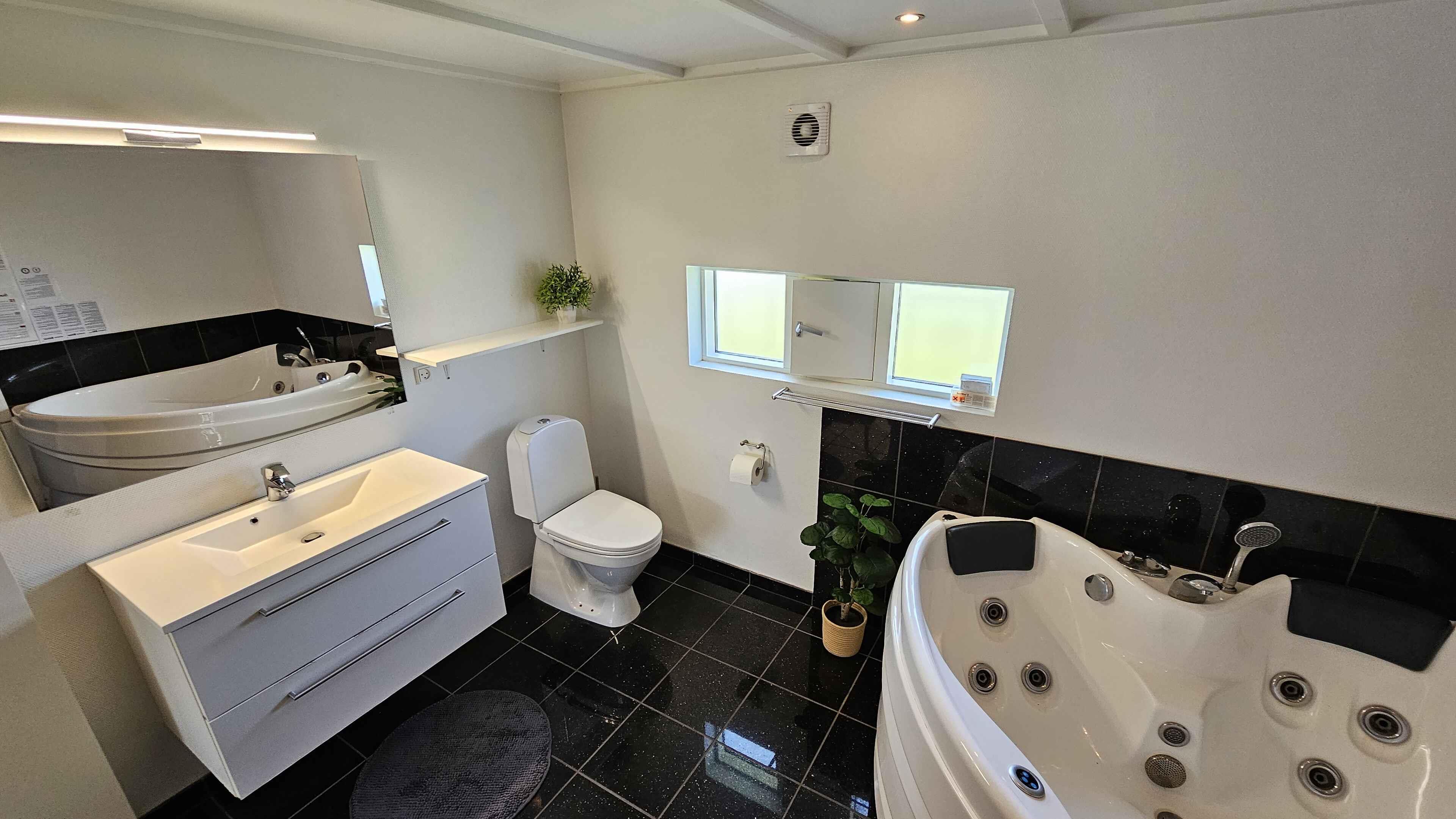 Hyggeligt og moderne sommerhus ved Skovmose med spabad, sauna og tæt på børnevenlig sandstrand.