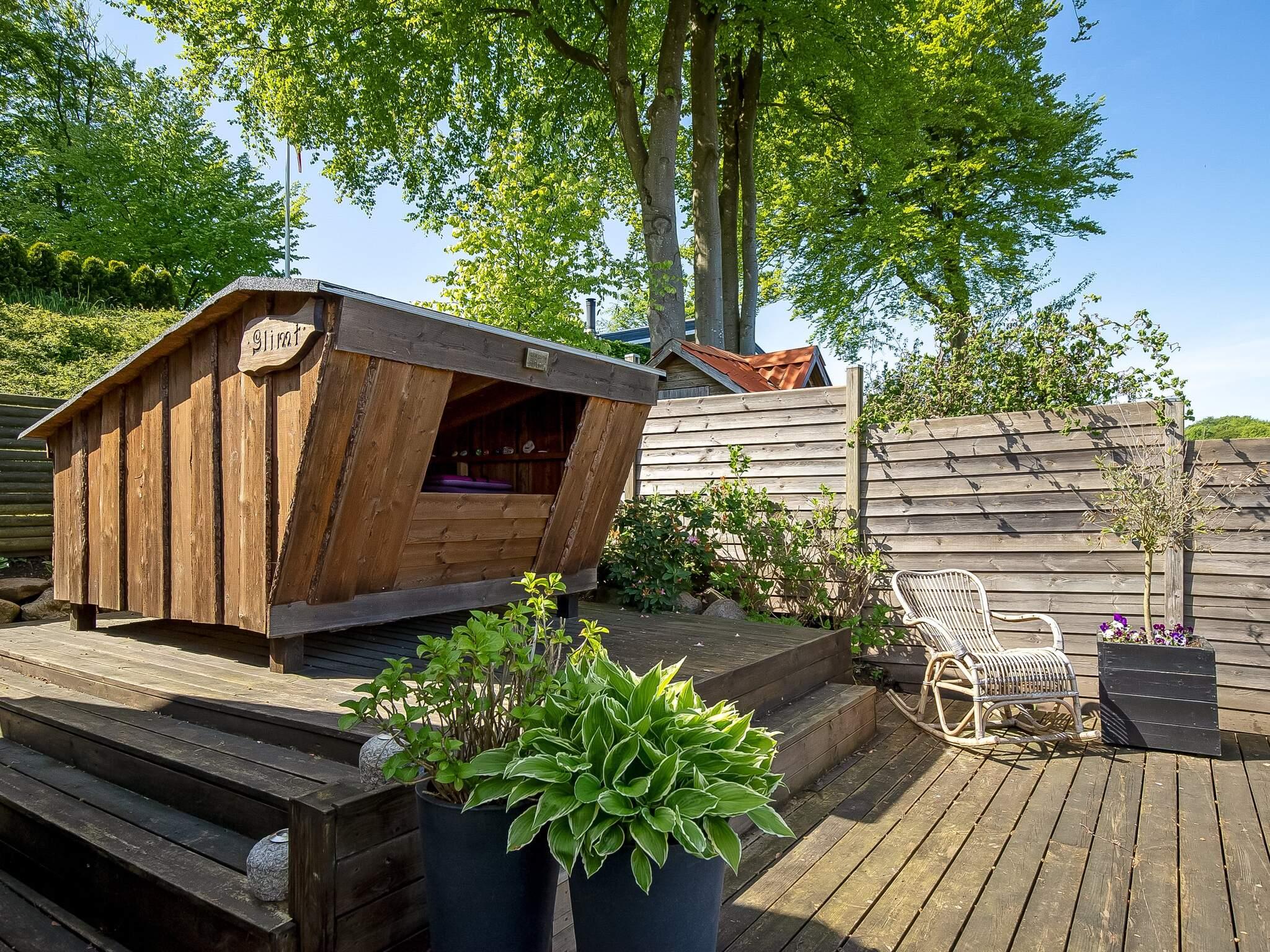 For dem, der nyder udelivet, har huset et veludstyret udekøkken og en forfriskende udendørs bruser. Derudover er der et rustikt shelter med plads til tre overnattende gæster - perfekt til eventyrlystne børn eller stjerneklare sommernætter. Uanset om du er på udkig efter komfort, natur eller et unikt sted at slappe af, er dette feriehus en sand perle ved bredden af Vejle Fjord.