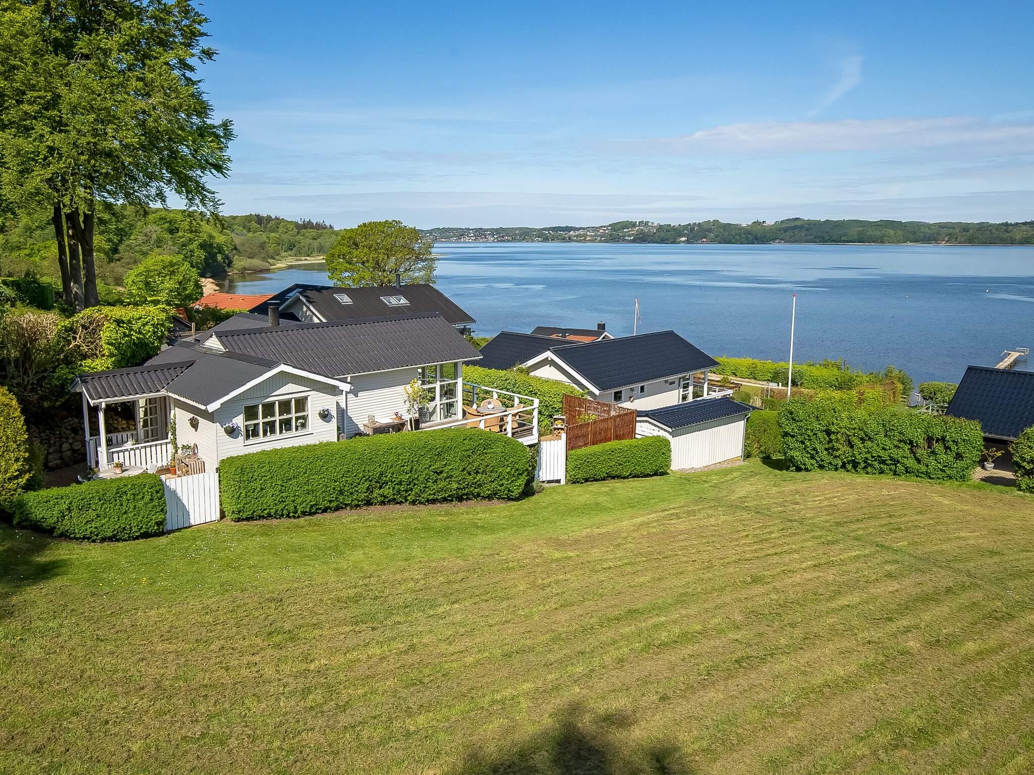 Dette smukt beliggende feriehus ligger højt over Vejle Fjord og byder på en fantastisk panoramaudsigt og direkte adgang til vandet via en privat sti med badebro. Ved siden af ejendommen er der et stort græsareal med en fælles legeplads - perfekt til familier. Indenfor er boligen lys og luftig med skrå lofter og store vinduer, der indrammer fjordudsigten. Både stuen og soveværelset har direkte adgang til terrassen, så du kan nyde den spektakulære natur fra morgen til aften.