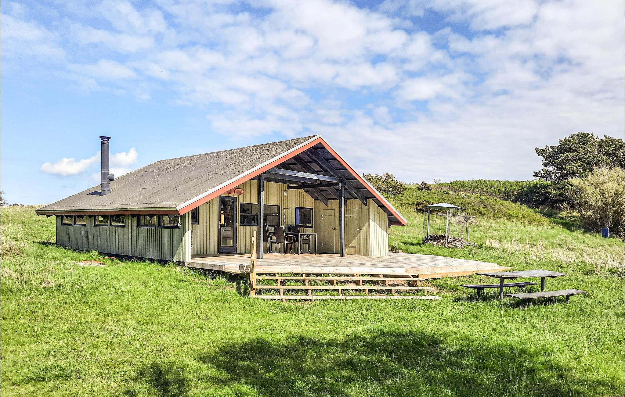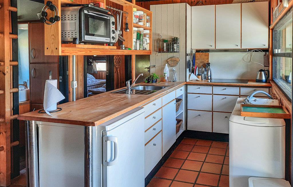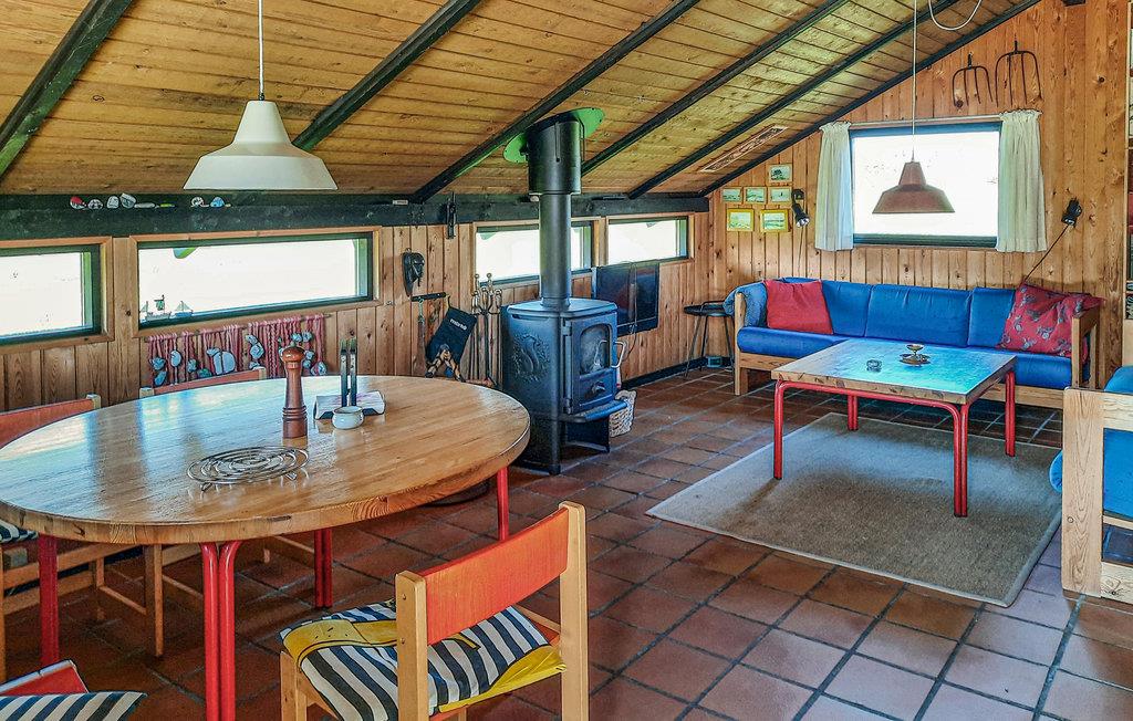 Dette smukke feriehus inviterer op til 4 personer til en uforglemmelig ferie nær stranden året rundt. Træpanelerne i det indvendige og de skrånende lofter sikrer en helt særlig hygge inde i sommerhuset. I stuen kan I sidde behageligt sammen i sofaerne, mens der tilberedes et lækkert måltid i det åbne køkken.